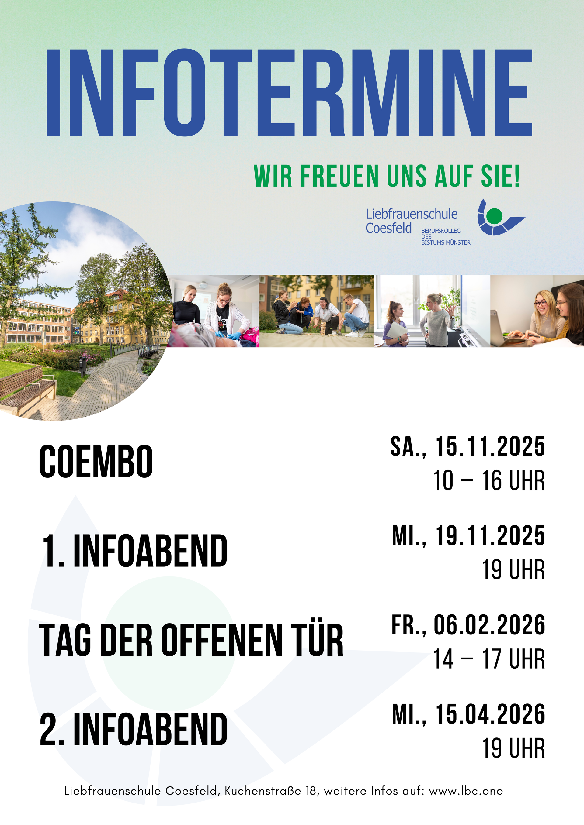 Willkommen! Schön, dass Sie hier sind!Auf diesen Seiten finden Sie, was uns antreibt und was wir für Sie tun können. Die Liebfrauenschule, Berufskolleg in Coesfeld, ist spezialisiert auf die Bereiche Sozial- und Gesundheitswesen