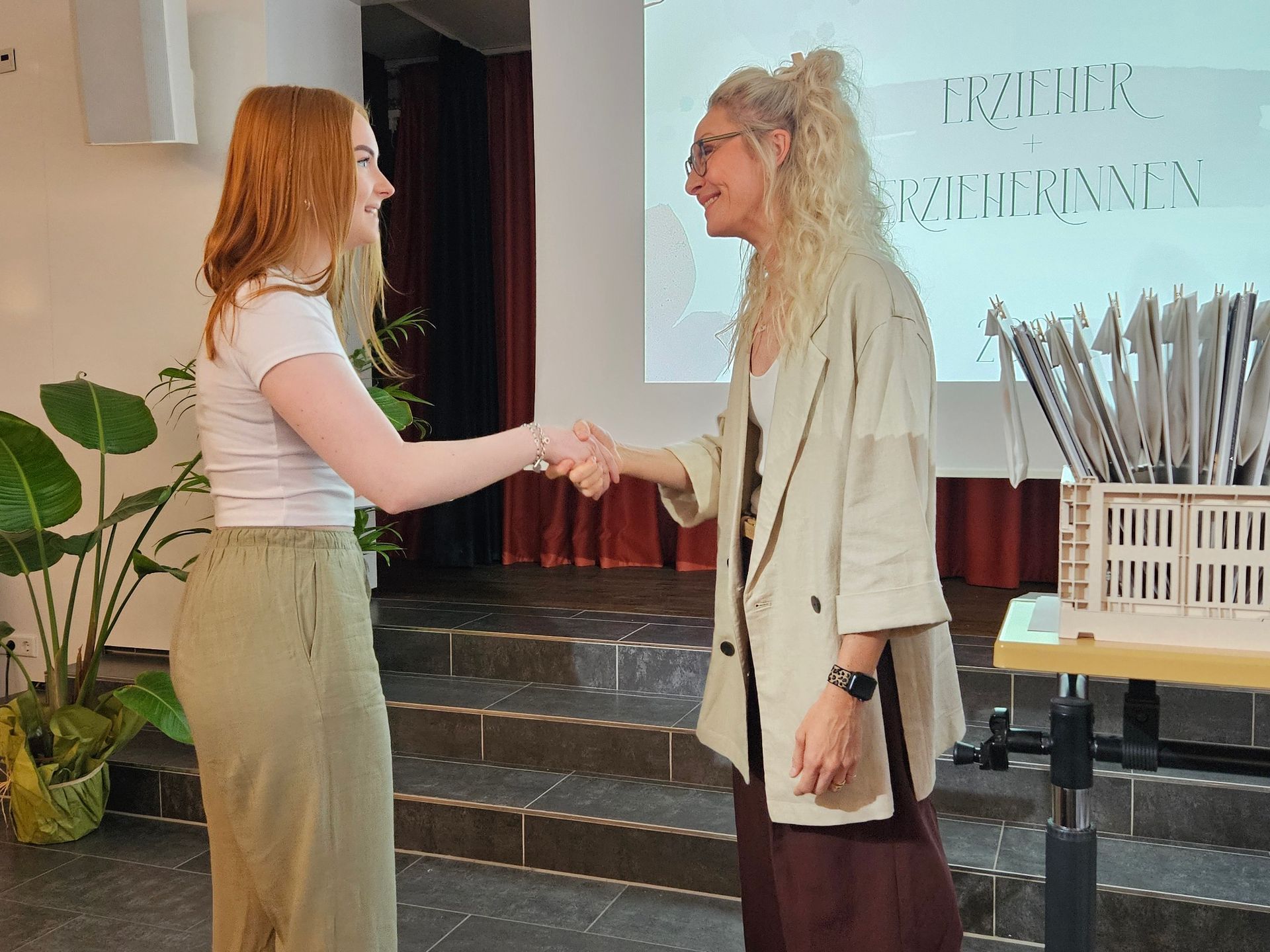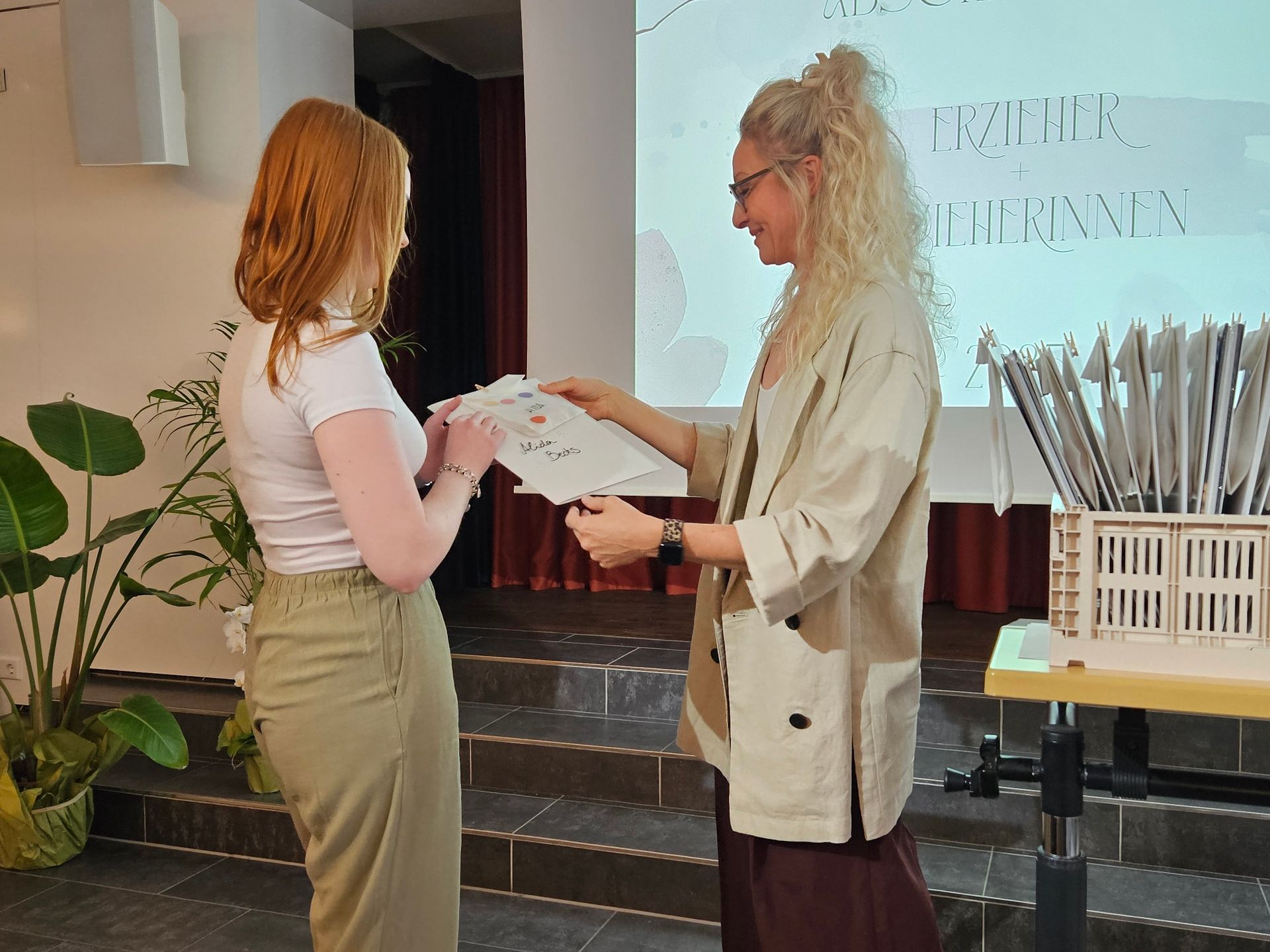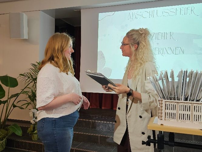 Frau Kahn und Frau Fischer betonten in ihrer gemeinsamen Rede die Entwicklung, die die Studierenden in ihrer Ausbildung gemacht hätten und gingen auf auf verschiedene Herausforderungen ein, die gemeinsam gemeistert worden wären. Die Klassen wären ihnen durch diese intensive Betreuung sehr ans Herz gewachsen.