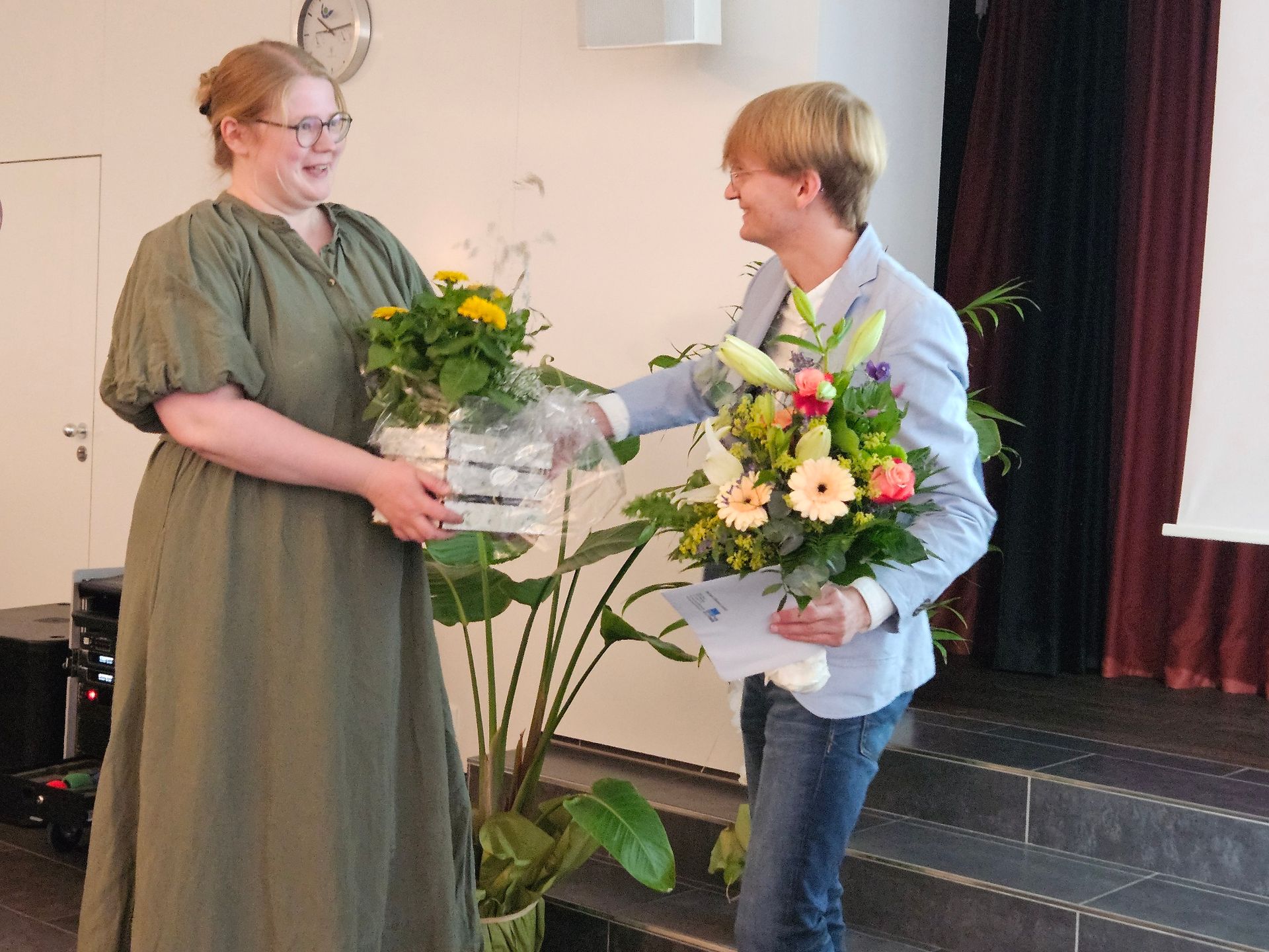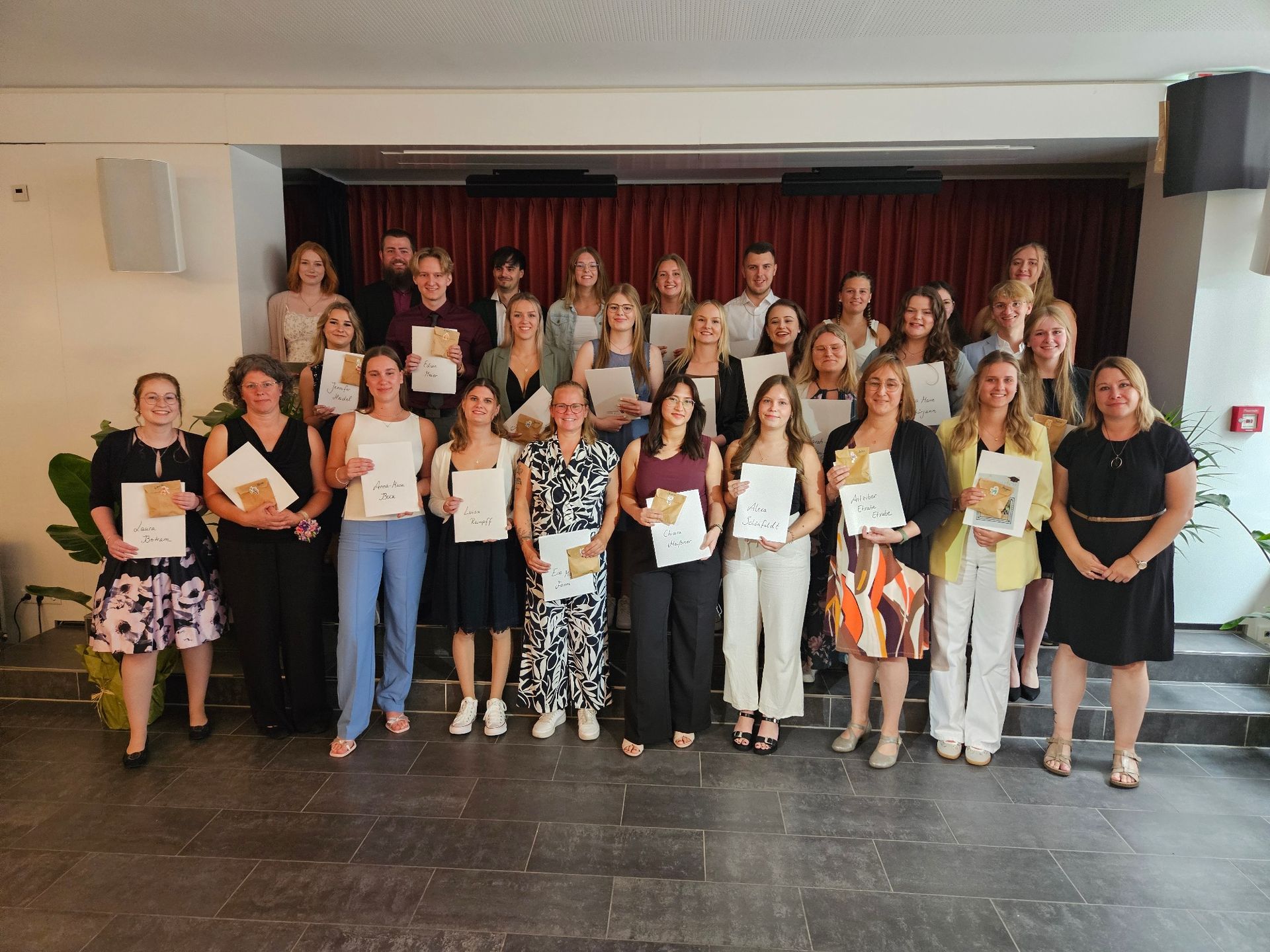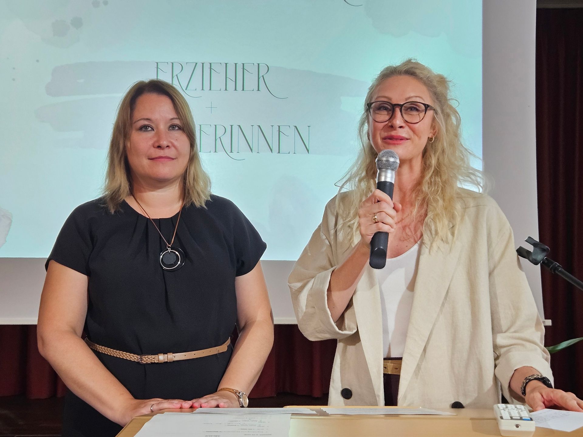 Frau Kahn und Frau Fischer betonten in ihrer gemeinsamen Rede die Entwicklung, die die Studierenden in ihrer Ausbildung gemacht hätten und gingen auf auf verschiedene Herausforderungen ein, die gemeinsam gemeistert worden wären. Die Klassen wären ihnen durch diese intensive Betreuung sehr ans Herz gewachsen.