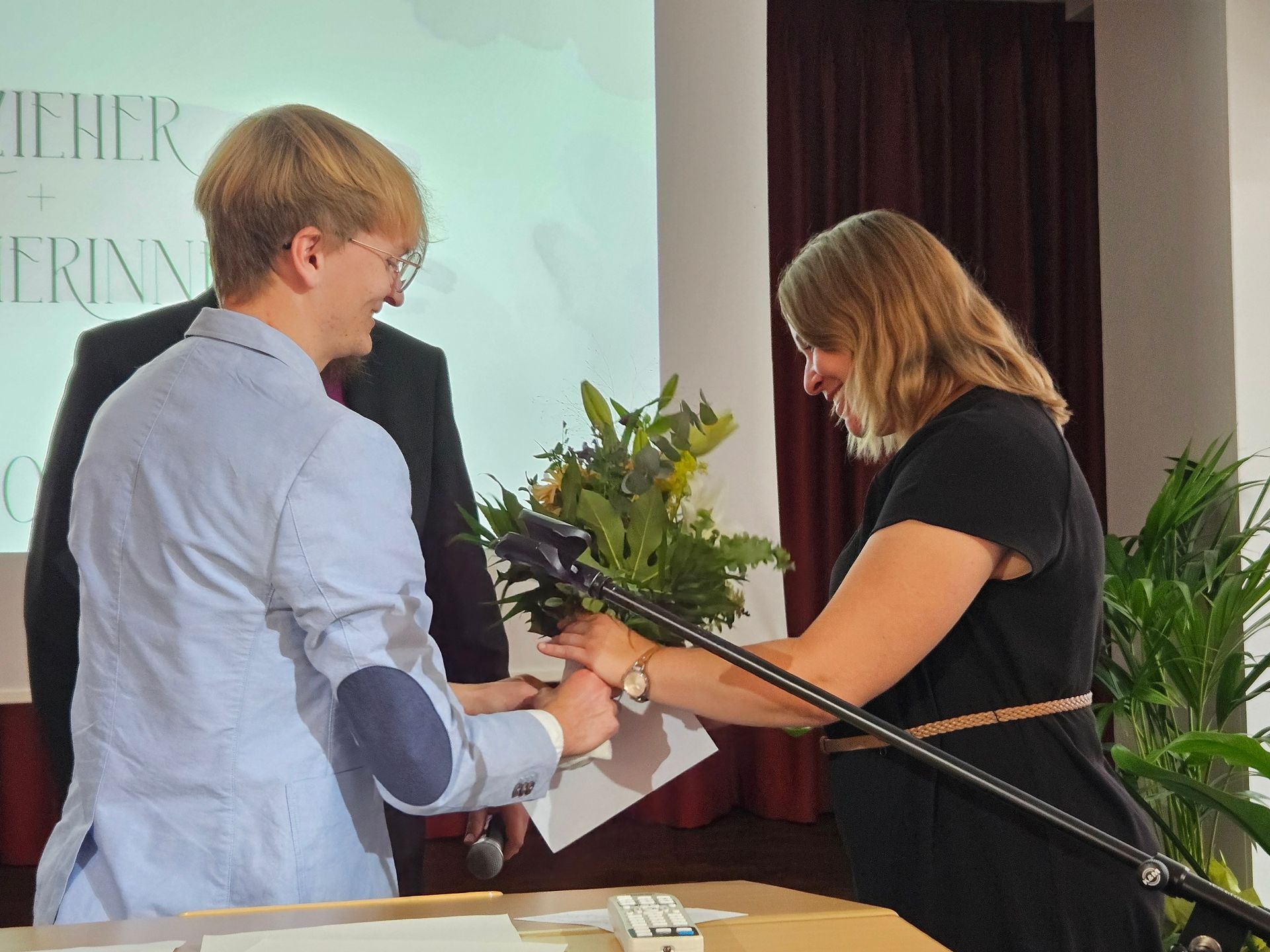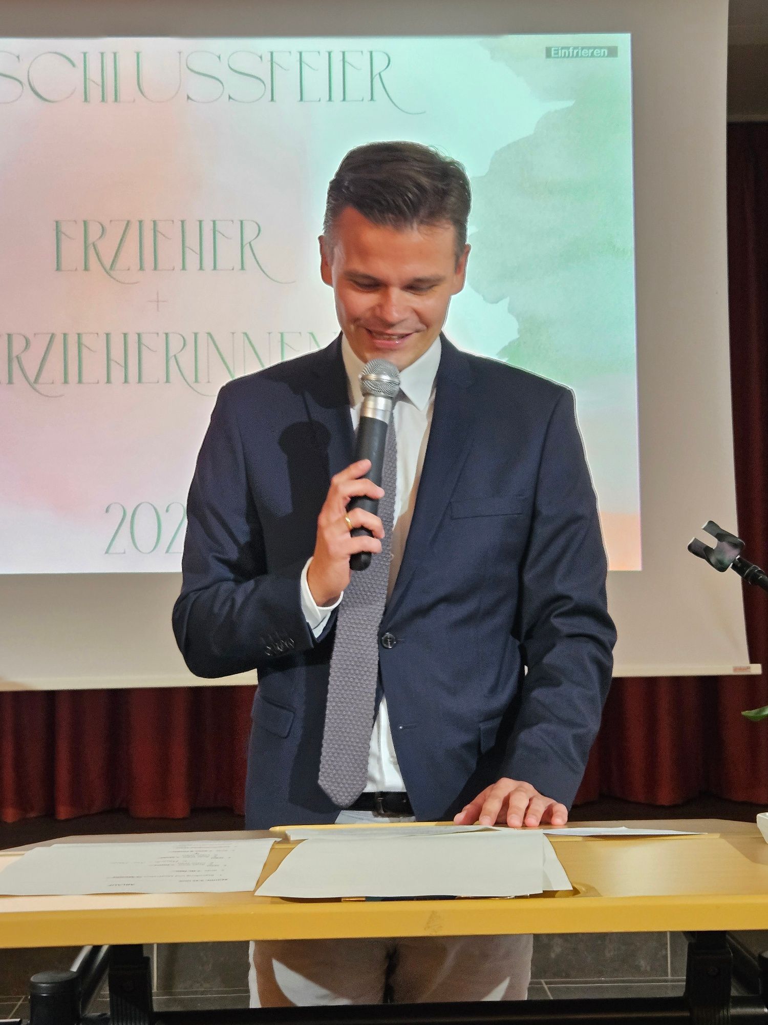 Als Vertreter der Schulleitung betonte Herr Hüls in seiner Rede die Wichtigkeit des Berufs der Erzieher:in. In diesem Beruf ging es nicht darum, die Kinder zu "beschäftigen", sondern sie beim Wachsen zu begleiten. Die Studierenden wären in ihrer Zeit an der Liebfrauenschule auch gewachsen und hätten nun die nötige Fachkompetenz, um adäquat auf die Bedürfnisse von Kindern einzugehen und dadurch einen wichtigen Beitrag für die Gesellschaft zu leisten.