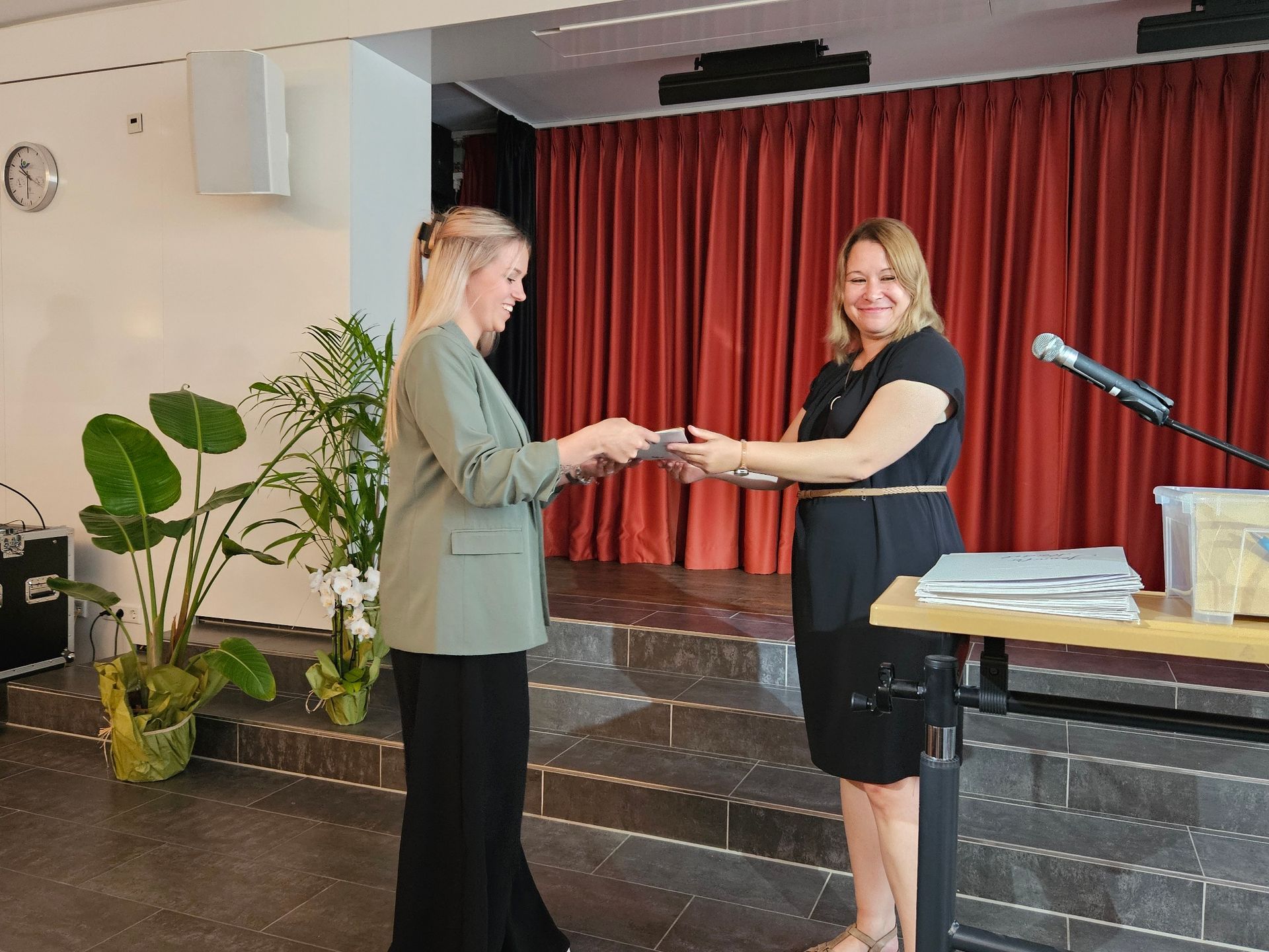 Frau Drüiing (im Bild oben) als ehemalige Klassenlehrerin, der SPBOa und Frau Kahn, die die ehemals zwei Klassen bis zum Examen als Klassenlehrerin betreute, bekamen als Dank für ihre Arbeit Geschenke überreicht.