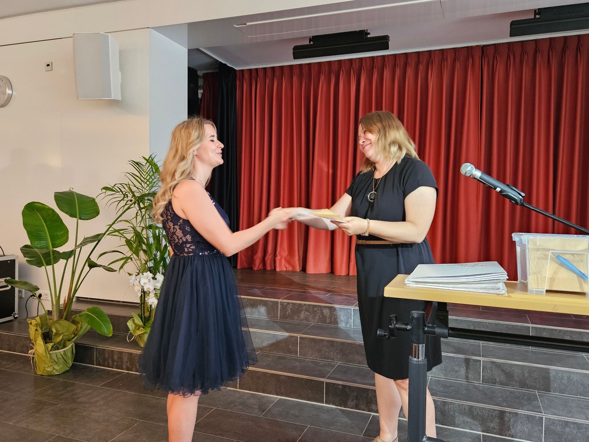 Emina Zumberi als Vertreterin der SPSO ging in Ihrer Rede auf die Erfahrungen der letzten zwei Jahre ein. Die Klasse wäre als eine echte Gemeinschaft zusammengewachsen und hätte die theoretischen Anforderungen dieser anspruchsvollen Ausbildung mit einigen Höhen und Tiefen, aber insgesamt erfolgreich gemeistert. Sie betonte dabei explizit die Rolle ihrer Klassenlehrerin Frau Fischer, die stets auf Augenhöhe und bei allen Problemen, ob beruflich oder privat, hilfreich zur Seite gestanden hätte.