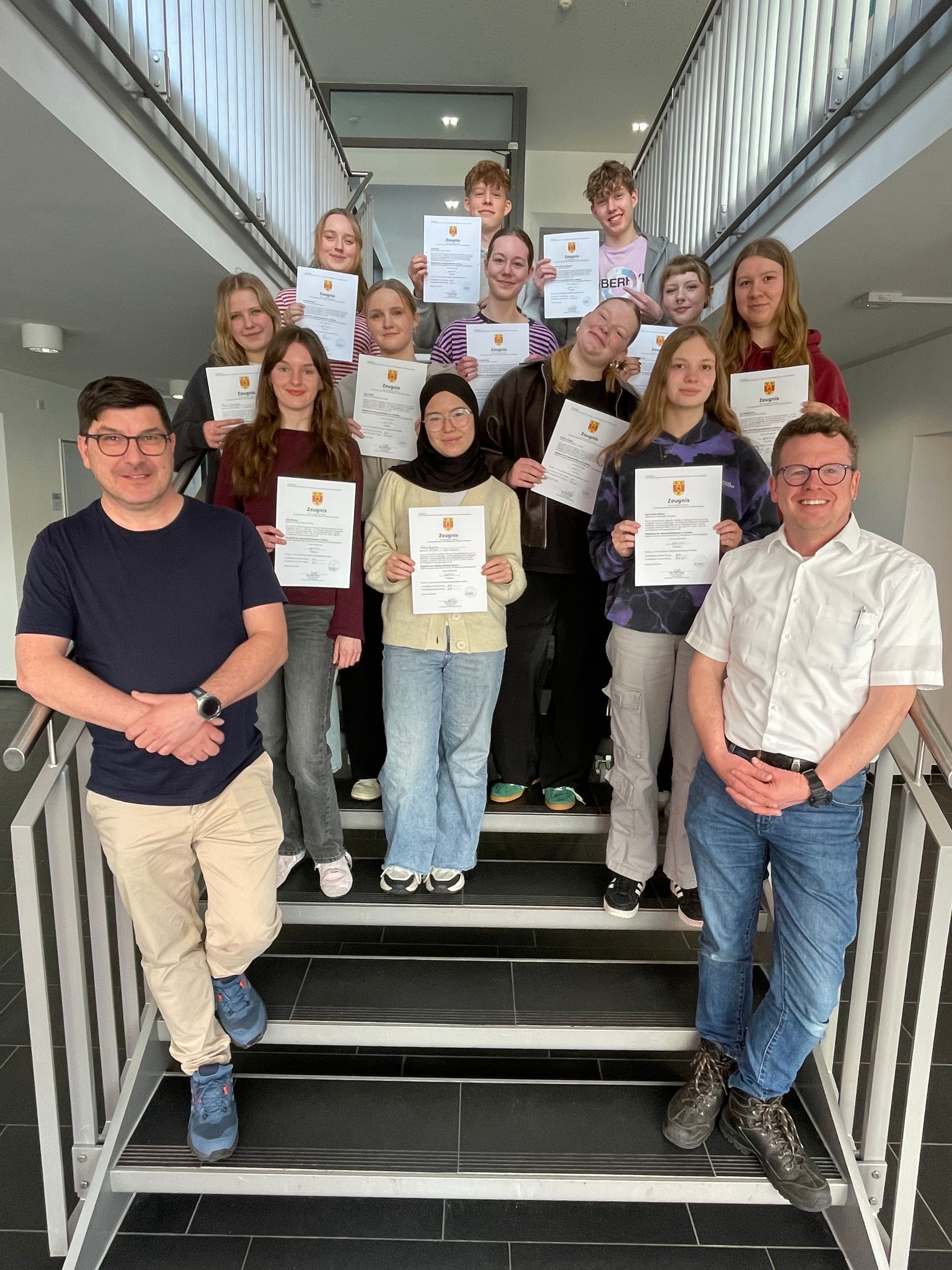 Im Anschluss daran folgte eine Rede der Schülerinnen Dana Vogelsang und Paula Höltken, die humorvoll die letzten drei Jahre an der Schule Revue passieren ließen und sich beide einige waren, dass die Zeit viel zu schnell verging. Sie bedankten sich bei ihren Mitschüler*innen, den unterrichtenden Lehrer*innen und vor allem bei ihren Klassenlehrerinnen Frau Ademmer und Frau Bur am Orde/Frau Kiepe.