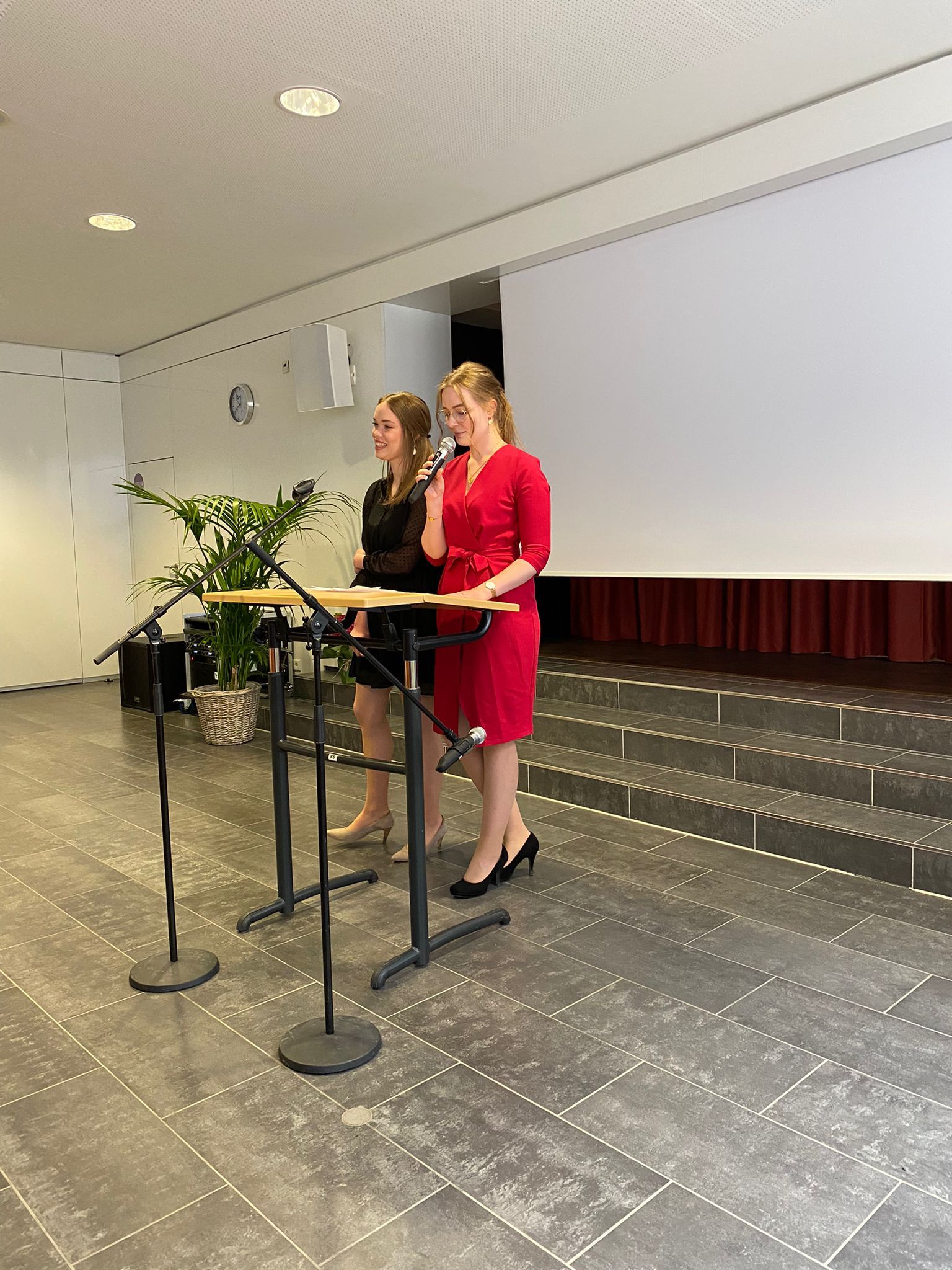 Im Anschluss an die Rede des Bildungsgangkoordinatoren folgte eine Ansprache der Klassensprecherinnen. Diese rekapitulierten die in Zeiten von Corona teilweise „vielfältigen“ Möglichkeiten am (Online)Unterricht teilzunehmen. Sie dankten vor allen den Kollegen und allen Lehrern, die sie während dieser Zeit begleitet und unterstützt haben. Und letztendlich dankten sie auch allen Absolventen und Absolventinnen des Jahrgangs und betonten, dass gerade die Pandemie alle fest zusammengeschweißt hätte. Es folgte eine kurze Diashow, die Fotos der letzten beiden Jahre zeigte.