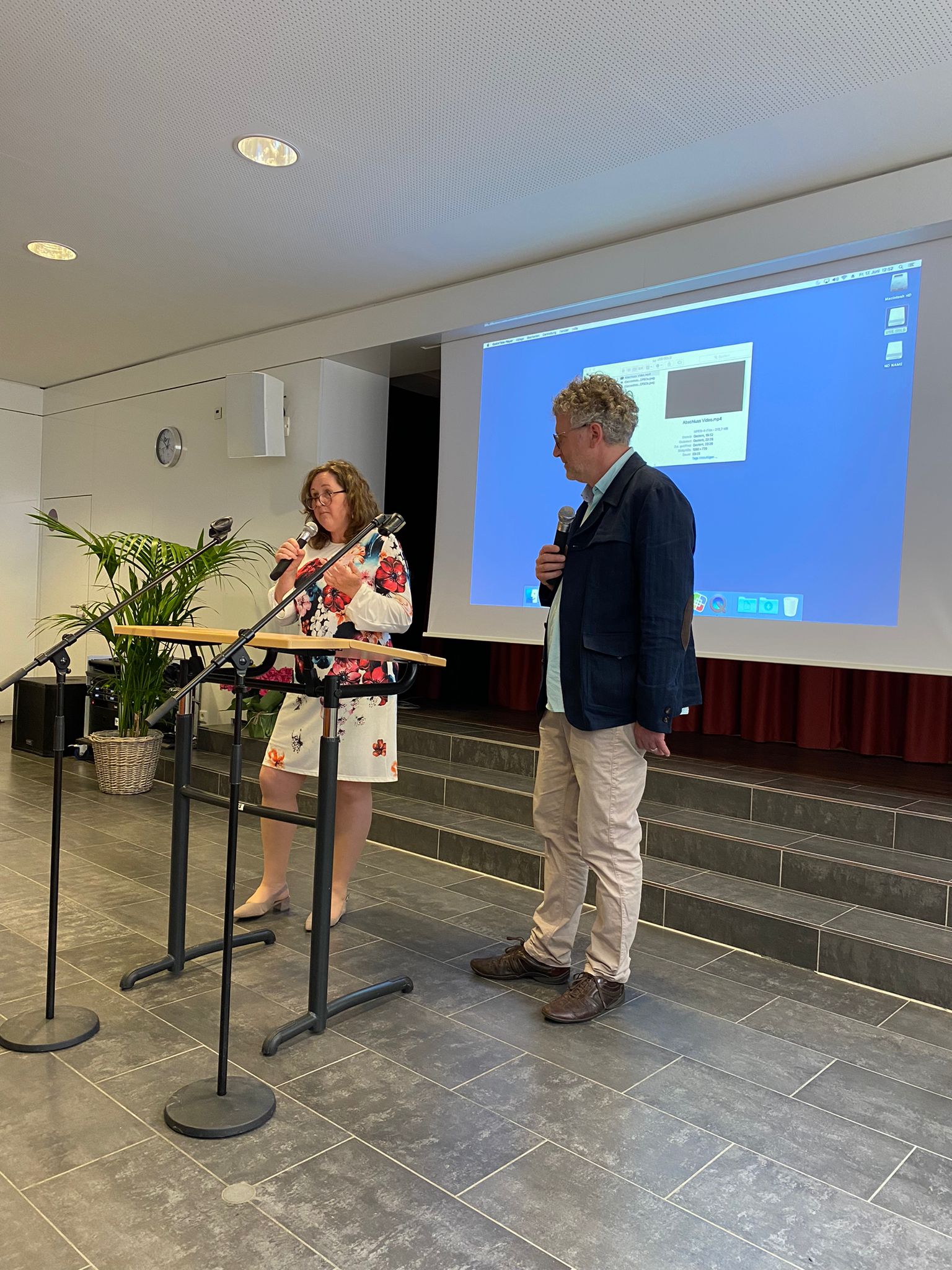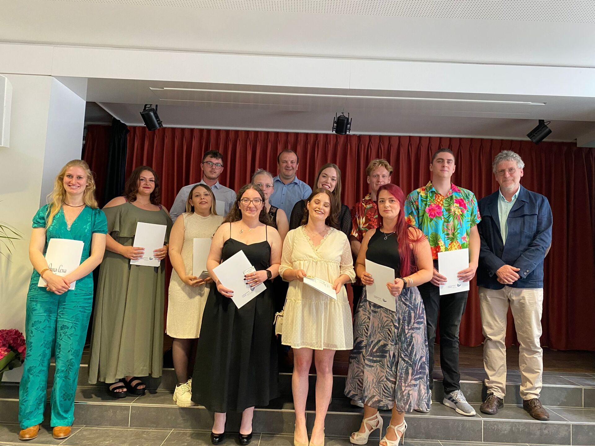 Zum Abschluss ergriffen die beiden Klassenlehrer Daniela Grünhagen und Matthias Kemper das Wort und diese beglückwünschten die beiden Klassen erst einmal herzlich: „Nach drei aufregenden, wunderbaren und gebeutelten Jahren stehen wir hier und Sie haben es geschafft!“ Sie blickten zurück auf eine Zeit mit Schnelltests, Einbahnstraßensystemen in der Schule und zahlreiche Videokonferenzen – teilweise waren nicht nur die Schüler, sondern auch die Schule auf der Suche nach dem Internet. Sie dankten beiden Klassen für die tolle Zeit und hoffen auf ein Wiedersehen in den Pflegeeinrichtungen.