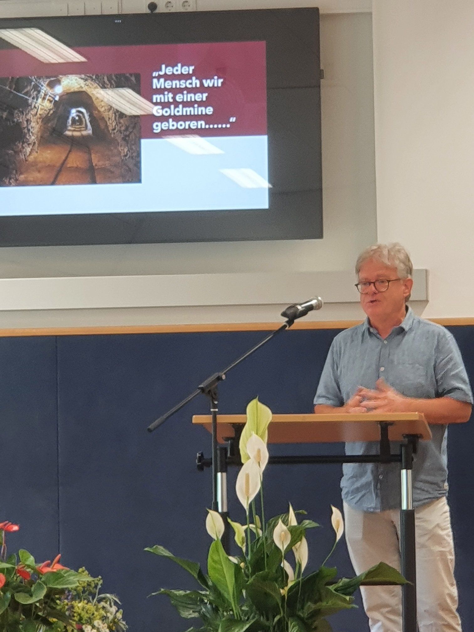 Herr Bunk stellte nach der Rede von Herrn Plaßmann das Motto der Entlassfeier vor: "Jeder Mensch wird mit einer Goldmine geboren". Dieses Zitat der Heilpädagogin und MarteMeo-Supervisorin Sabine Ahler-Bone war den Abolvent*innen aus einer Veranstaltung in ihrer Schulzeit sehr bekannt. Dem