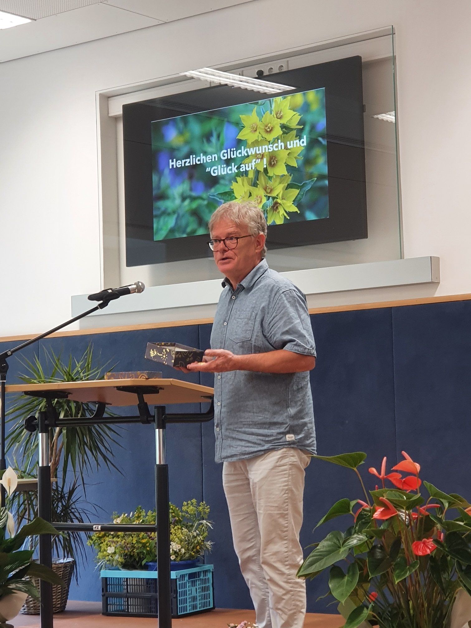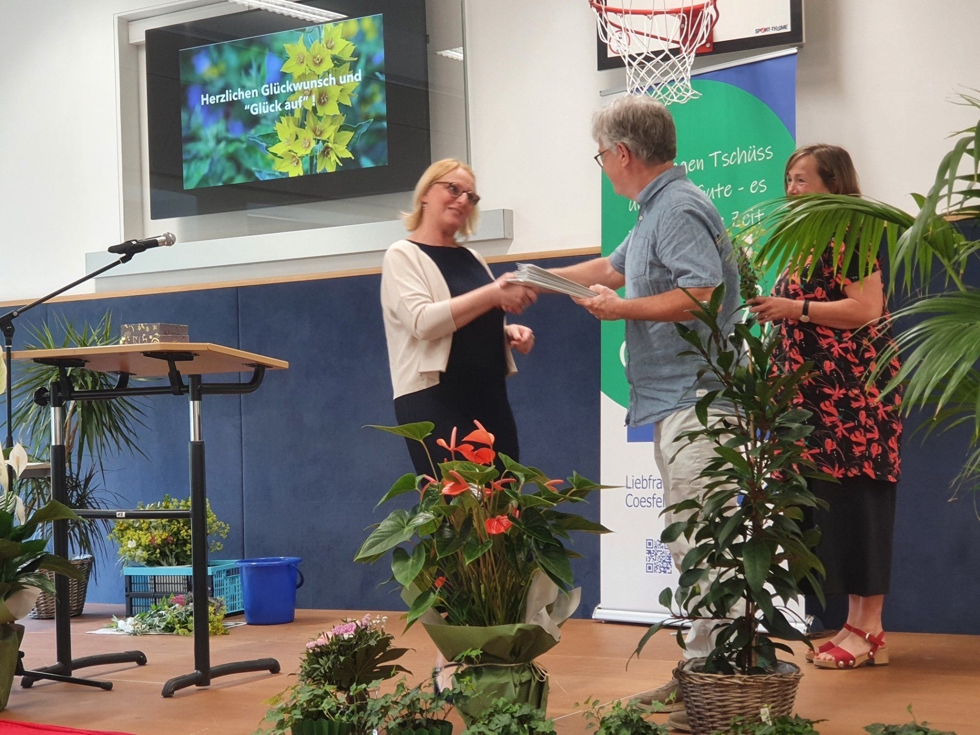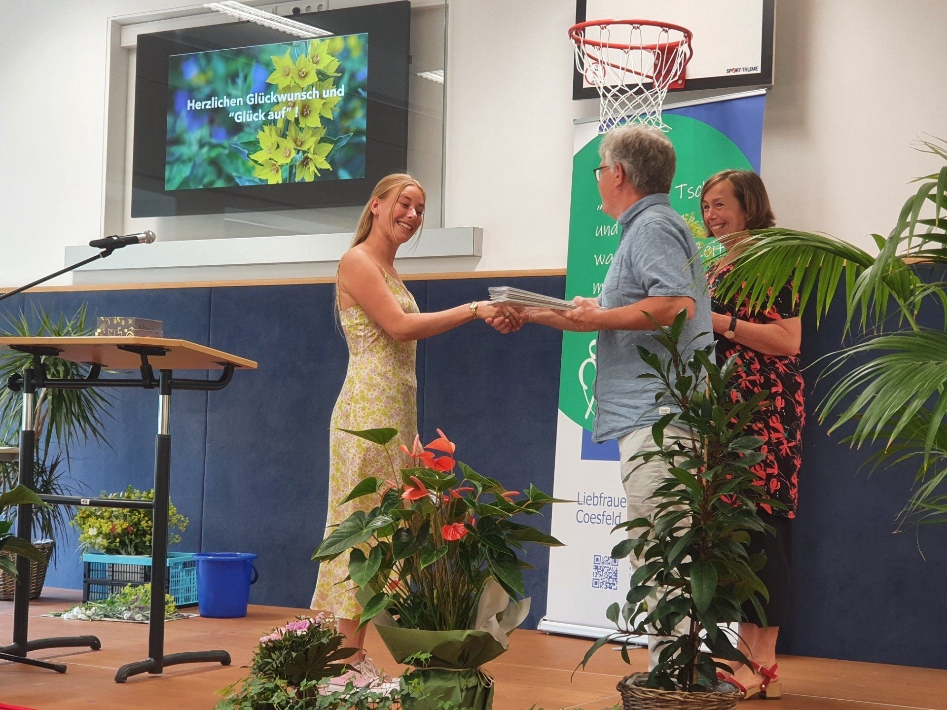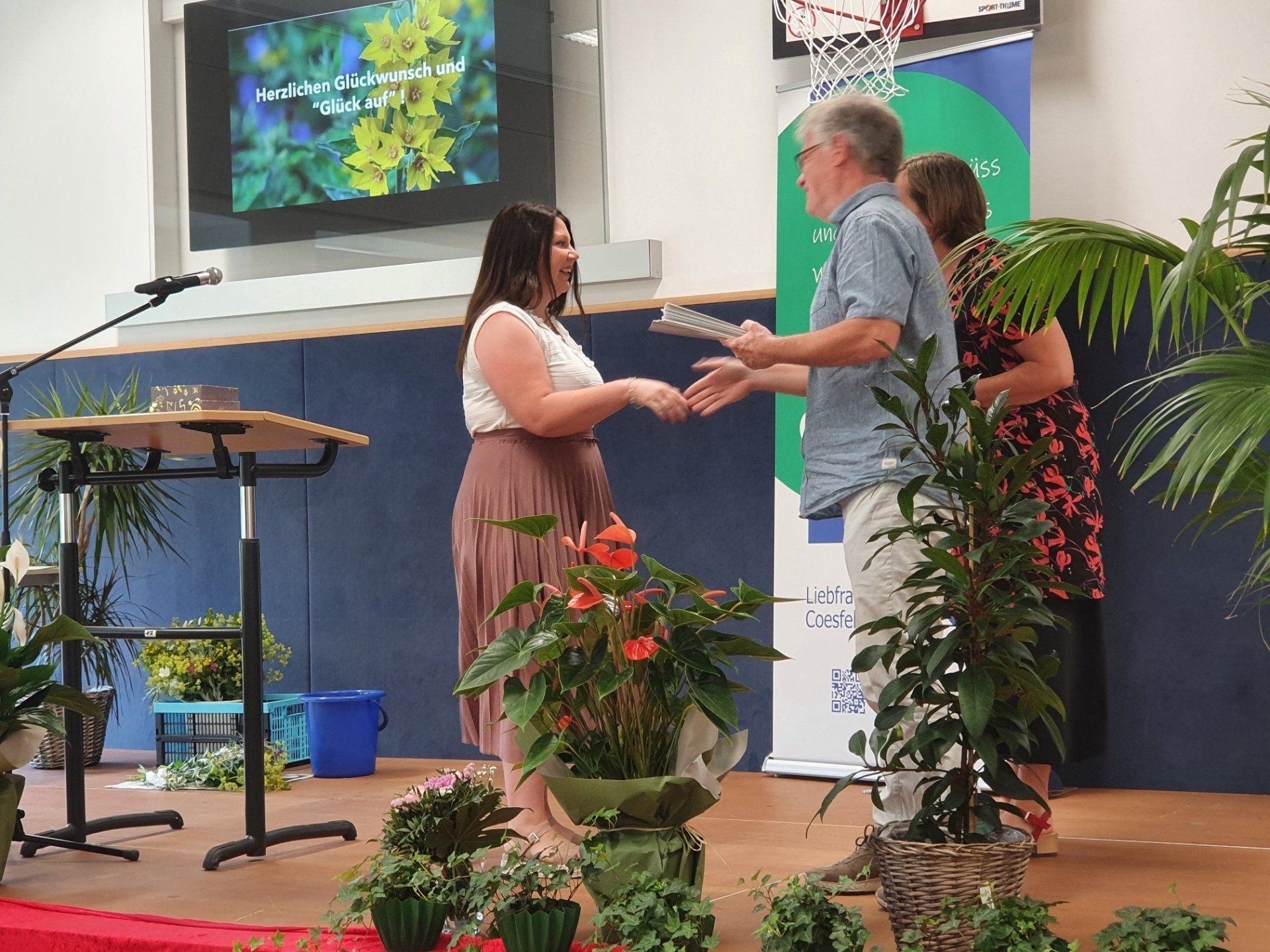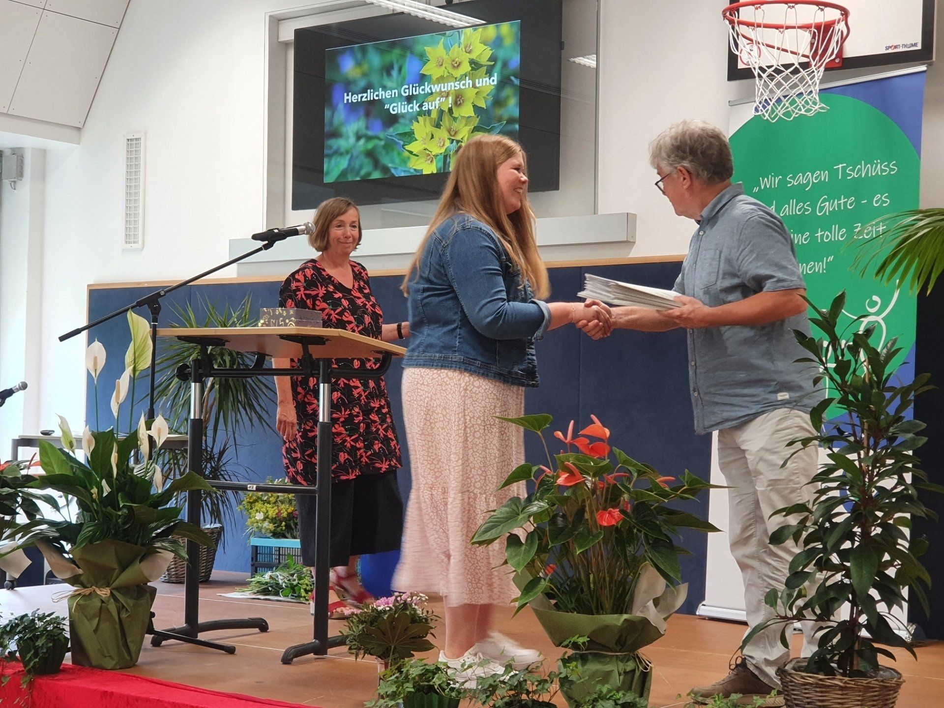Herr Bunk setzte das Bild einer Goldmine fort und wünschte den Absolvent*innen"Glück auf!" auf dem weiteren Lebensweg. Zweige des Goldfelberichs und Schokoladenherzen in Goldpapier wurden den Absolvent*innen zusammen mit den Zeugnissen von Frau Maxa und Herrn Bunk überreicht und rundeten die gelungene Verabschiedung ab.