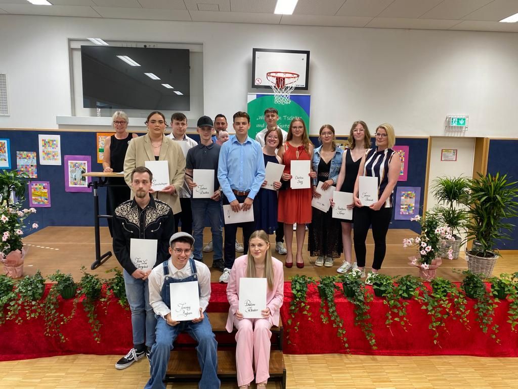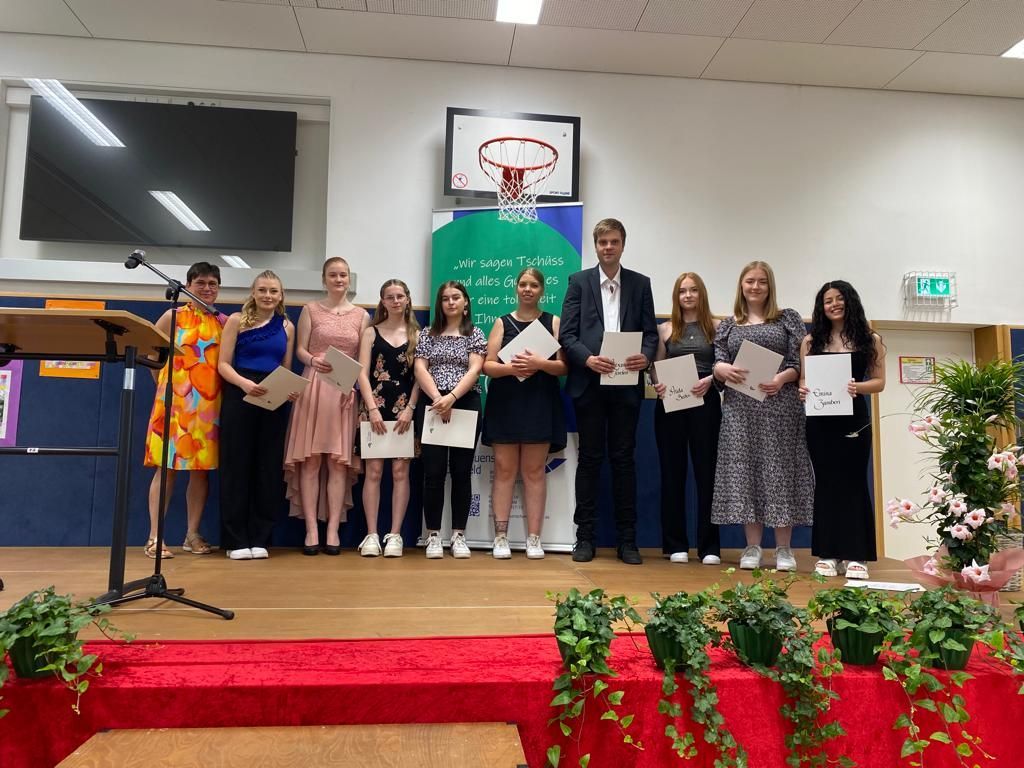 Am Ende der Veranstaltung erhielten beide Klassen die Abschlusszeugnisse, bevor bei strahlendem Sonnenschein im Innenhof ein Sektempfang angeboten wurde.