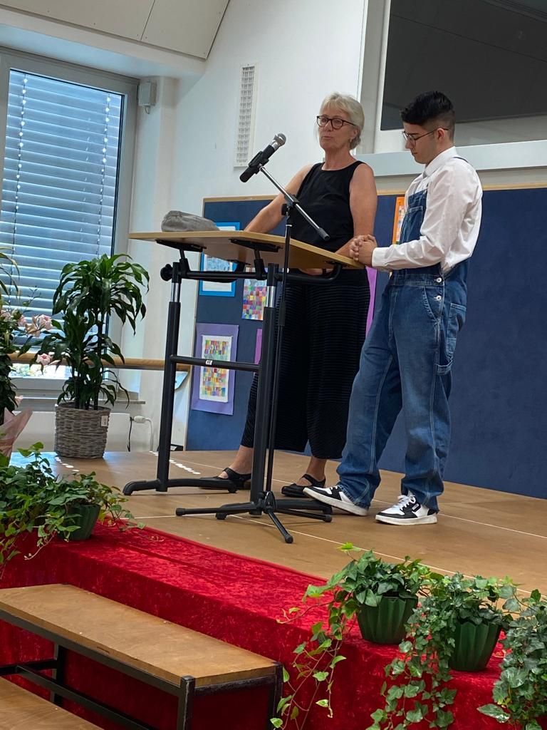 Die letzte Rede vor der Zeugnisvergabe hielten Frau Müller-Laackman (Klassenlehrerin der Sz O) und einer ihrer Schüler, Jeremy Byloos. Dieser strukturiert seine Rede nach Vorgaben von Wikipedia und wurde zwischendurch von seiner Klassenlehrerin humorvoll unterbrochen und jovial mit Tipps unterstützt.