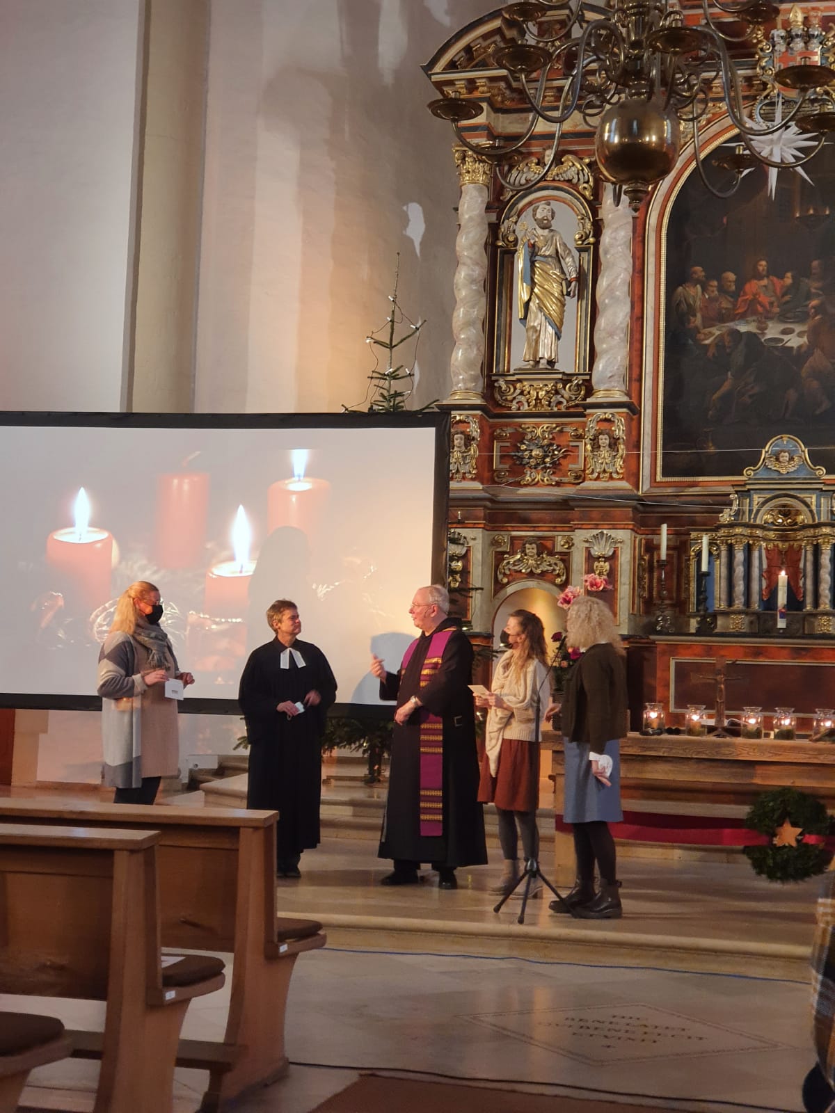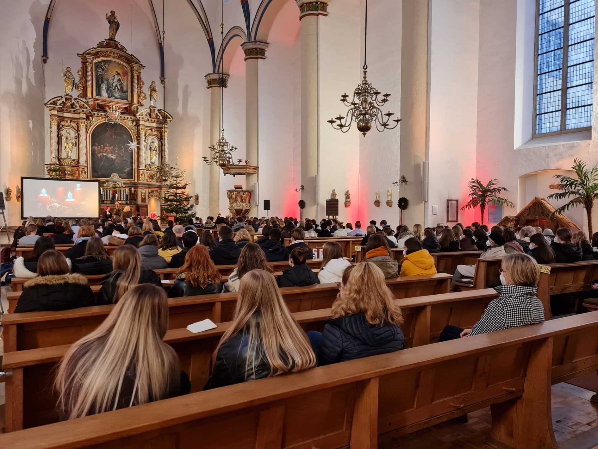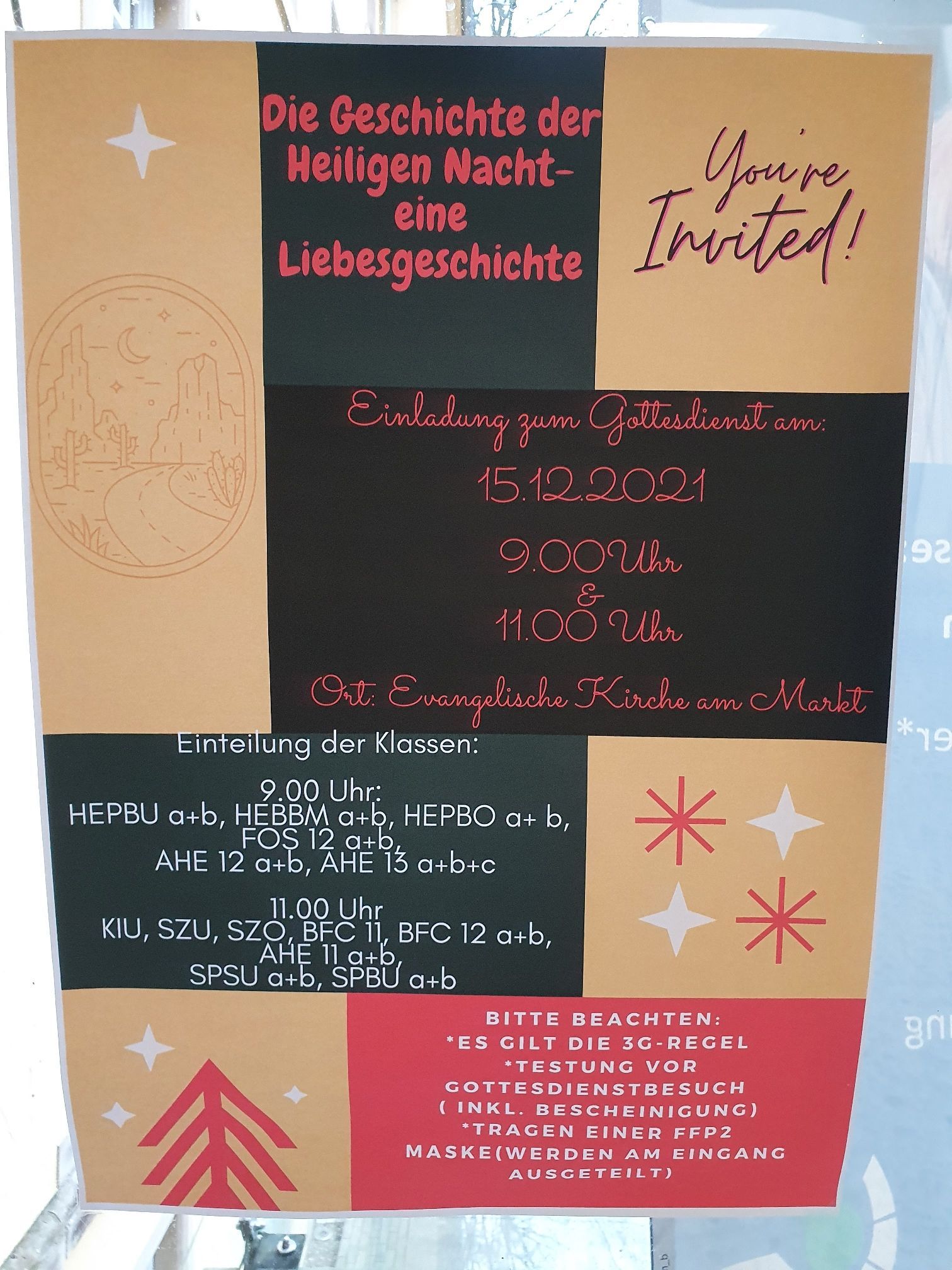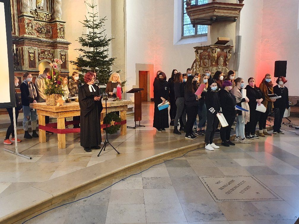 Schüler*innen der BFC und der AHE 11 hatten in diesem Jahr im Adventsgottesdienst einen Film „den Anfang der Weihnachtsgeschichte“ aus dem Lukasevangelium, „die Herbergssuche“, nachgestellt und eine Deutung aus heutiger Sicht vorgenommen.