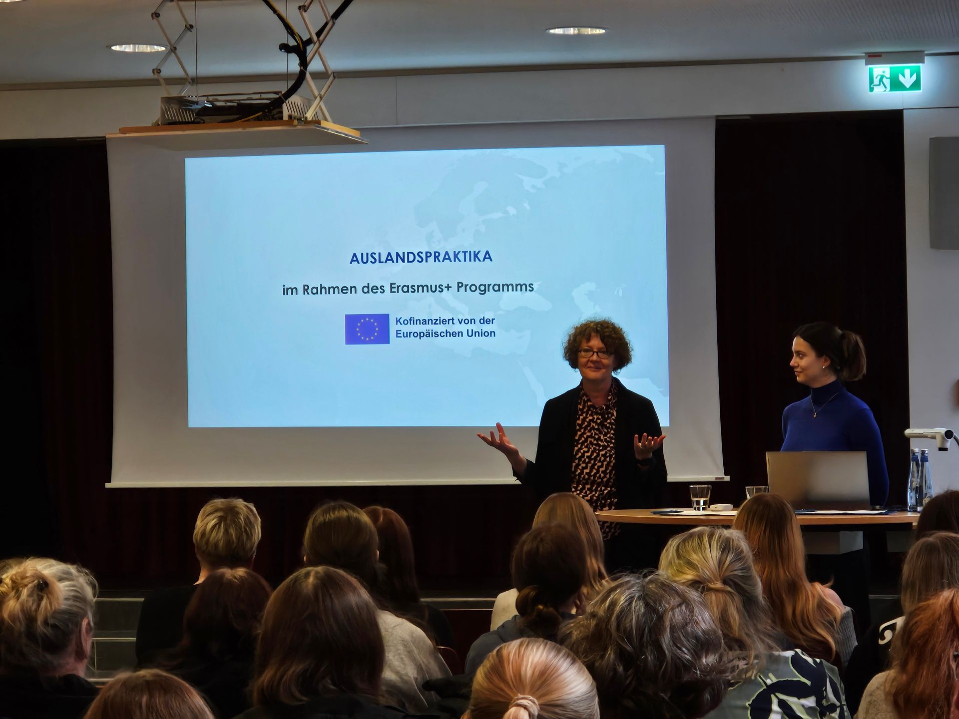 Zahlreiche Schülerinnen und Schüler nutzten am Dienstagnachmittag in der Aula die Gelegenheit, sich über die vielfältigen Möglichkeiten zu informieren, die das europäische Austauschprogramm Erasmus+ für Auslandsaufenthalte und Praktika in europäischen Ländern bietet. Als Kooperationspartner unserer Schule stellte sich die Organisation „dreieins“ aus Berlin vor, vertreten durch Katharina Krause und Louisa Schmücker. Beide gaben einen ausführlichen Einblick in die Ziele, Strukturen und Abläufe des Erasmus-Programms. Emma Verbeet aus der AHE 12 berichtete im Anschluss von ihren Erfahrungen während des Praktikums in einer Kita auf Malta in der AHE 11. Für 2026 sind Praktika für die Klassen AHG 11 und AHE 11 (jeweils drei Wochen vor den Sommerferien) sowie für die BFC 11 (vier Wochen vor den Osterferien) geplant. Darüber hinaus können nach dem Schulabschluss auch Absolventinnen und Absolventen der AHE 13, BFC 12, FOS 12, Ki-O, Sz-O und SP-S-O an Erasmus-Plus-Projekten teilnehmen. Die möglichen Ziele der Auslandsaufenthalte sind vielfältig: Unter anderem stehen Dänemark, Schweden, Lettland, Litauen, Estland, Spanien, Portugal, Italien, Österreich oder Malta für 2026 zur Auswahl. Möglich sind Praktika im pädagogischen oder gesundheitlichen Bereich, zum Beispiel im Krankenhaus, in der Kita oder Grundschule, in der OGS. Durch diese praktischen Erfahrungen sollen die Schülerinnen und Schüler nicht nur berufliche Kompetenzen erwerben und erweitern, sondern auch interkulturelle Erfahrungen sammeln. Die Veranstaltung bot einen umfassenden Überblick über die Chancen, die das Programm Erasmus+ jungen Menschen eröffnet und machte deutlich, wie wertvoll internationale Erfahrungen für die persönliche und berufliche Entwicklung sind.