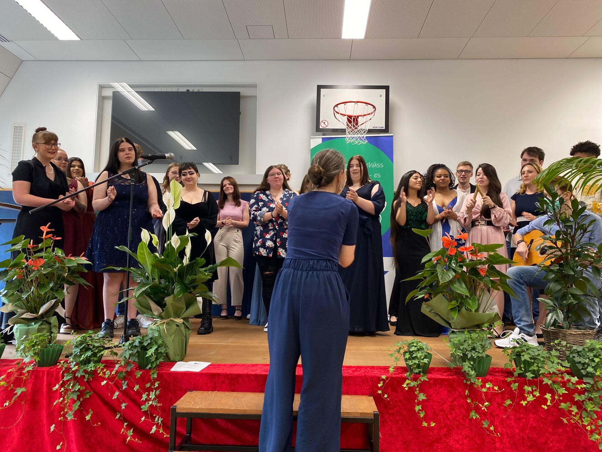 Im Anschluss an die Rede des Schulleiters folgte ein Musikbeitrag der SZO, die mit ihrer Musiklehrerin Frau Schleuter das Lied „Rock my Soul“ einstudiert und teilweise auch umgedichtet hatte.