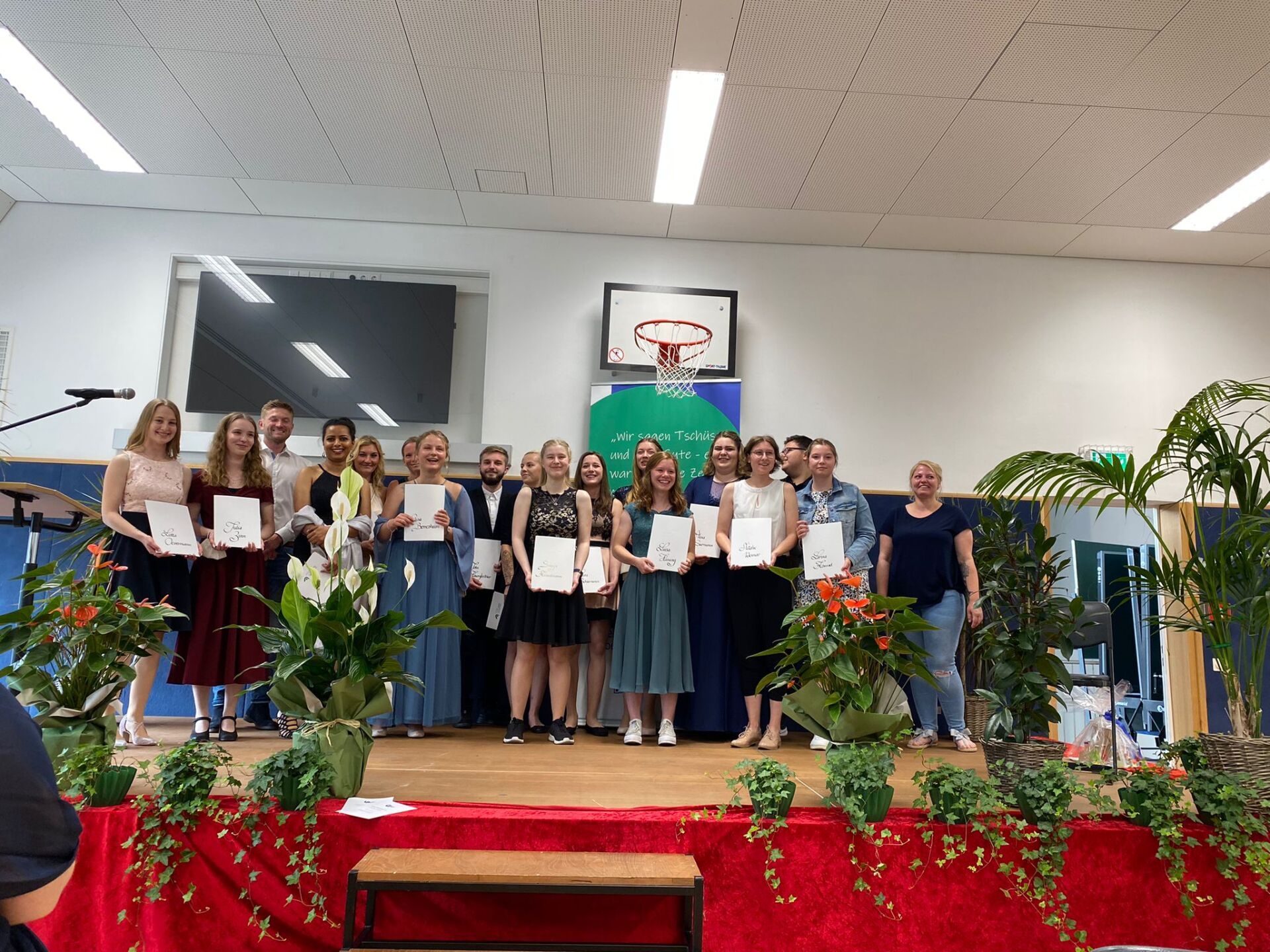 Bei (noch) sehr moderaten Außentemperaturen trafen sich am Freitag, 17.06.2022, in der Turnhalle der Liebfrauenschule die Absolventinnen und Absolventen der Bildungsgänge staatlich geprüften Kinderpfleger/Kinderpflegerinnen und Sozialassistenten/Sozialassistentinnen, um ihre Abschlusszeugnisse entgegen zu nehmen.
