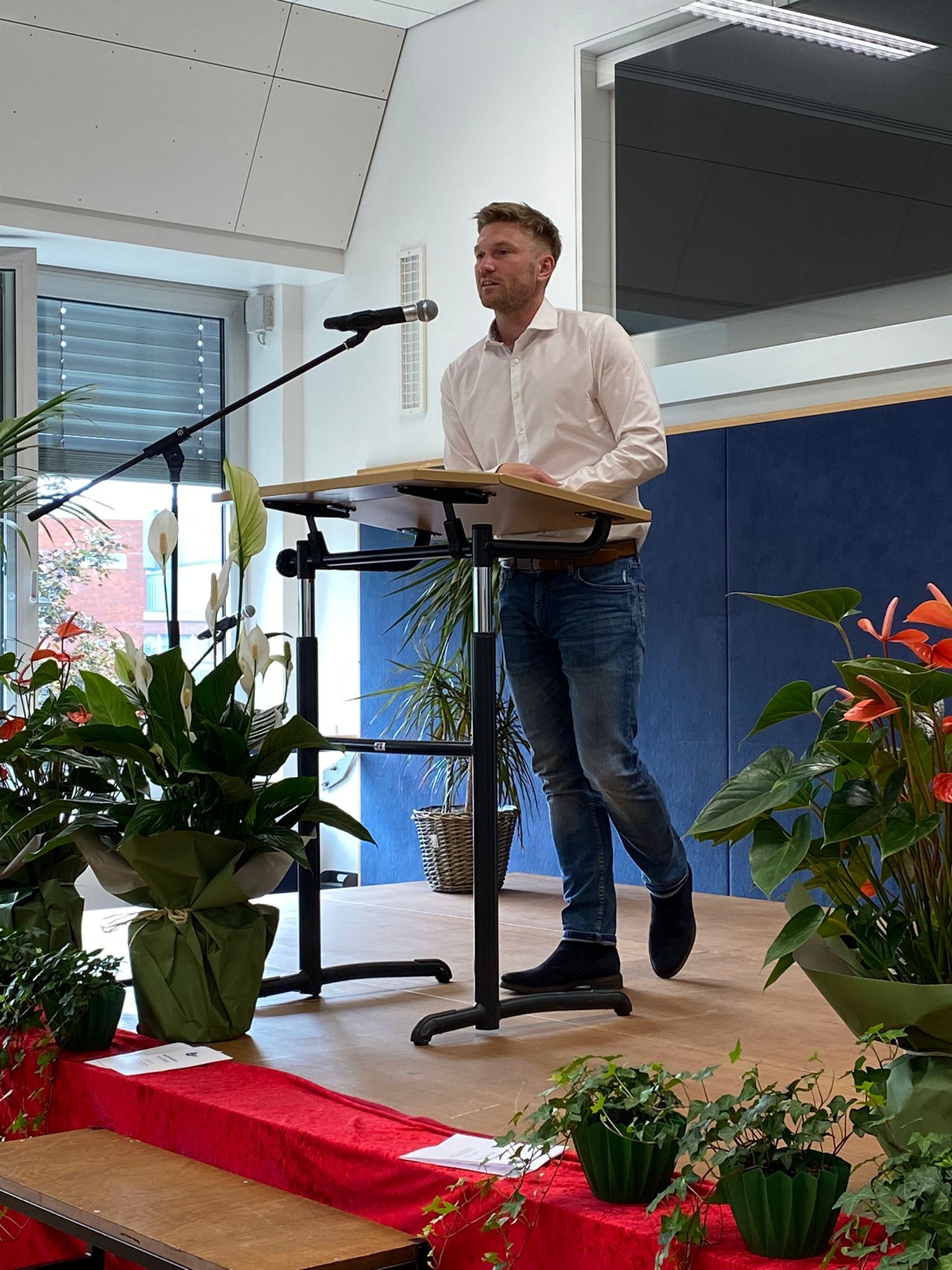 Nach einer sehr einzigartigen Begrüßung durch die Bildungsgangvorsitzende (und auch Klassenlehrerin der SZO) Vera Meintgens begrüßte der Schulleiter Herr Plaßmann alle anwesenden Gäste. In seiner Rede beschrieb der Schulleiter die letzten zwei Jahre als sehr ereignisreich. Er äußerte die stille Hoffnung, dass die Schulzeit der Absolventinnen und Absolventen nicht nur durch die Pandemie, die sowohl schulisch, aber auch privat sehr viele Einschränkungen mitgebracht hatte, geprägt worden sei. Plaßmann rief die Anwesenden dazu auf, ihren Blick auf das Positive zu richten, welches sie in den letzten Jahren erreicht haben. Er dankte sowohl den Klassenlehrern als auch den Eltern, die er auch dafür beglückwünschte, dass ihre Sprösslinge jetzt auf eigenen Beinen stehen. Abschließend gab er den Absolventinnen und Absolventen noch einen wichtigen Rat mit: „Lachen Sie so oft Sie können.“