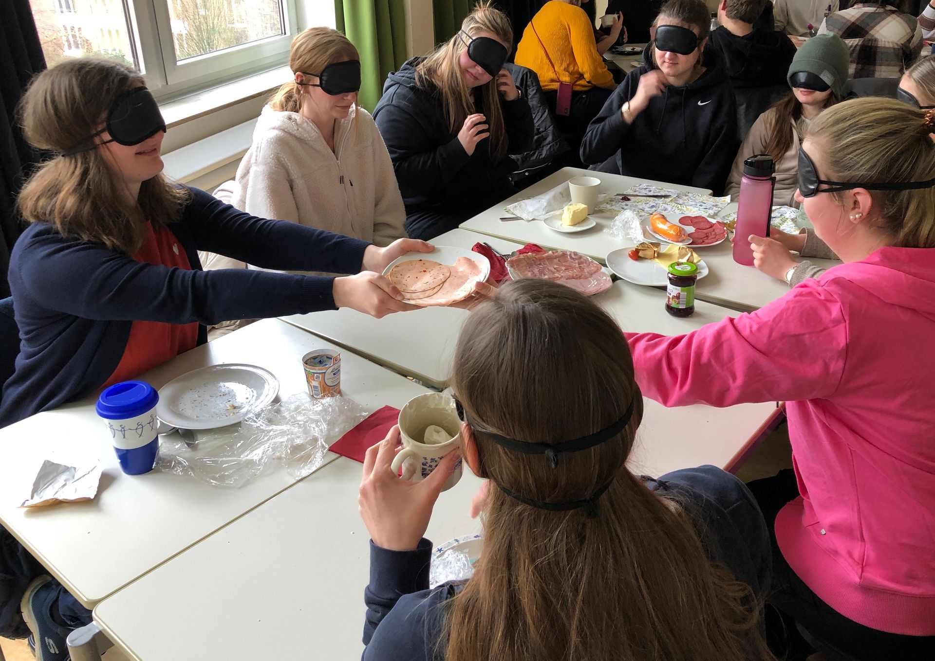 Übungen zur Selbsterfahrung und der Austausch mit den Studierenden im Zentrum der Veranstaltung: Wie ist es, blind (d.h. für die Studierenden mit verbundenen Augen) in einen Raum zu kommen und an einem gemeinsamen Frühstück teilzunehmen, ohne zu wissen, wie die Tische und Sitzplätze angeordnet sind und was sich wo auf den Tischen befindet? Auf Basis dieser gemeinsamen Erfahrung war im anschließenden Austausch schnell klar: