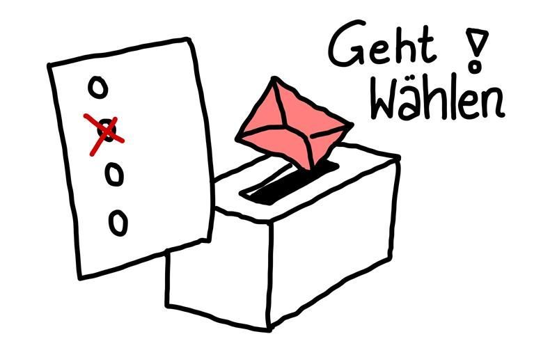 Die Relevanz der Stimmabgabe und die Möglichkeit dadurch aktiv an demokratischen Prozessen teilnehmen zu können hat die Klasse in dem oben stehenden Wahlaufruf graphisch umgesetzt.