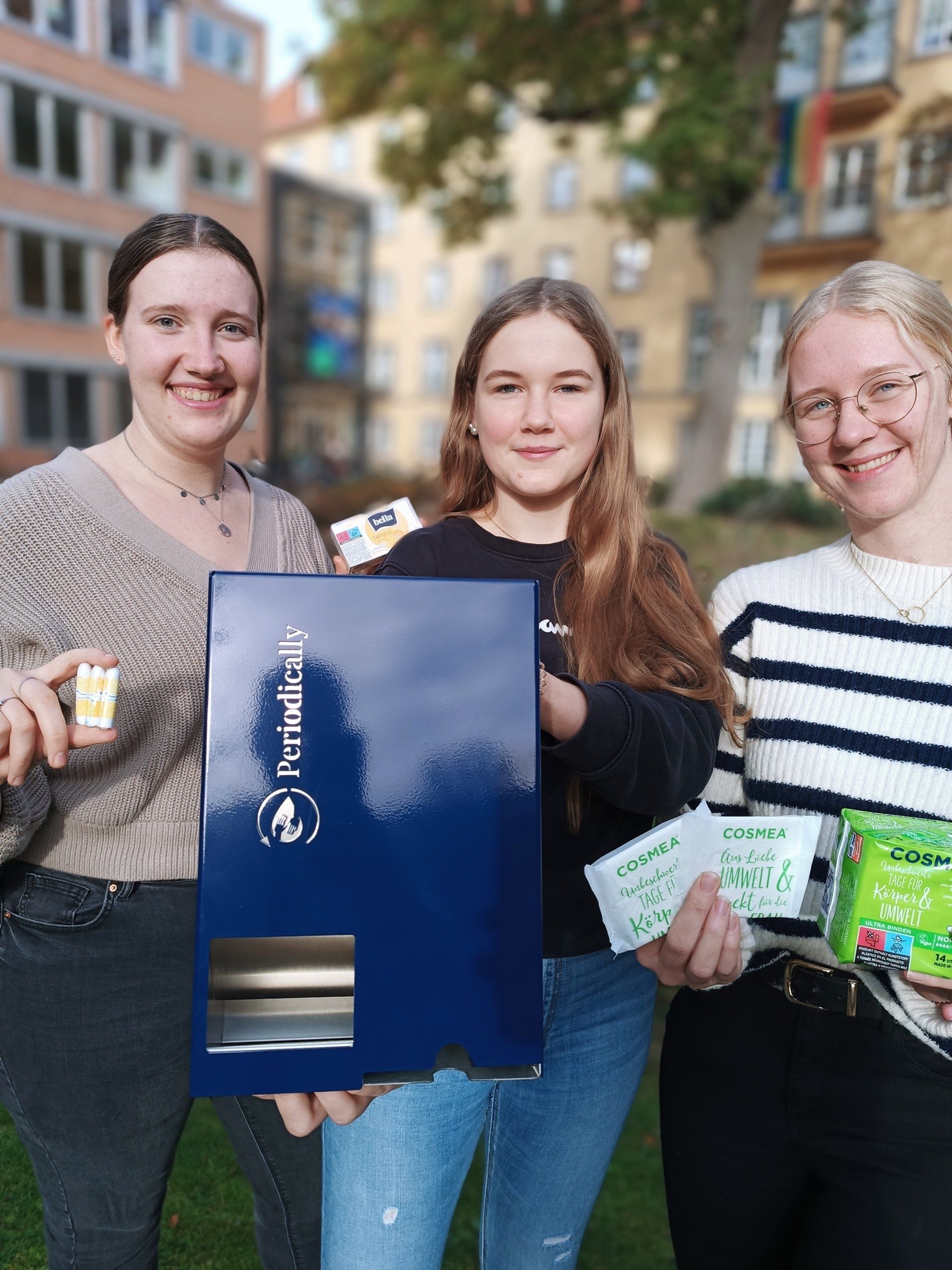 Mia, Jule und Chantal besuchen die Oberstufe der Fachoberschule und finden das ungerecht. Mia: „Unsere Periode haben wir uns nicht ausgesucht. Eigentlich ist es ungerecht, dass wir Frauen im Laufe unseres Lebens so viel Geld für Tampons und Co. investieren müssen.“ Lina, angehende Heilerziehungspflegerin, hält es in Zeiten von stark steigenden Lebenshaltungskosten für eine gute Idee, dass in den Toiletten der Liebfrauenschule nun kleine Automaten angebracht wurden, die kostenlos Binden und Tampons ausgeben: „Gerade auch vor dem Hintergrund, dass Schülerinnen, Studierende und Auszubildende ja häufig nur über ein geringes Budget verfügen.“