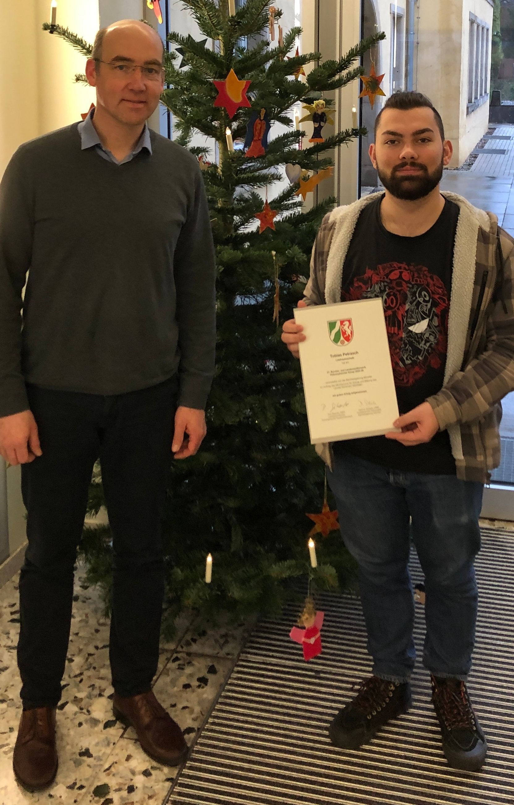 Tobias Petrasch (AHE 13b, Grundkurs Philosophie) hat am Bundes- und Landeswettbewerb Philosophischer Essay teilgenommen und ist für seine gelungene Arbeit mit einer Urkunde geehrt worden. In seinem Essay setzt er sich mit folgender Aussage auseinander: „Der fundamentale Akt der Freiheit ist der Verzicht auf das Unterjochen der Unterjochbaren.“ (Robert Spaemann) Tobias Petrasch schreibt zum Beispiel: „Indem der Mensch sich über andere erhebt, schafft er sich eine Illusion der Kontrolle. Diese Kontrolle verleiht ihm das Gefühl, stärker zu sein, doch in Wirklichkeit macht sie ihn abhängig von dem, was er beherrschen will. […] Wer Macht braucht, um sich frei zu fühlen, ist in Wahrheit unfrei, weil seine Freiheit von der Unterwerfung anderer abhängt.“ Wie genau diese grundlegende Einschätzung sich auch auf aktuelle weltpolitische Vorgänge beziehen lässt! – Herzlichen Glückwunsch zu dieser philosophischen Arbeit! Foto: Niclas Bröring
