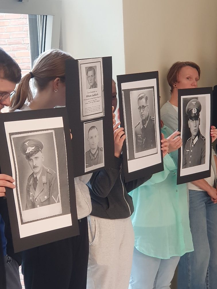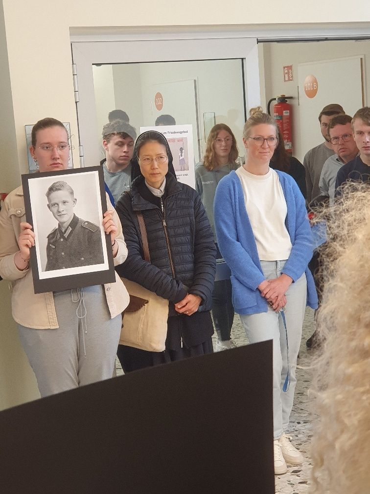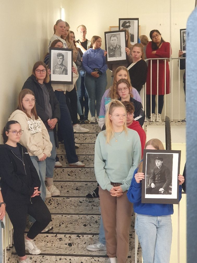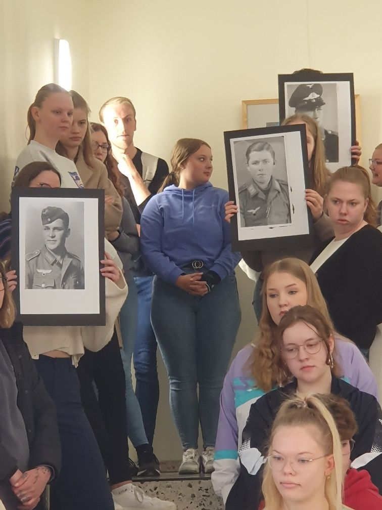 Es war sehr berührend als einige Studierende und Schüler*innen Soldatenbilder aus Ihren Familien….hochhielten, die im Zweiten Weltkrieg gefallen sind. Dabei erklang das Lied von Reinhold Beckmann „Änne und ihre vier Brüder“.