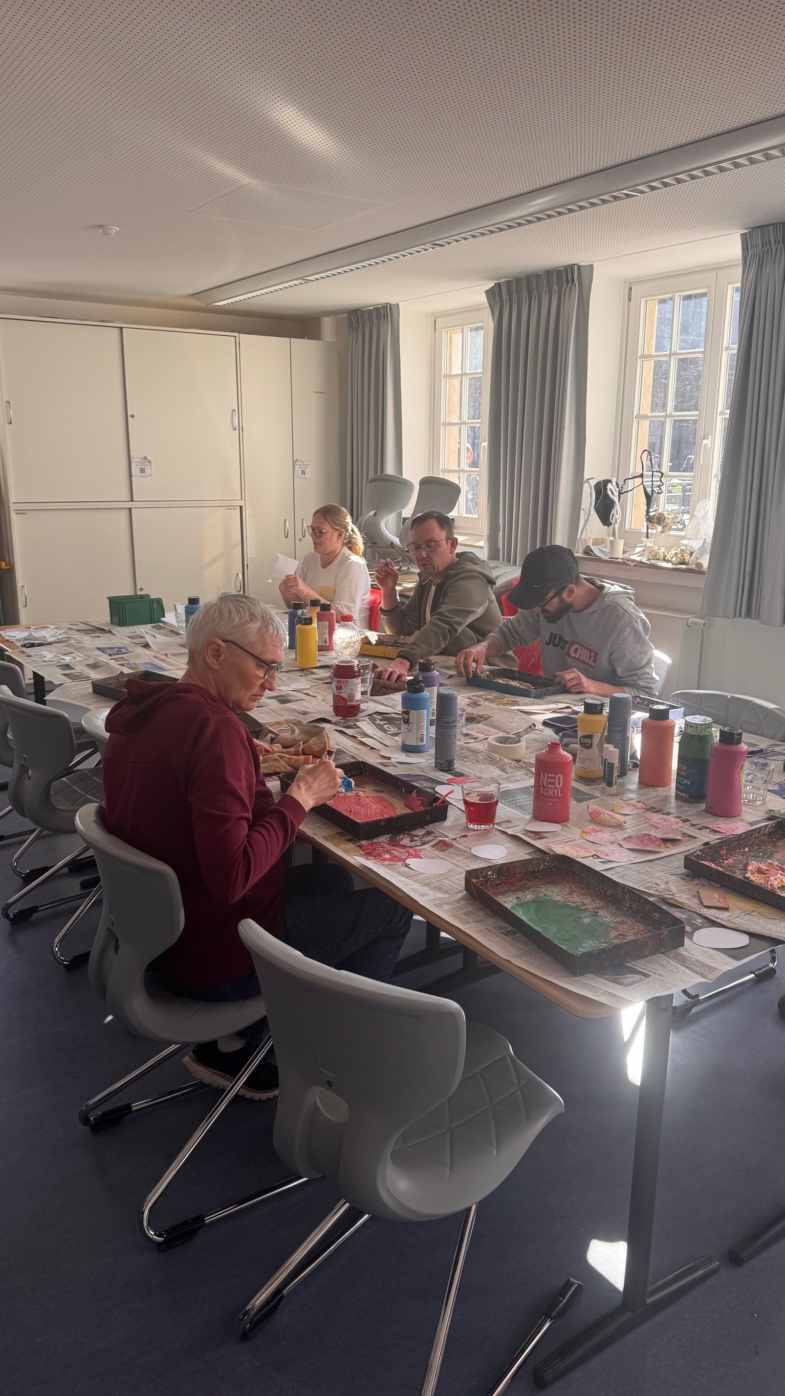 Die Unterstufe der Heilerziehungspflege (HEPBUb) durfte in den letzten beiden Tagen besondere Gäste an der Liebfrauenschule begrüßen: Eine Gruppe von Menschen mit Beeinträchtigung von der Marienburg aus Coesfeld waren mit ihren beiden Betreuer:innen René und Maike zu Besuch. Der erste Tag stand ganz im Zeichen des Kennenlernens. Die Gäste erhielten spannende Einblicke in die Schule sowie in die Inhalte und Ziele der Heilerziehungspflegeausbildung. In offener herzlicher Atmosphäre entstanden schnell erste Kontakte und Gespräche. Am zweiten tag wurde es dann praktisch und kreativ: Die Studierenden hatten verschiedene Aktionen vorbereitet, bei denen gemeinsames Erleben im Mittelpunkt stand. So konnten die Gäste bei einer Traumreise entspannen, sich bei einer Bastelaktion mit Rasierschaum kreativ entfalten und an Bewegungsangeboten teilnehmen, die für viel Freude und Aktivität sorgten. Einen schönen Abschluss bildete das gemeinsame Mittagessen. Hier wurde nicht nur zusammen gegessen, sondern auch gemeinsam angepackt: Drei der Gäste unterstützten tatkräftig bei den Vorbereitungen und hatten in der Küche hörbaren Spaß. Die beiden Tage waren für alle Beteiligten eine bereichernde Erfahrung, die eindrucksvoll zeigte, wie wichtig Begegnung, Teilhabe und gemeinsames Lernen sind.