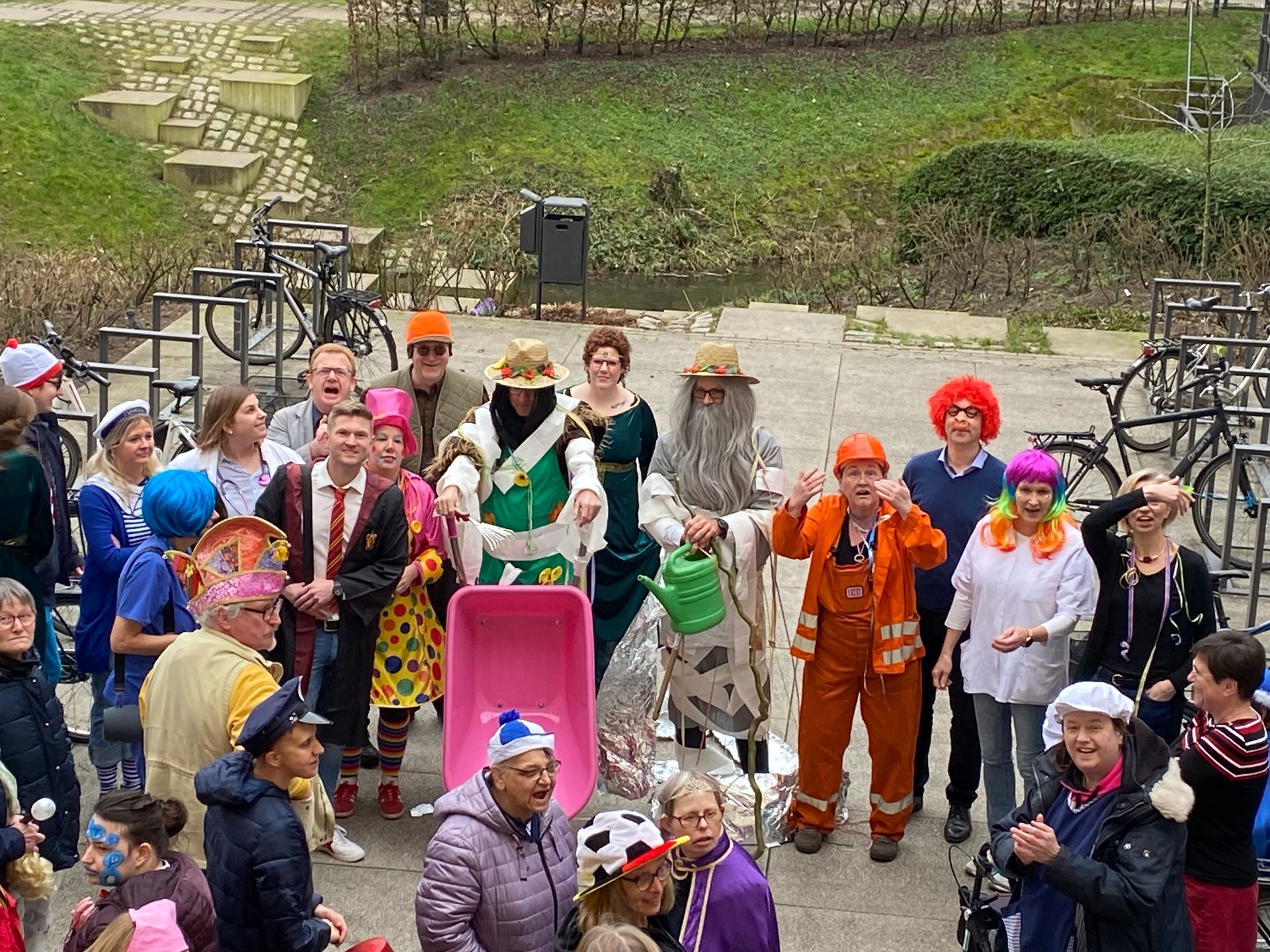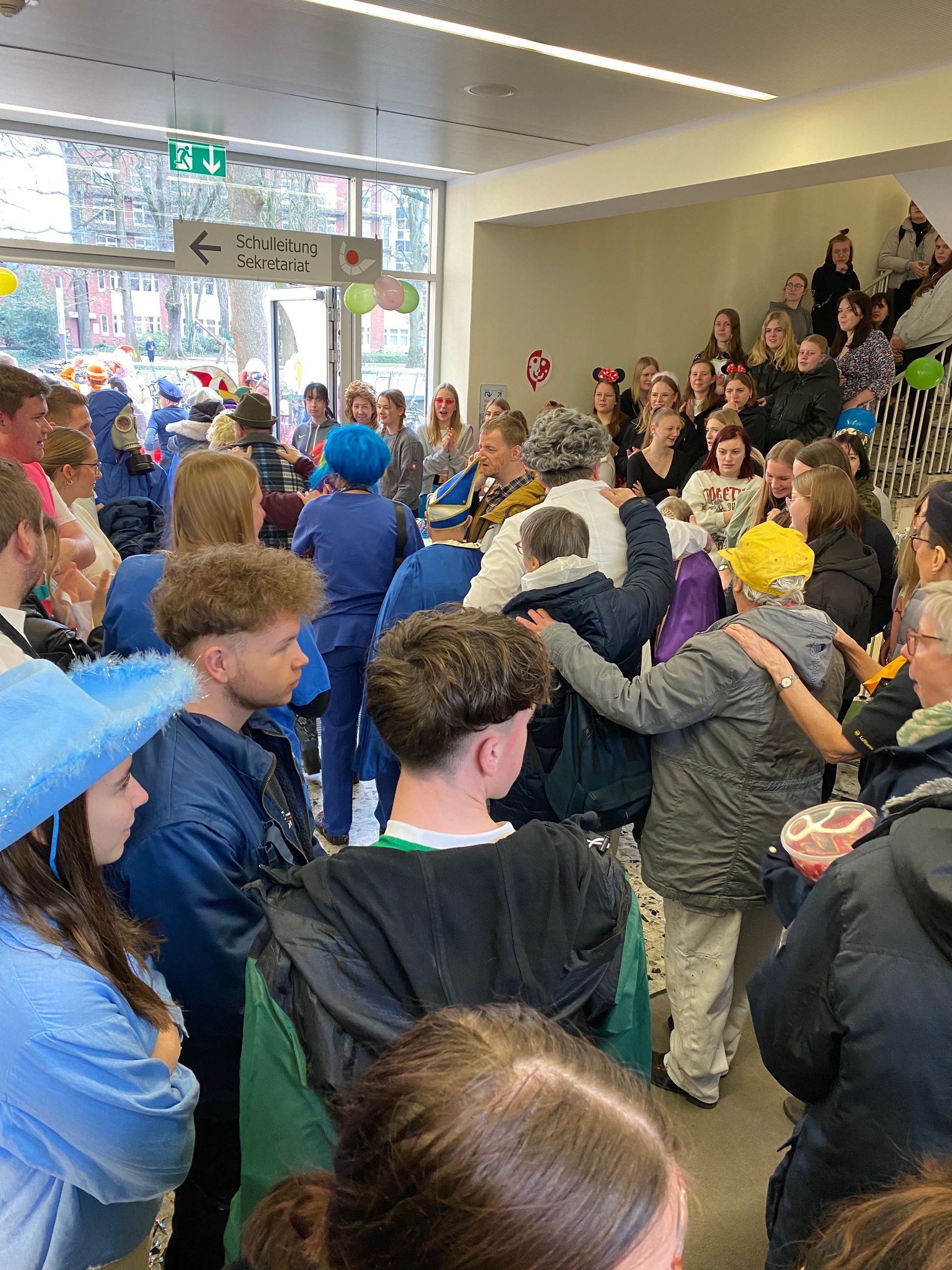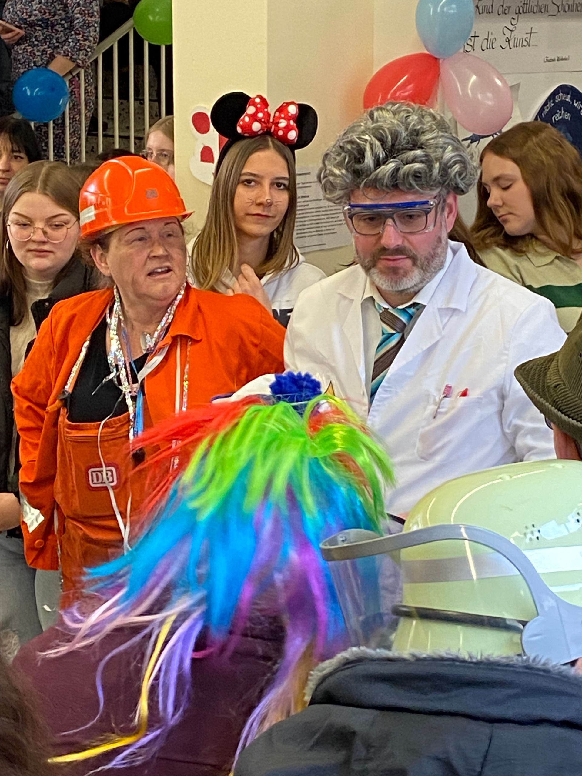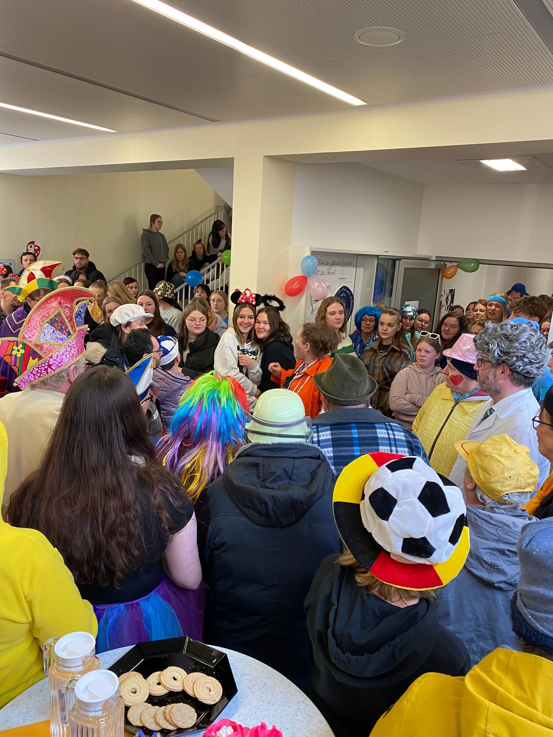 Am späten Vormittag wurden alle Bewohner*innen und Mitarbeiter*innen der Marienburg, die entsprechend der 5. Jahreszeit verkleidet erschienen, von Daniela Grünhagen im Foyer der Liebfrauenschule begrüßt. Aber nicht nur die Abordnung der Marienburg war verkleidet – auch ein großer Teil des Kollegiums, der Verwaltung und viele Schüler*innen erschienen in Kostümen.