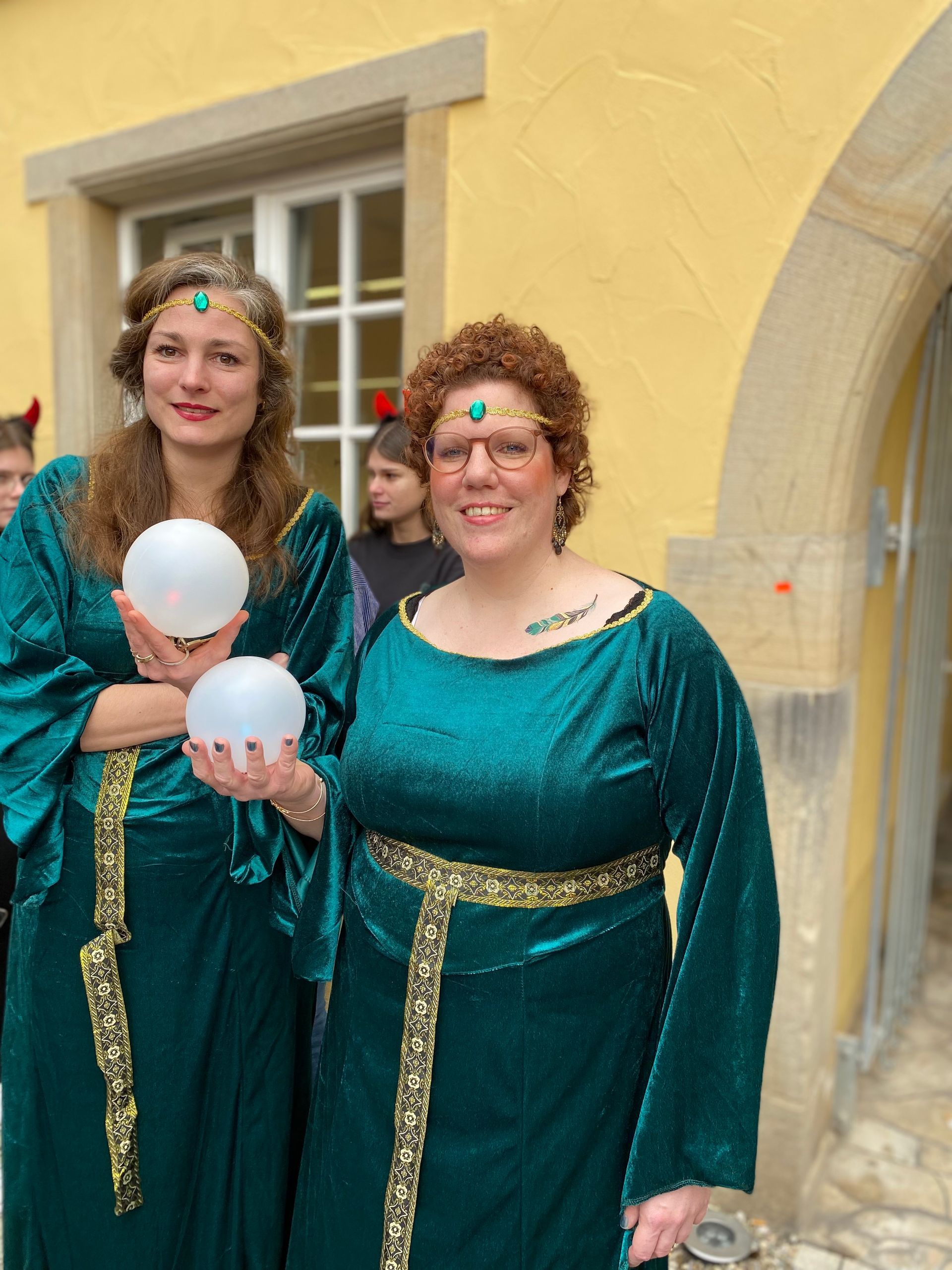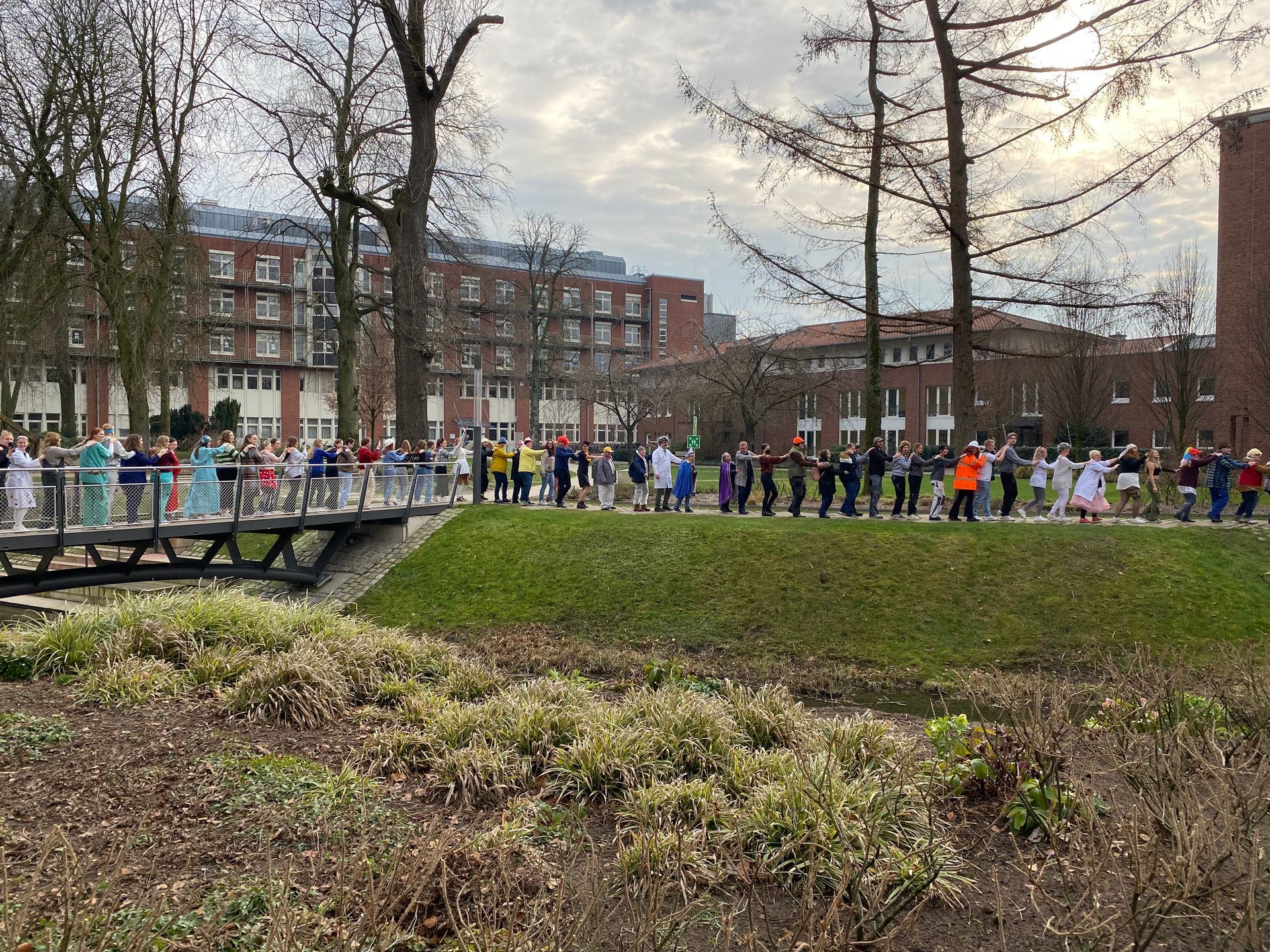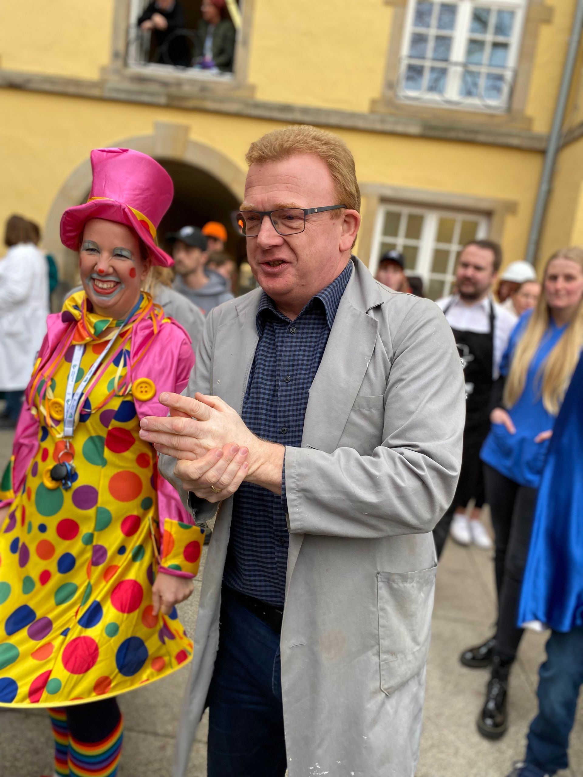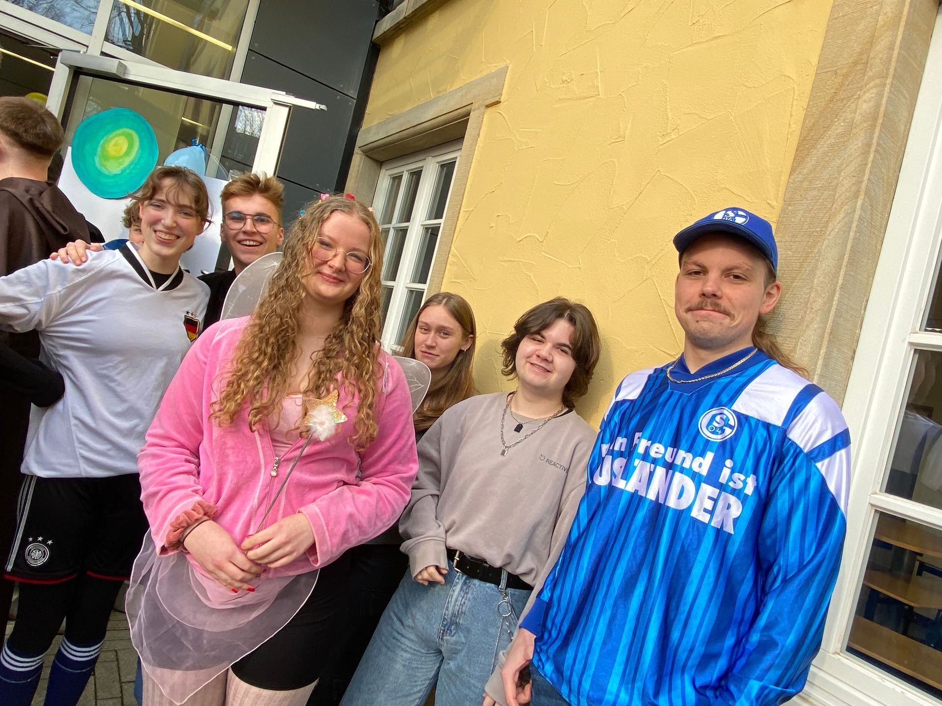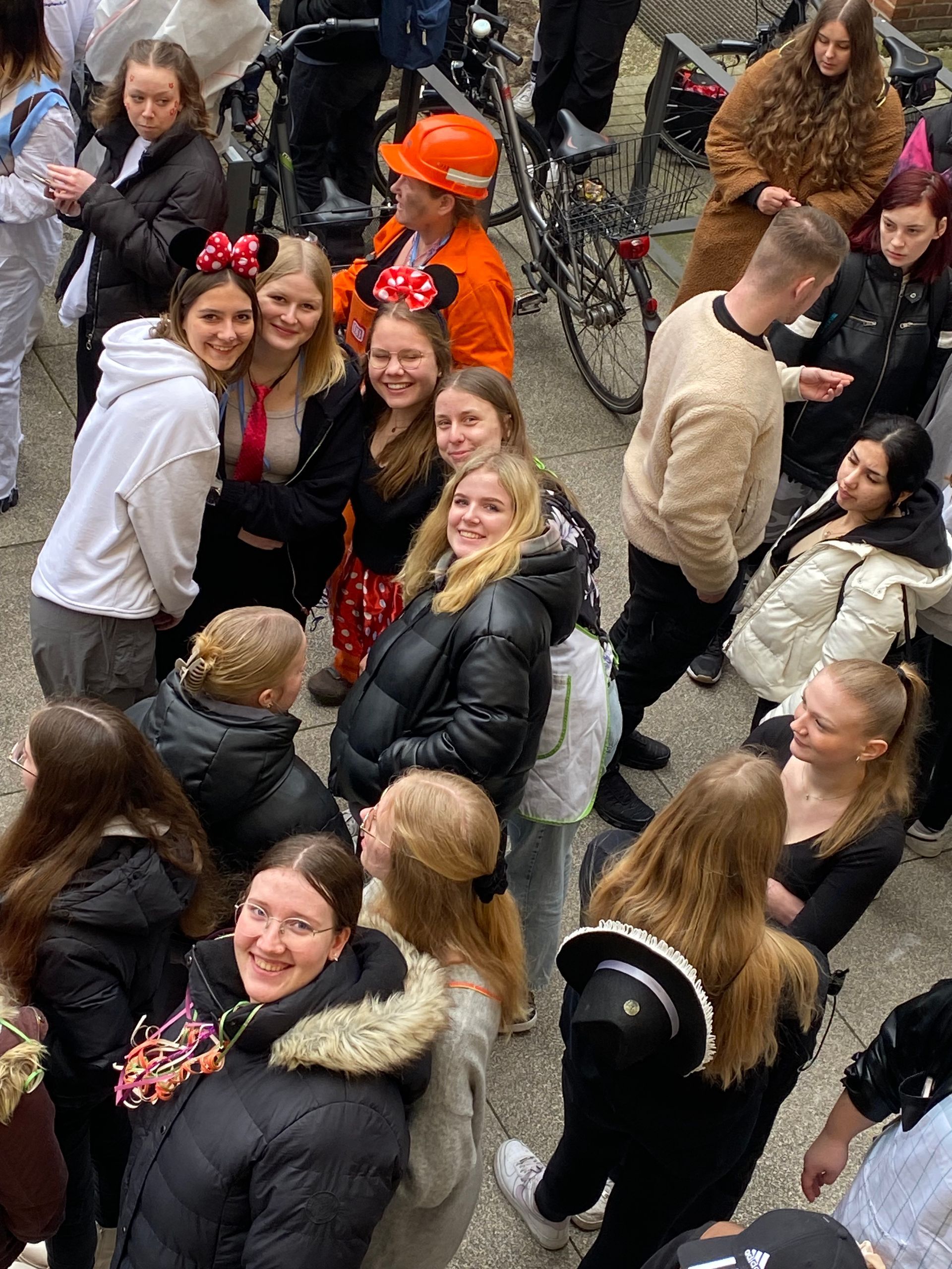 Am späten Vormittag wurden alle Bewohner*innen und Mitarbeiter*innen der Marienburg, die entsprechend der 5. Jahreszeit verkleidet erschienen, von Daniela Grünhagen im Foyer der Liebfrauenschule begrüßt. Aber nicht nur die Abordnung der Marienburg war verkleidet – auch ein großer Teil des Kollegiums, der Verwaltung und viele Schüler*innen erschienen in Kostümen.