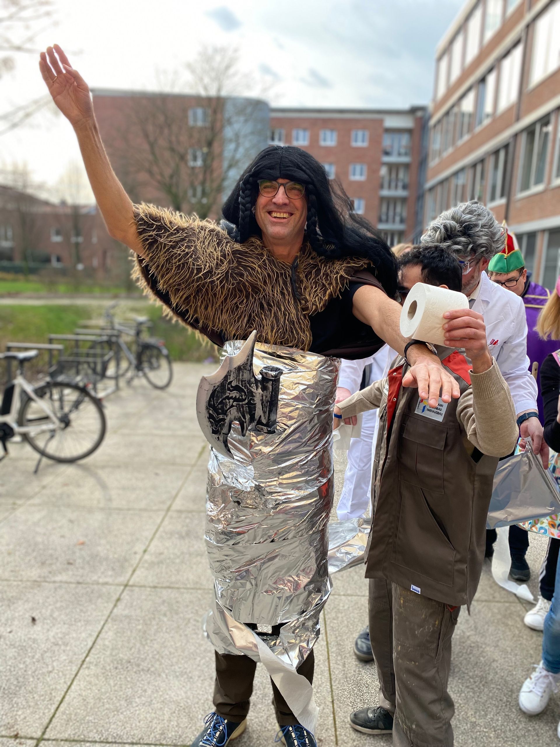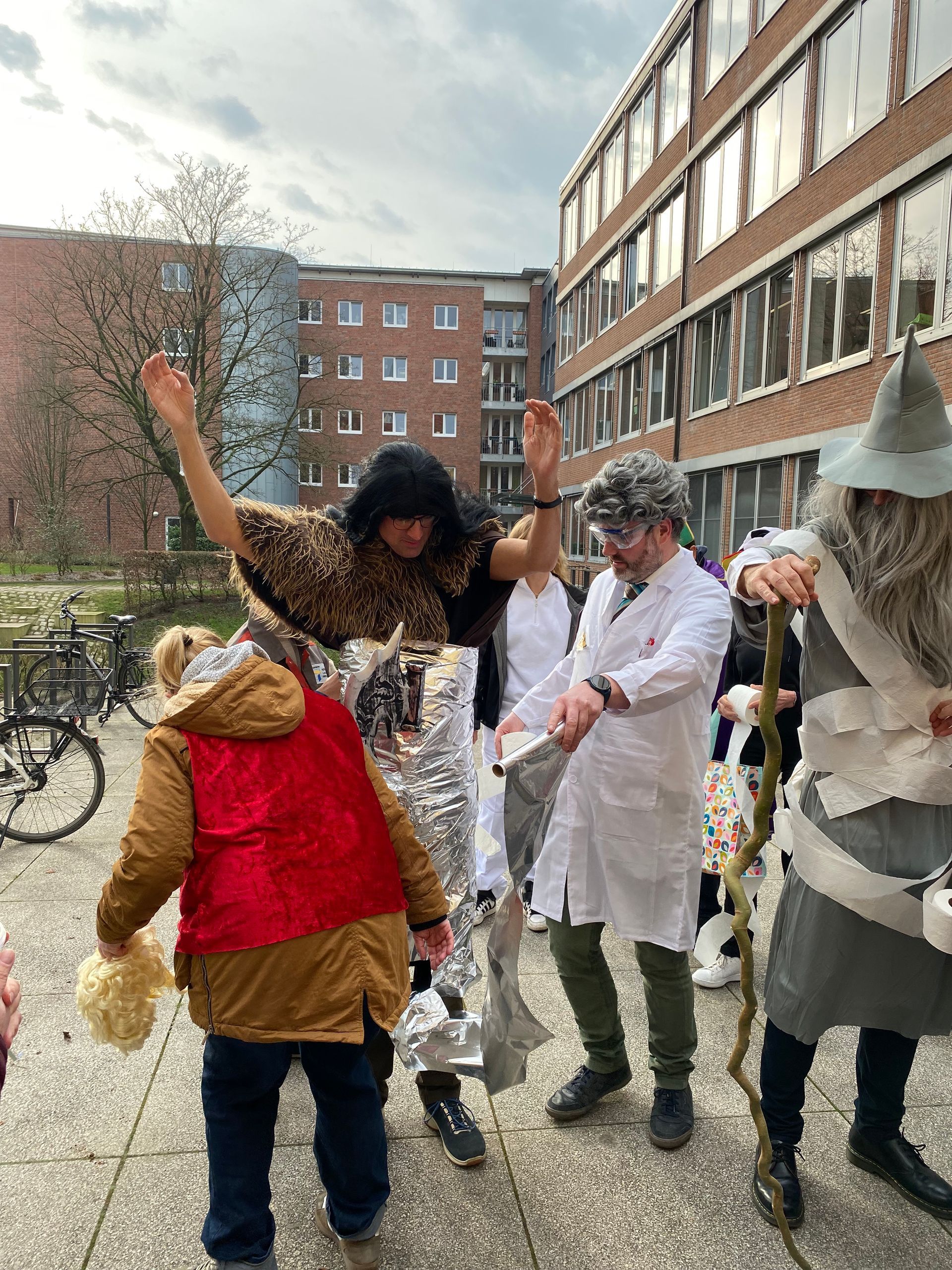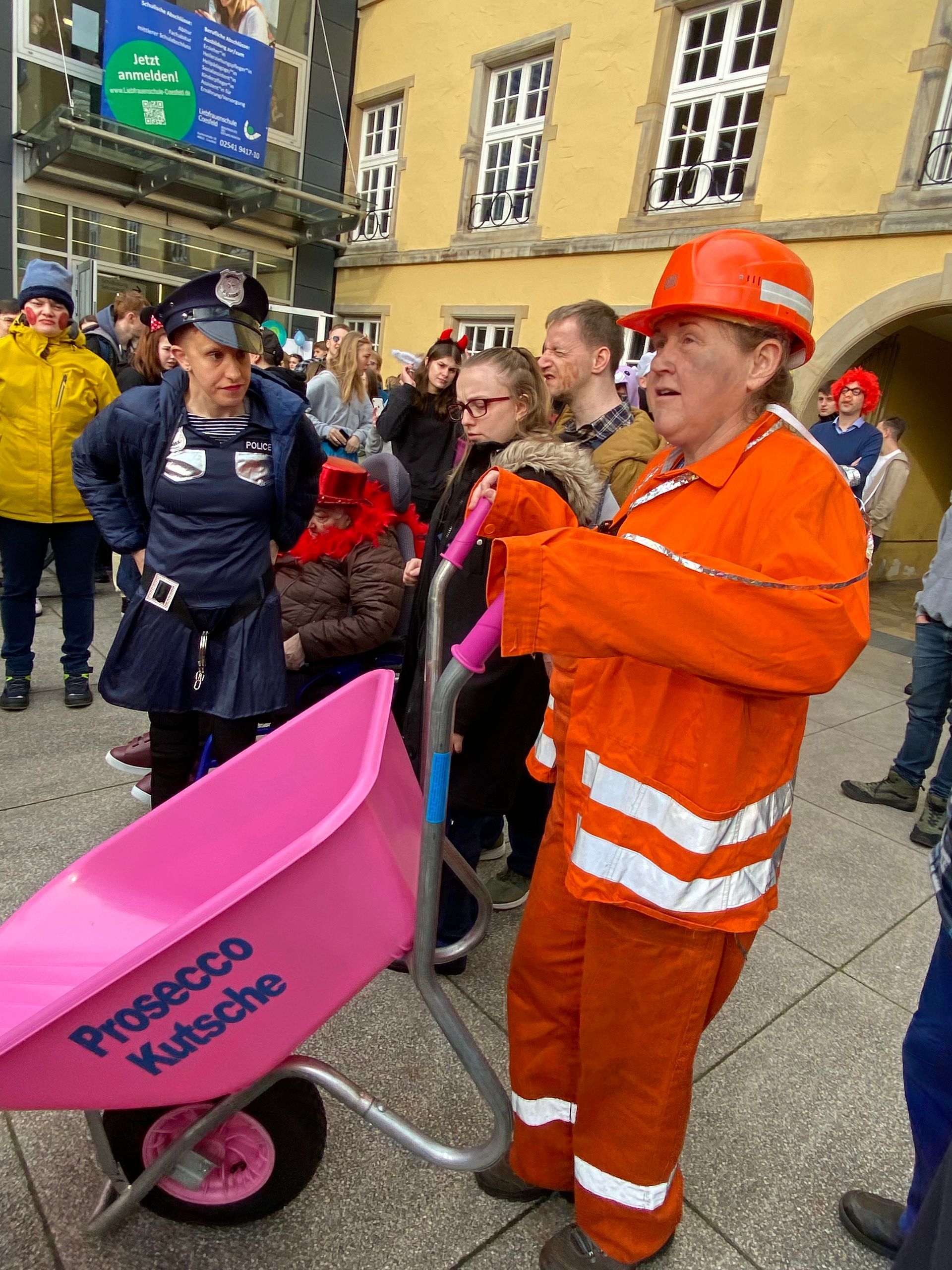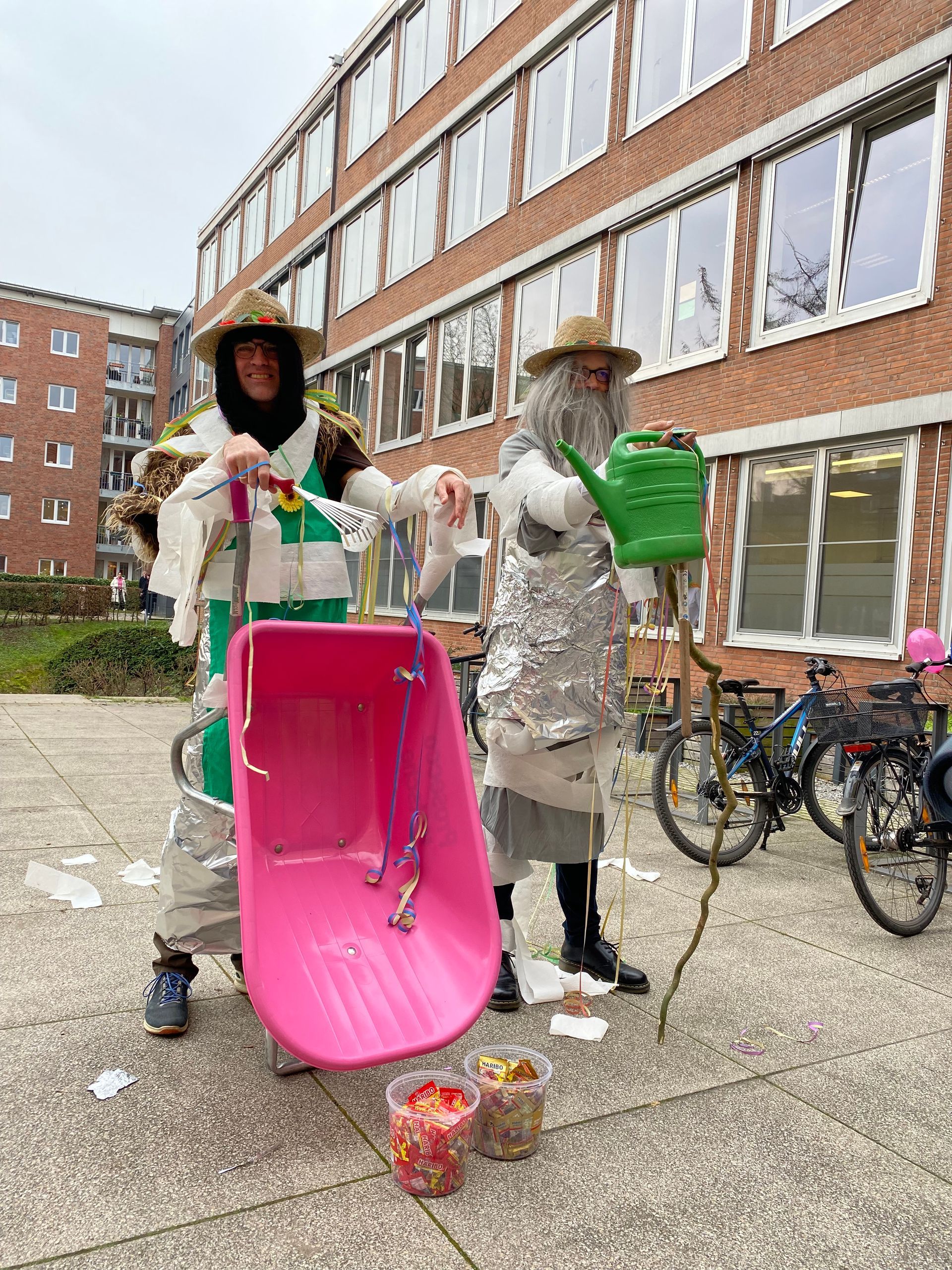 Nach einer kurzen Ansprache fragte Frau Grünhagen dann auch direkt, ob der erste Teil der Wette schon eingelöst werden könnte. Und es waren nicht nur fünf Bewohner*innen in verschiedenen Berufsverkleidungen erschienen, es wurden mindestens zehn verschiedene Berufe gezählt, darunter ein Feuerwehrmann, eine Putzfee und ein Maler. Damit galt der erste Teil der Wette als gewonnen und dies wurde mit einer ausdauernden Polonaise in und um das Schulgebäude gefeiert.
