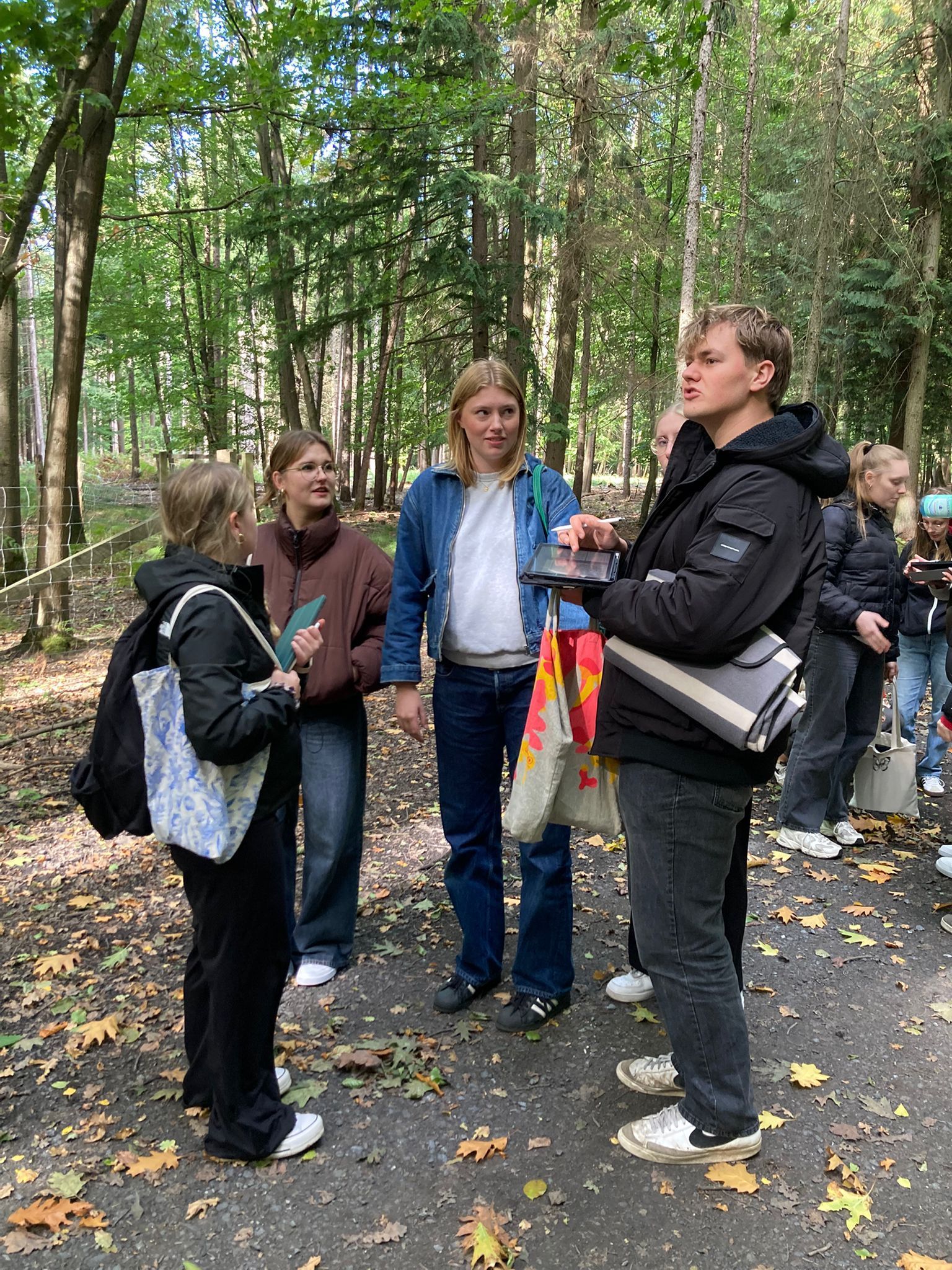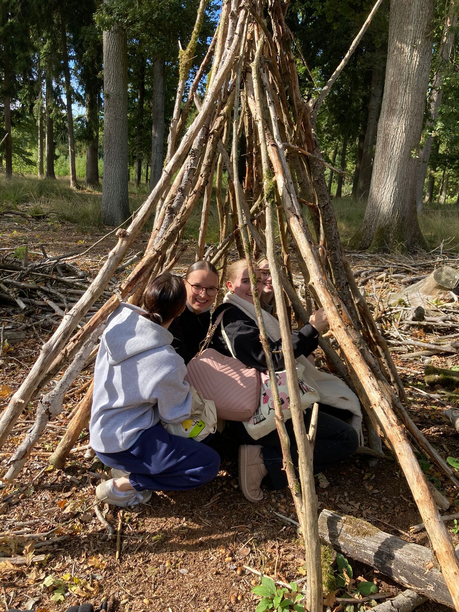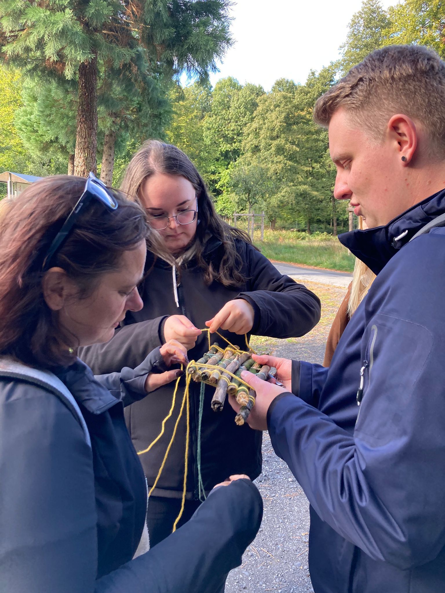 Einen ganzen Nachmittag in der Natur verbrachten angehende Erzieherinnen und Erzieher der beiden VTA-Kurse Elementarpädagogik am Mittwoch im Wildpark Dülmen. Bei herbstlich-schönem Wetter starteten die Gruppen unter der Leitung von Jasmin Fischer und Jennifer Kahn mit einer Rallye durch den Park, die nicht nur Teamgeist, sondern auch den Blick für die Tiere und Pflanzen in der Umgebung schärfte. Dabei konnten die Studierenden auch das Damwild ganz nah erleben. Besonders beliebt war die Schatzsuche, bei der Naturmaterialien gesammelt und anschließend kreativ eingesetzt wurden. Aus Holzstücken bauten die Teilnehmenden kleine Flöße, die anschließend auf dem Wasser ausprobiert wurden. Ebenso entstanden bunte Bilder aus Blättern, Steinen, Zapfen, Kastanien und Moos – kleine Kunstwerke aus dem, was die Natur bereitstellt. Zudem baute eine Gruppe am Waldrand ein Tipi aus Holz. Die Exkursion zeigte eindrucksvoll, wie vielfältig die Natur als Lern- und Erlebnisraum genutzt werden kann. Für die angehenden Fachkräfte war es ein Nachmittag voller Spaß, Kreativität und Inspiration für zukünftige Impulse und Angebote mit Kindern.