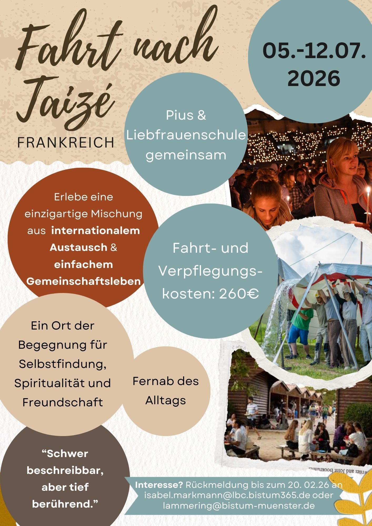 Liebe Schulgemeinschaft, wir freuen uns sehr darüber, Ihnen heute eine neue, außergewöhnliche Schulfahrt anbieten zu können und Teil einer besonderen Erfahrung zu werden: unserer Taizé-Fahrt gemeinsam mit dem Pius-Gymnasium . Taizé ist ein völlig anderer Ort der Begegnung und der internationalen Gemeinschaft. Menschen aus ganz Europa und der Welt kommen dort zusammen, um innezuhalten, gemeinsam zu singen, zu beten, nachzudenken und sich auszutauschen. In der einfachen, offenen Atmosphäre entsteht Raum für Fragen des Lebens, für neue Impulse und für echte Gemeinschaft – ganz unabhängig von Herkunft oder persönlicher Glaubensprägung. Die Fahrt bietet die Möglichkeit, dem Schulalltag für einige Tage zu entfliehen, neue Menschen aus der ganzen Welt kennenzulernen, Gemeinschaft bewusst zu erleben, zur Ruhe zu kommen und neue Kraft zu schöpfen. Eingeladen sind alle, die neugierig sind und Lust haben, sich auf diese besondere Erfahrung einzulassen. Vorkenntnisse sind nicht nötig – Offenheit genügt. Informationen zu Termin, Kosten und Anmeldung finden Sie im Flyer. Ich werde in dieser Woche durch einige Klassen gehen und für Fragen zur Verfügung stehen. Wir freuen uns sehr über alle, die nach Taizé aufbrechen möchten!