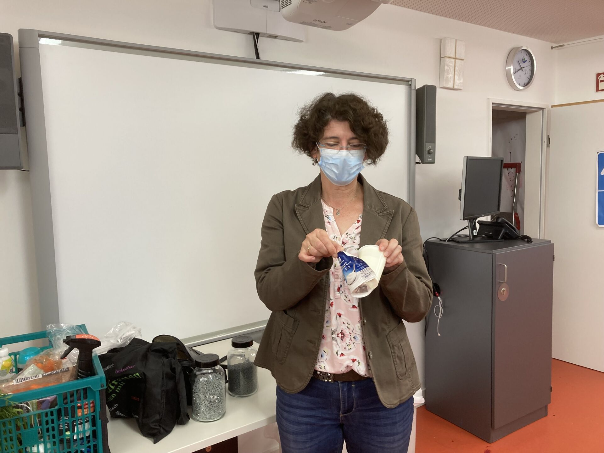 Mit vielen realen Verpackungen aus dem Alltag erklärte die Referentin Mechtild Ahaus vieles zum Thema Recycling. Einen Schwerpunkt legte sie auf das Kunststoff-Recycling, welches als sehr ressourcenschonend gilt.