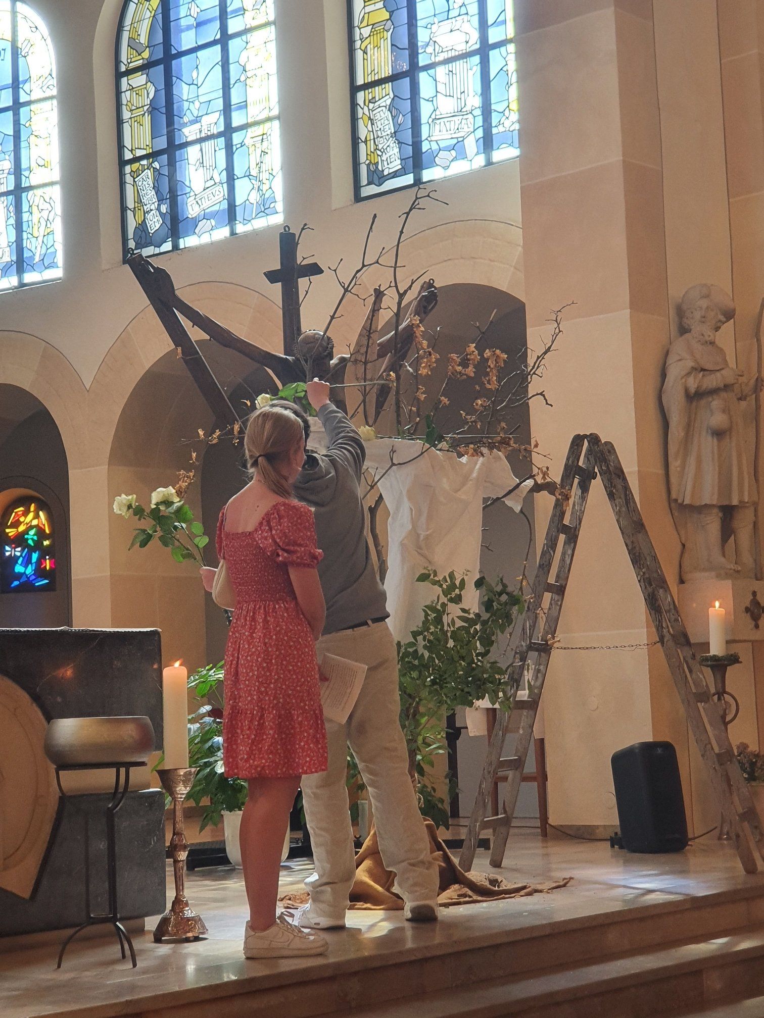 Am 23.09.2025 feierten wir den Schuljahreseröffnungsgottesdienst inter dem Motto „Connected – verbunden mit Gott und miteinander" in der Jakobikirche. Der Gottesdienst wurde geleitet von Philipp Lammering, Pastoralreferent der Gemeinde, der den Gottesdienst sehr individuell gestaltet hat. Das Schulseelsorgeteam hatte den Gottesdienst zusammen mit der HEP BUb vorbereitet. Mit dem Schuljahresanfang steht die gesamte Schulgemeinde wieder an einem aufregenden Neuanfang. Ein Neustart an dieser Schule bietet wieder neue Chancen, neue mögliche Wege, neue Begegnungen und neue Verbindungen einzugehen. Das Thema des Gottesdienstes hieß „Connected – verbunden mit Gott und miteinander“. „Connected“ – das ist ein Wort, das wir wahrscheinlich jeden Tag benutzen, ohne es großartig zu hinterfragen. Wenn das WLAN nicht connected, wird es schwierig. Wenn WhatsApp nicht lädt, fühlt es sich fast so an, als würde die Welt stillstehen. Wir merken: Verbunden zu sein, ist für uns heute selbstverständlich. Im Gottesdienst sollte es um genau diese selbstverständliche Connection gehen – allerdings nicht um die Connection der Handys, sondern um die Connection mit den Menschen um uns herum, um analoge, authentische, echte Verbindungen.