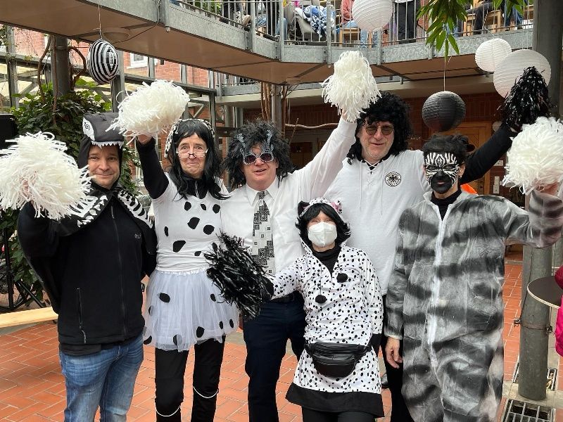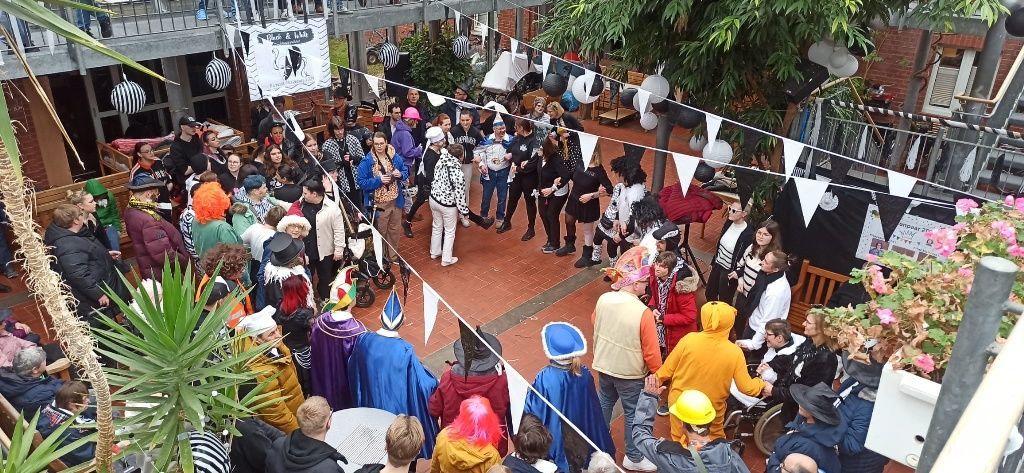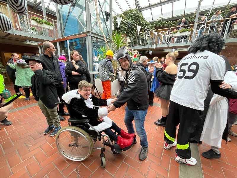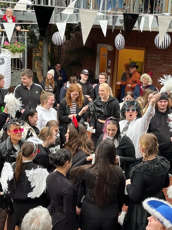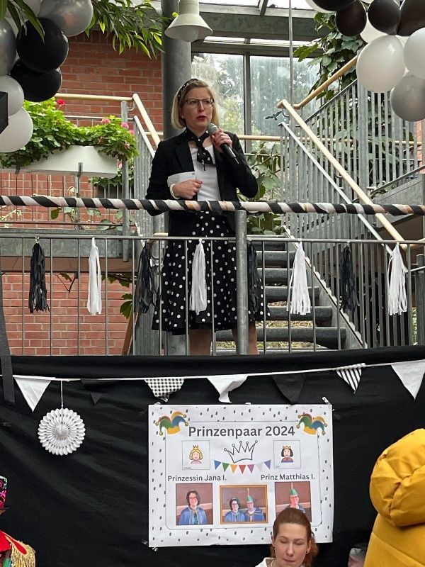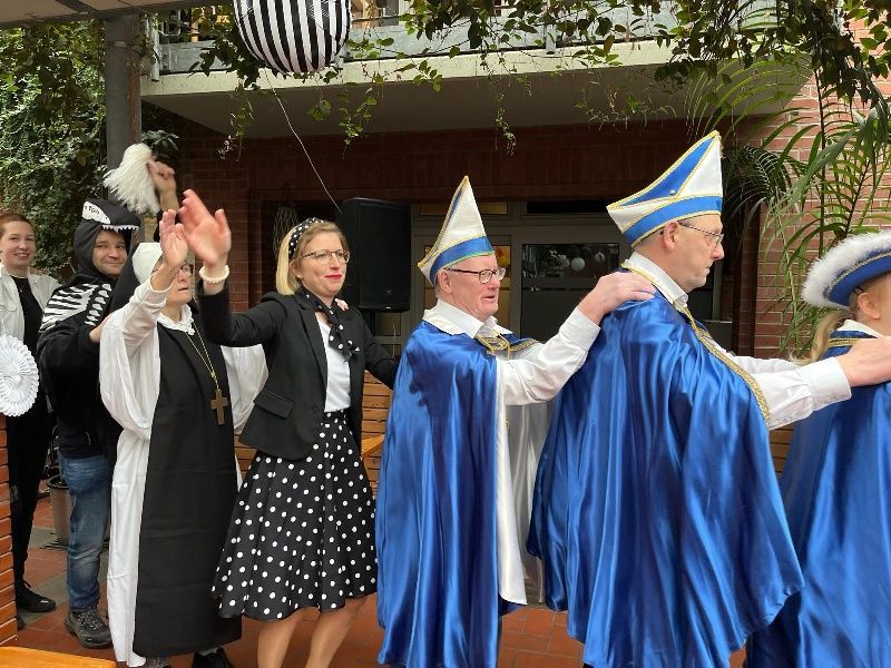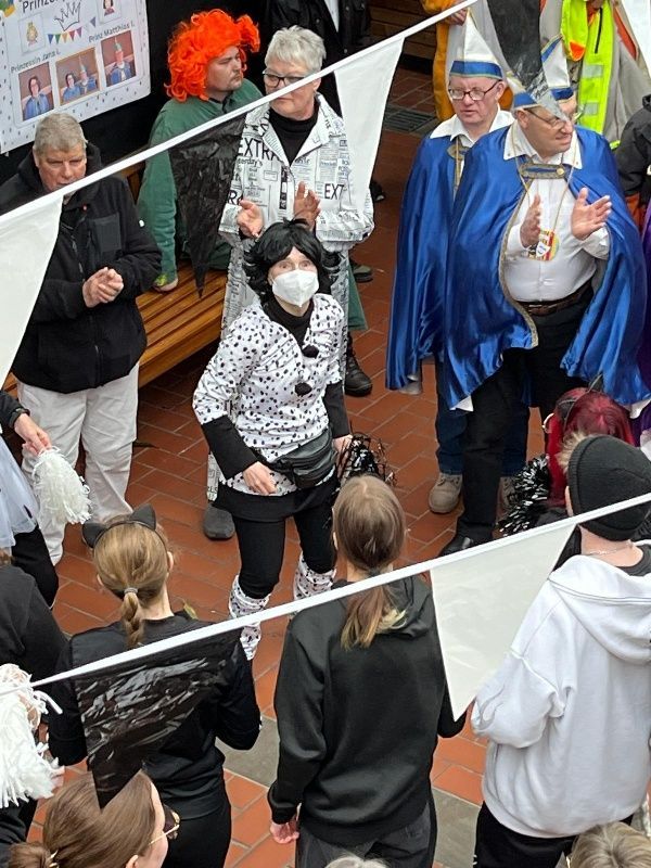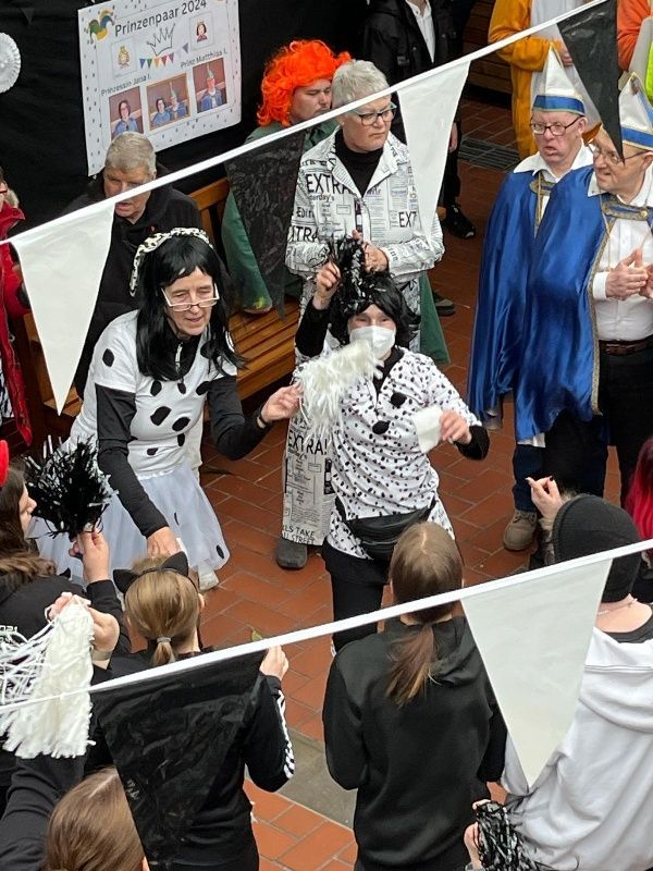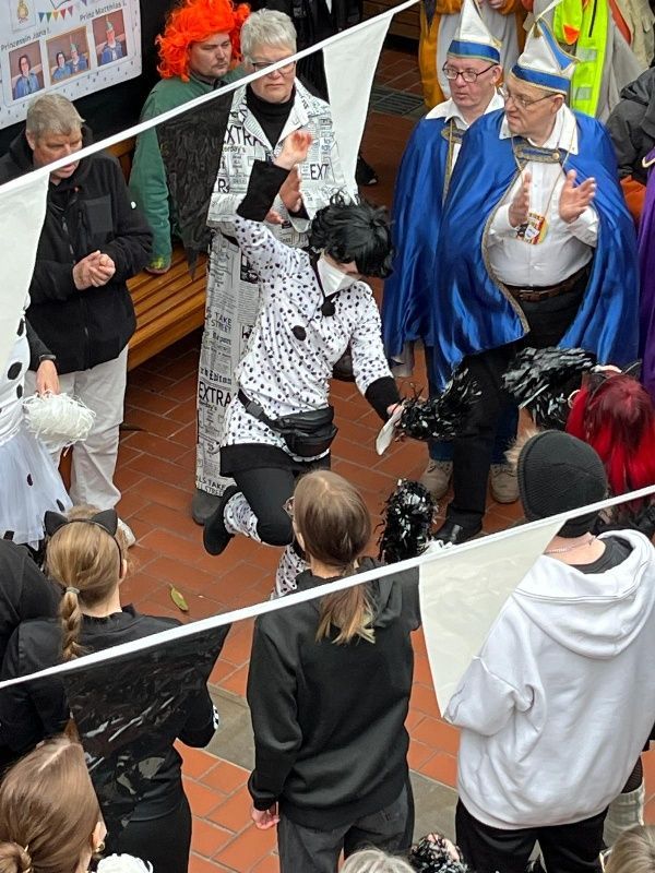 Nachdem die Vertreter:innen der Liebfrauenschule zweimal hintereinander mit vollem Stimm- und Körpereinsatz unter der mitreißenden Anleitung von Frau Schleuter und Frau Lichte „performt“ hatten, war das Eis gebrochen. Der Gewinn der Wette wurde einhellig bestätigt und die große Karnevalsparty konnte steigen. Unterstützt durch einen Karnevals-DJ der Marienburg ging die Post ab. Schon nach kurzer Zeit explodierte die Stimmung!