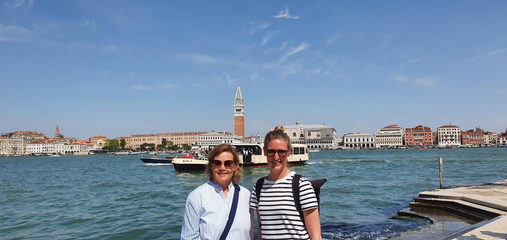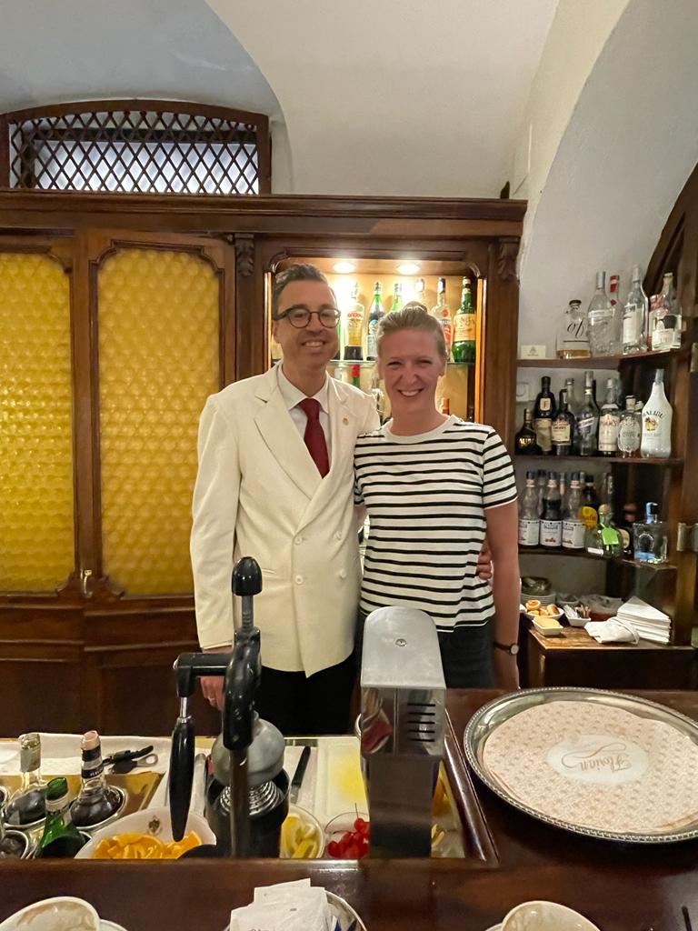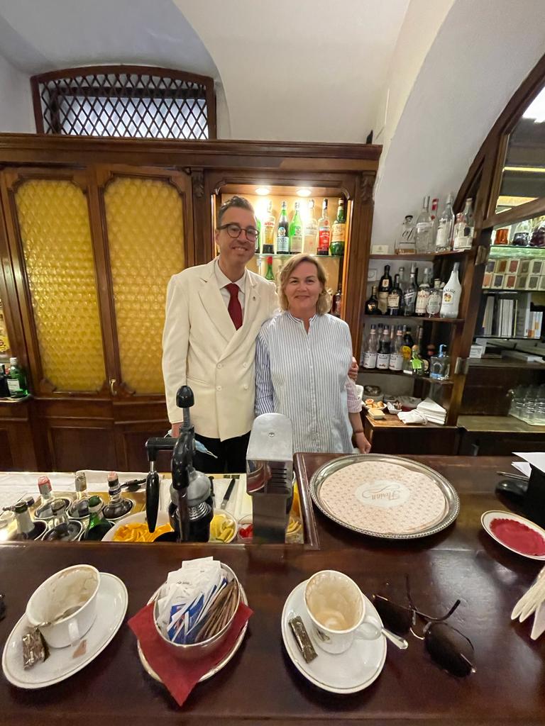 Als besonderes Highlight nannten die Italienischlernenden den Tagesausflug nach Venedig. Schlicht unvergessen wird für die meisten Schülerinnen und Schüler die Gondelfahrt bleiben, bei der diese einzigartige Stadt vom Wasser aus noch faszinierender wirkte. Auch Frau Jolk und Frau Potthoff machten im weltberühmten Caffè Florian eine besondere Bekanntschaft: Für den Unterrichtseinstieg zum landeskundlichen Schwerpunkt Venedig brauchten sie aktuelles didaktisches Material. Da kam ihnen schnell die Idee, ein gemeinsames Foto mit dem Barista hinter dem Tresen zu machen.