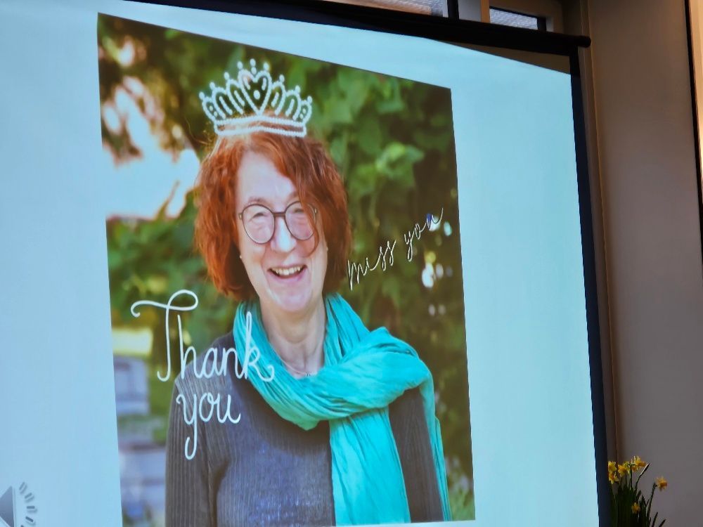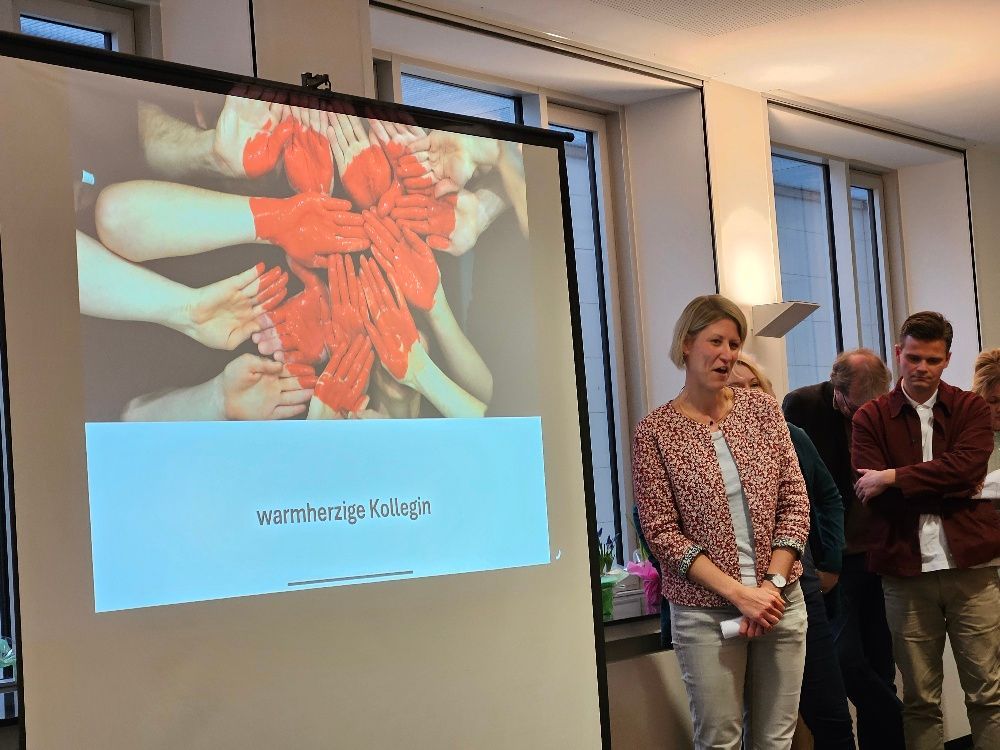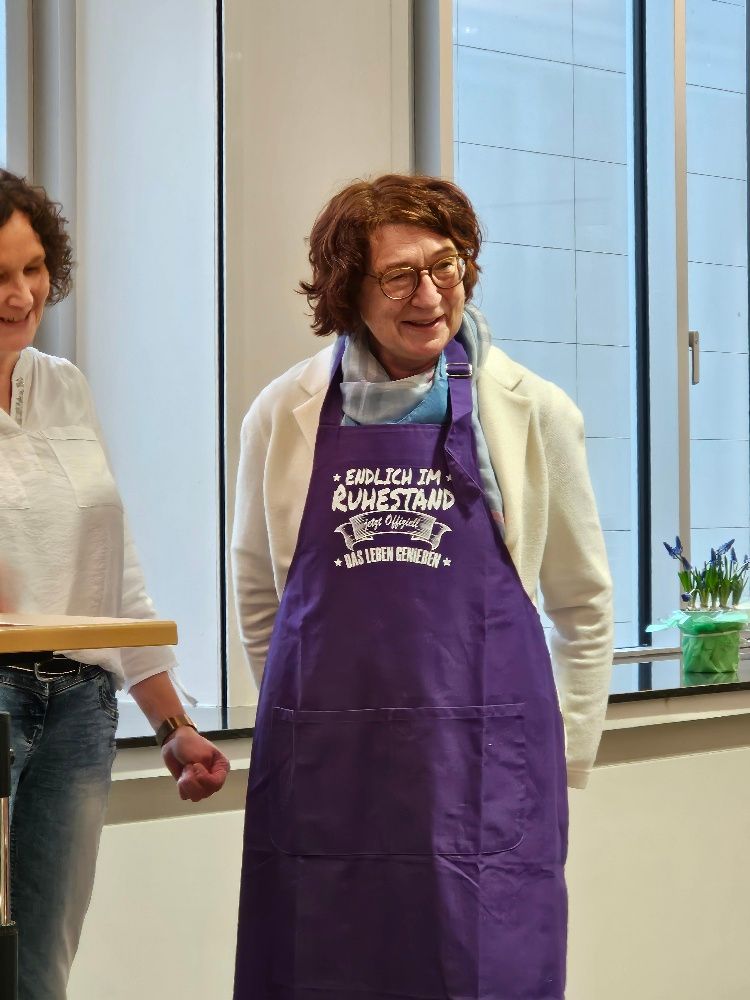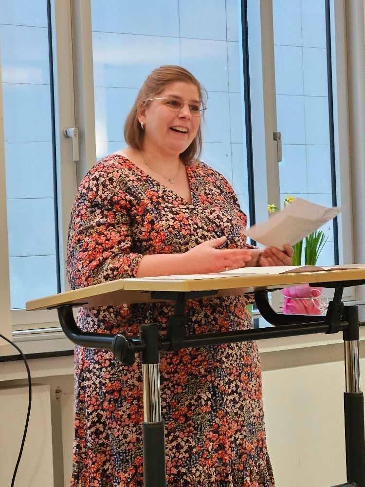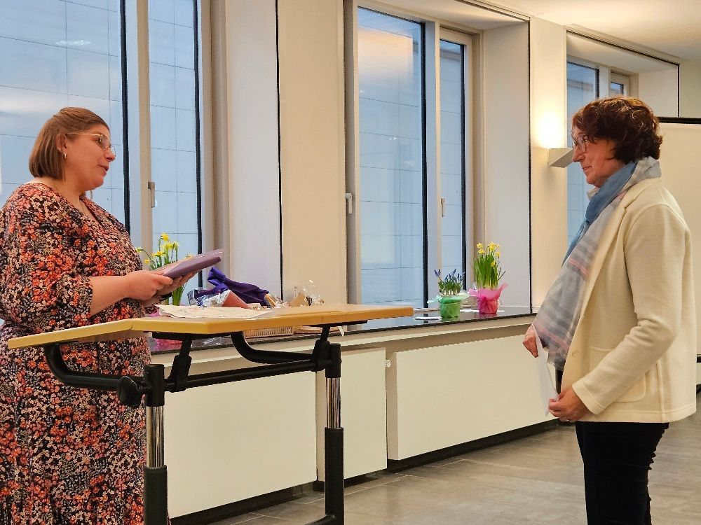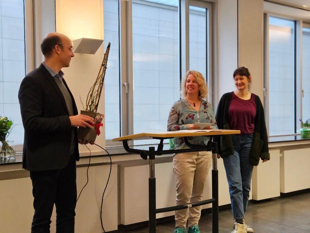 Es folgten ein paar Worte von Herrn Schier, stellvertretend für die Bildungsgangkonferenz AHE/AHG. Frau Sandhofe hatte sich explizit keine Rede gewünscht und war dementsprechend überrascht über diesen Beitrag. Deshalb sprach Herr Schier auch "nur" Worte des Dankes an Frau Sandhofe für ihre jahrelange Arbeit für die BiKo AHE/AHG und überrreichte zusammen mit Frau Rottenbücher und Frau Bur am Orde eine kleine Blume, die mit Sicherheit in der nächsten Zeit noch wachsen würde.