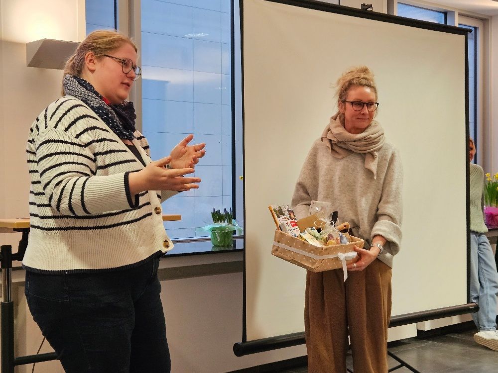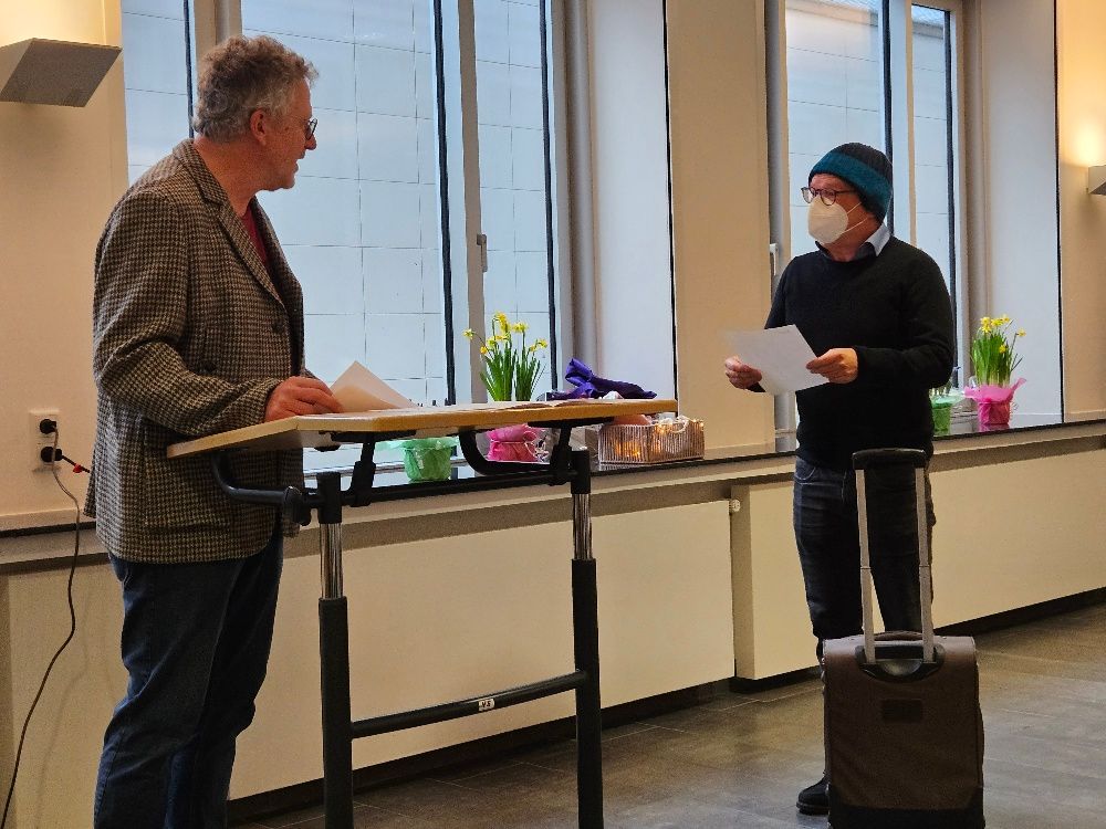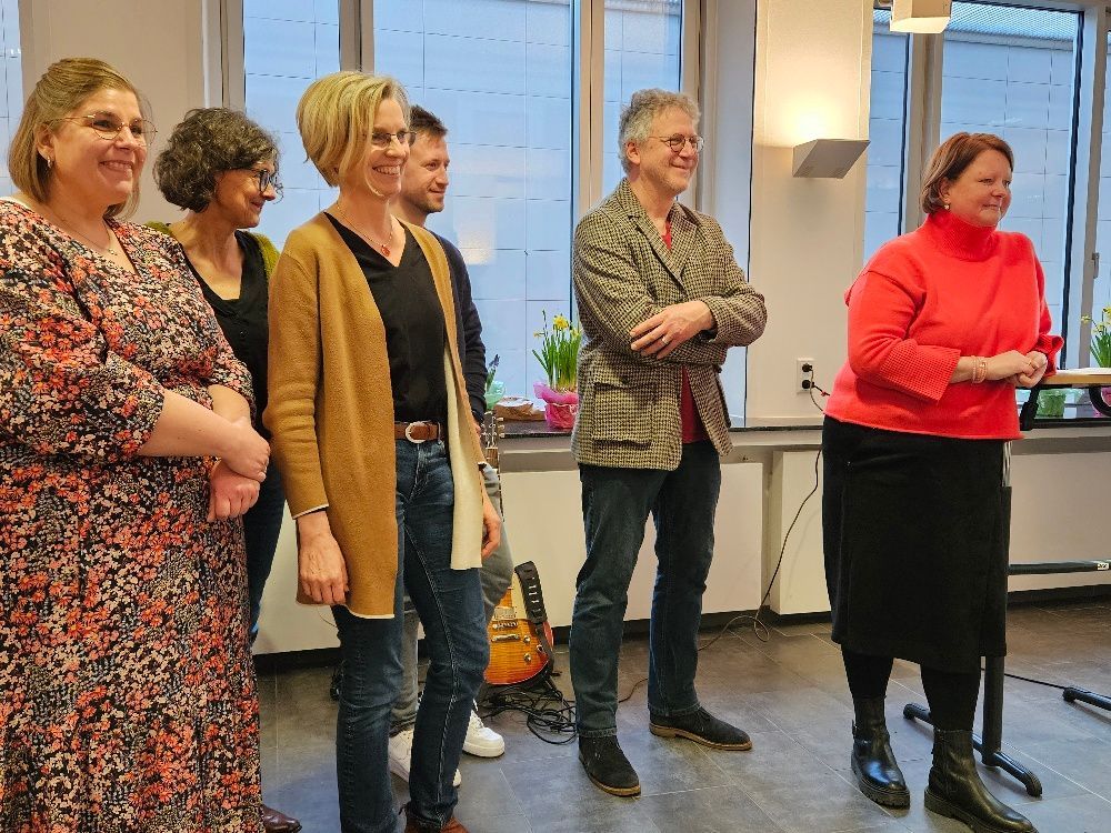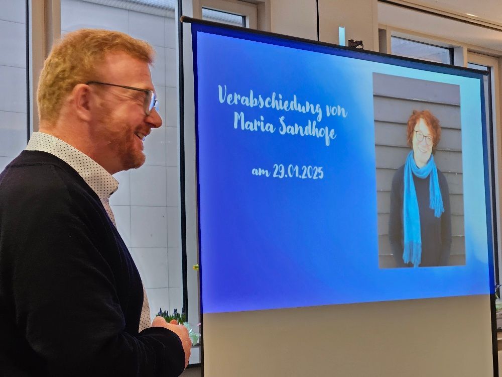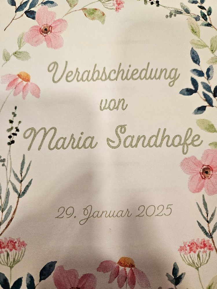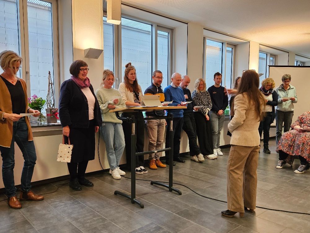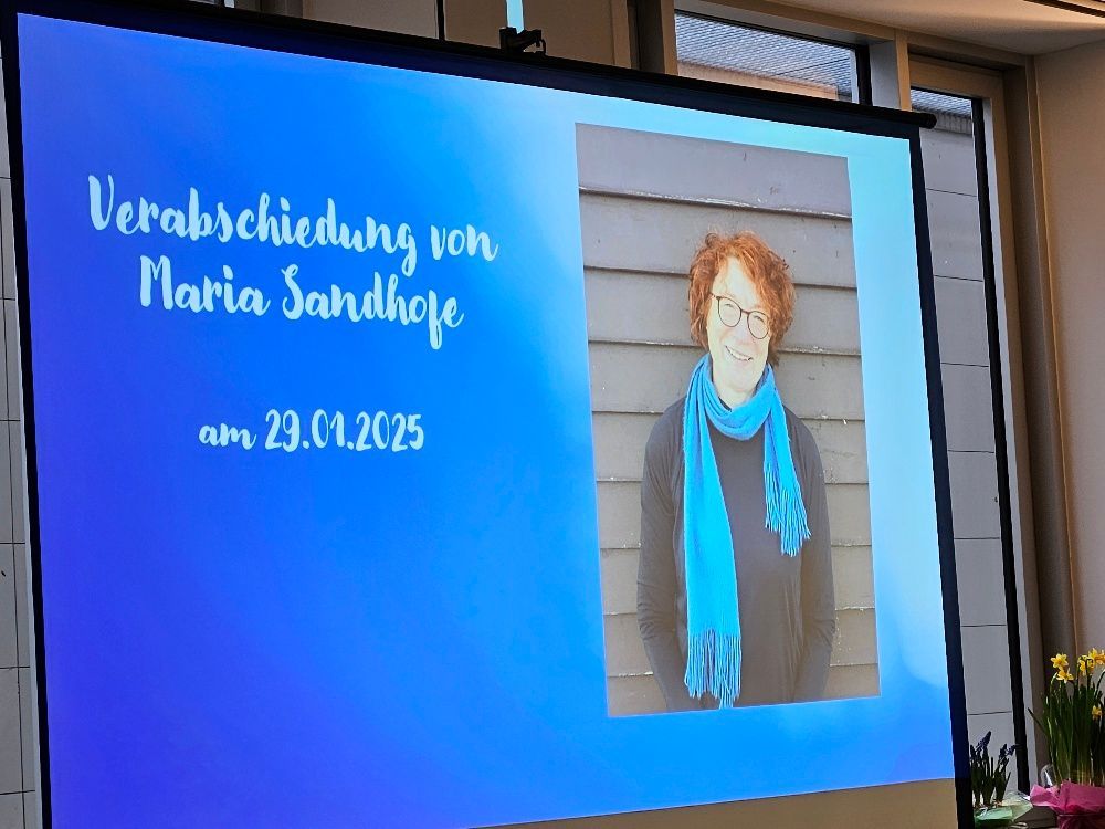 Es folgten ein paar Worte von Herrn Schier, stellvertretend für die Bildungsgangkonferenz AHE/AHG. Frau Sandhofe hatte sich explizit keine Rede gewünscht und war dementsprechend überrascht über diesen Beitrag. Deshalb sprach Herr Schier auch "nur" Worte des Dankes an Frau Sandhofe für ihre jahrelange Arbeit für die BiKo AHE/AHG und überrreichte zusammen mit Frau Rottenbücher und Frau Bur am Orde eine kleine Blume, die mit Sicherheit in der nächsten Zeit noch wachsen würde.