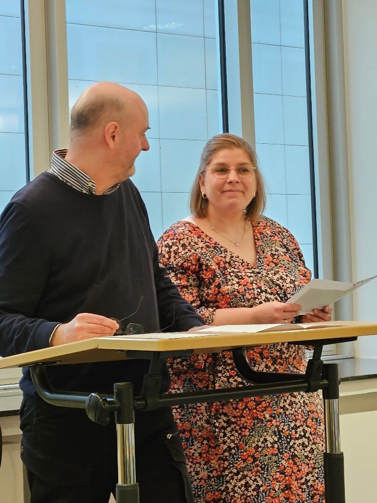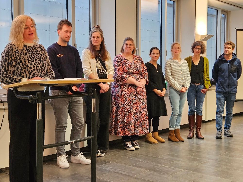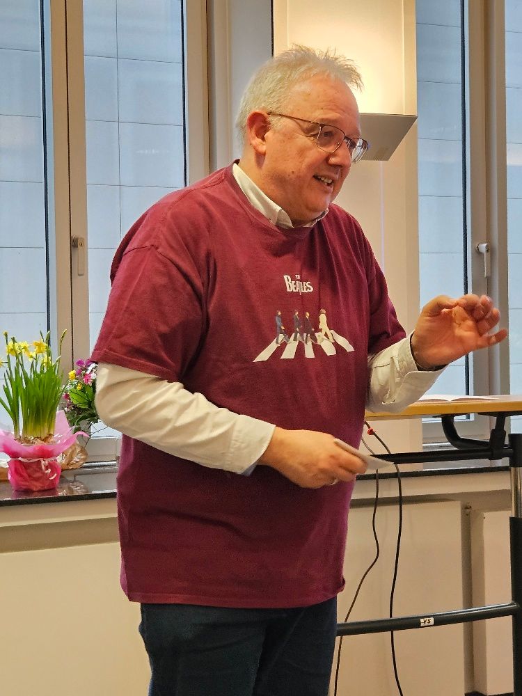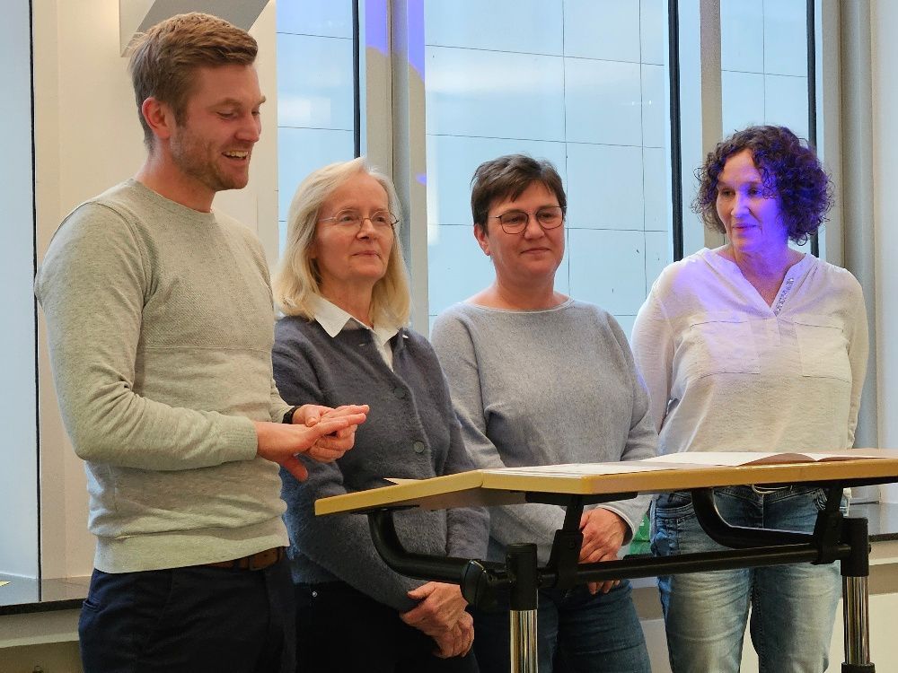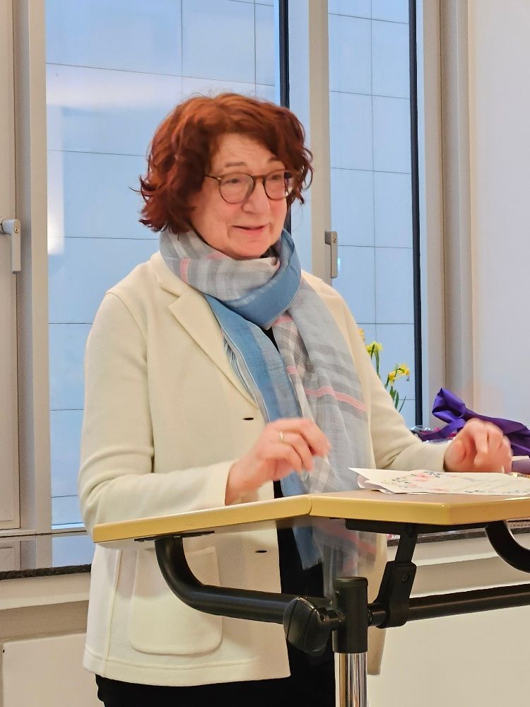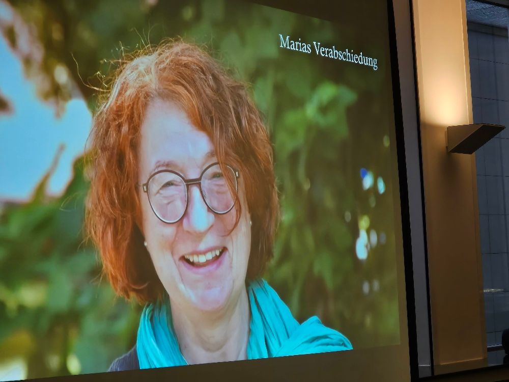 Es folgten ein paar Worte von Herrn Schier, stellvertretend für die Bildungsgangkonferenz AHE/AHG. Frau Sandhofe hatte sich explizit keine Rede gewünscht und war dementsprechend überrascht über diesen Beitrag. Deshalb sprach Herr Schier auch "nur" Worte des Dankes an Frau Sandhofe für ihre jahrelange Arbeit für die BiKo AHE/AHG und überrreichte zusammen mit Frau Rottenbücher und Frau Bur am Orde eine kleine Blume, die mit Sicherheit in der nächsten Zeit noch wachsen würde.