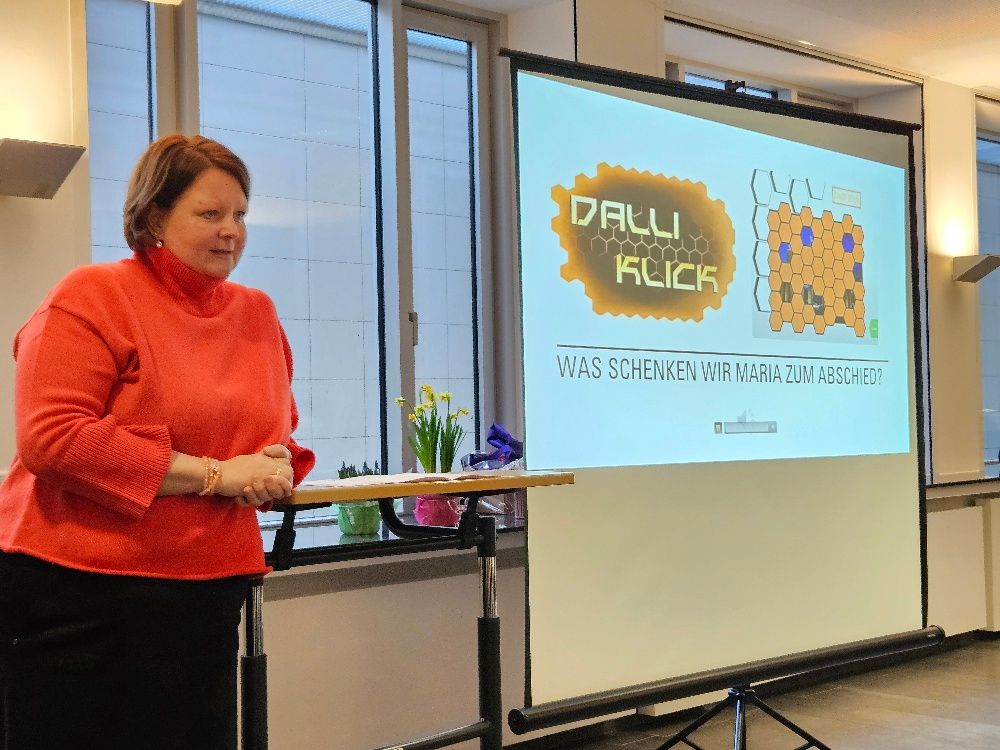 Die Fachkonferenz Biologie hatte ein "Dalli-Klick" erstellt, bei dem Frau Sandhofe erraten musste, was ihr zum Abschied geschenkt wurde. Die Moderation übernahm Frau Ademmer.
