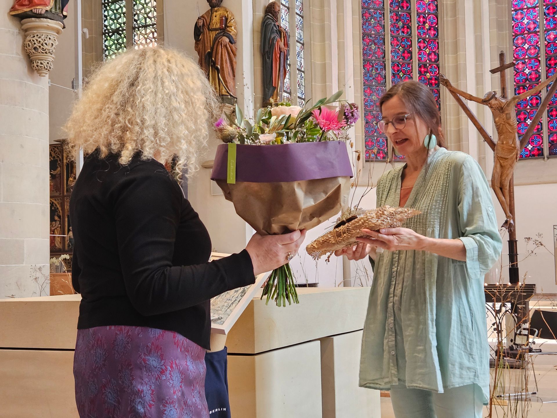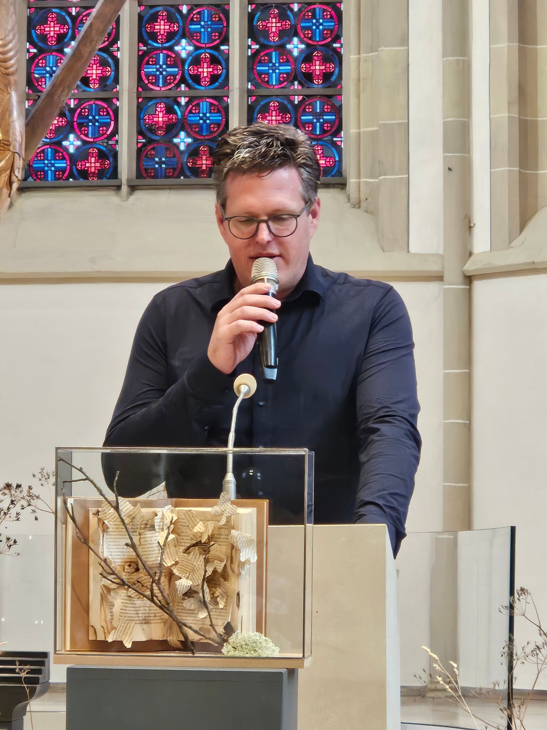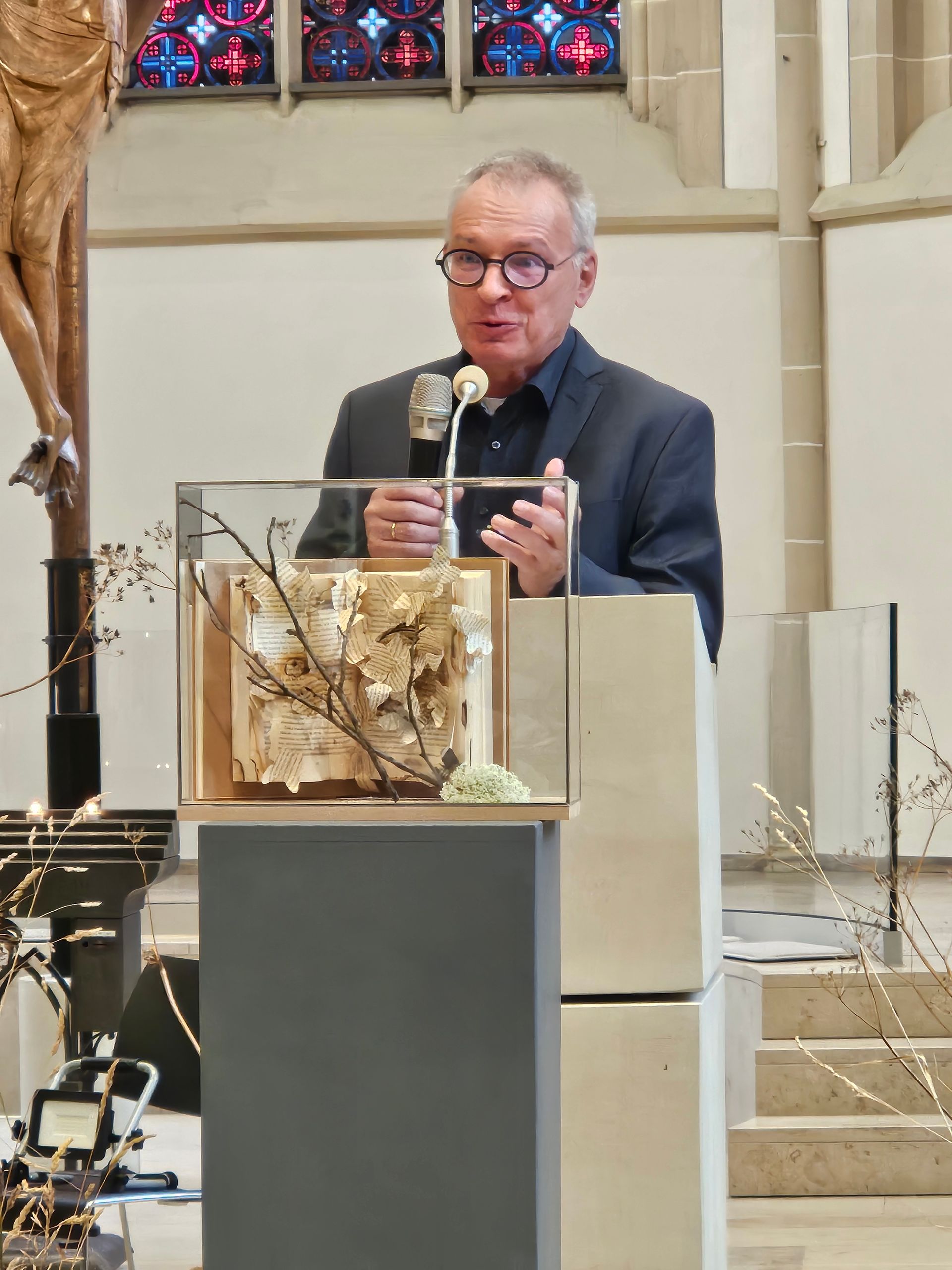 Johannes Gröger, Schulseelsorger am Berufskolleg St. Michael in Ahlen, bedankte sich für die gelungene Verbindung von Kunst und Liturgie, die Frau Dederichs Arbeit geprägt hatte und die bistumsweit und darüber hinaus viel Beachtung gefunden hätte. Beispielhaft nannte er die Aktion "Friedensbriefe", die Frau Dederichs anlässlich des Katholikentages in Münster im Jahr 2018 initiiert hatte.