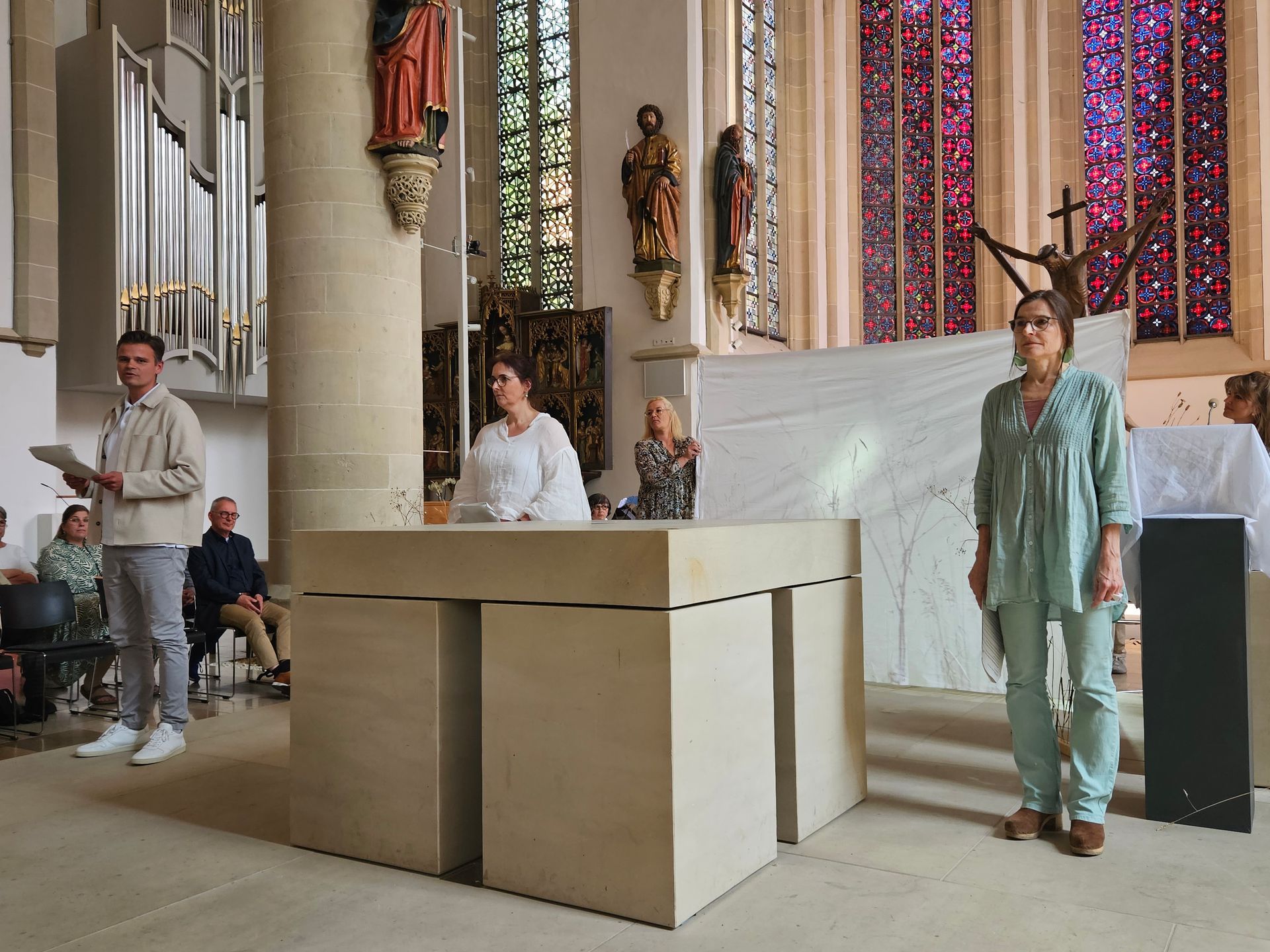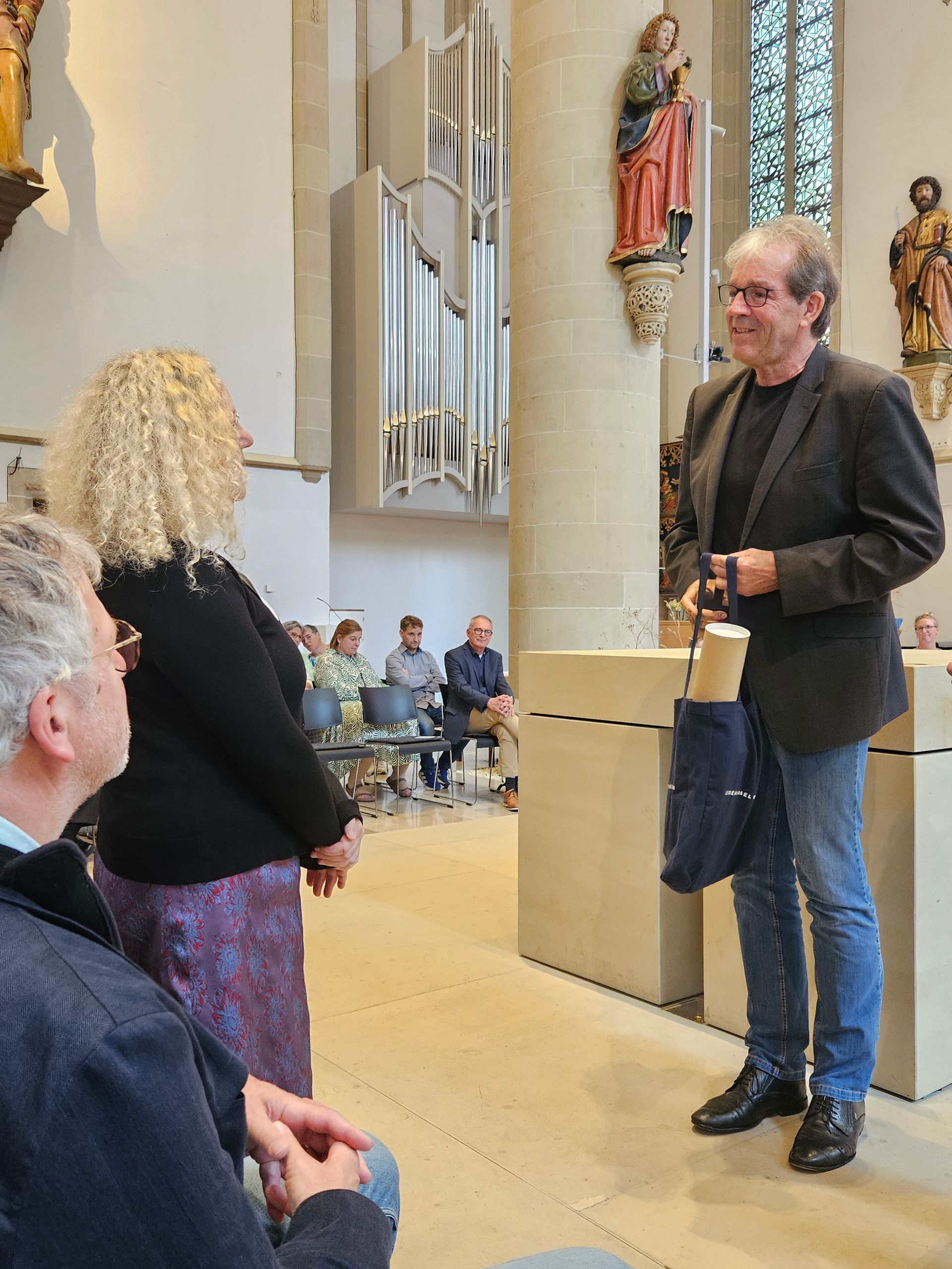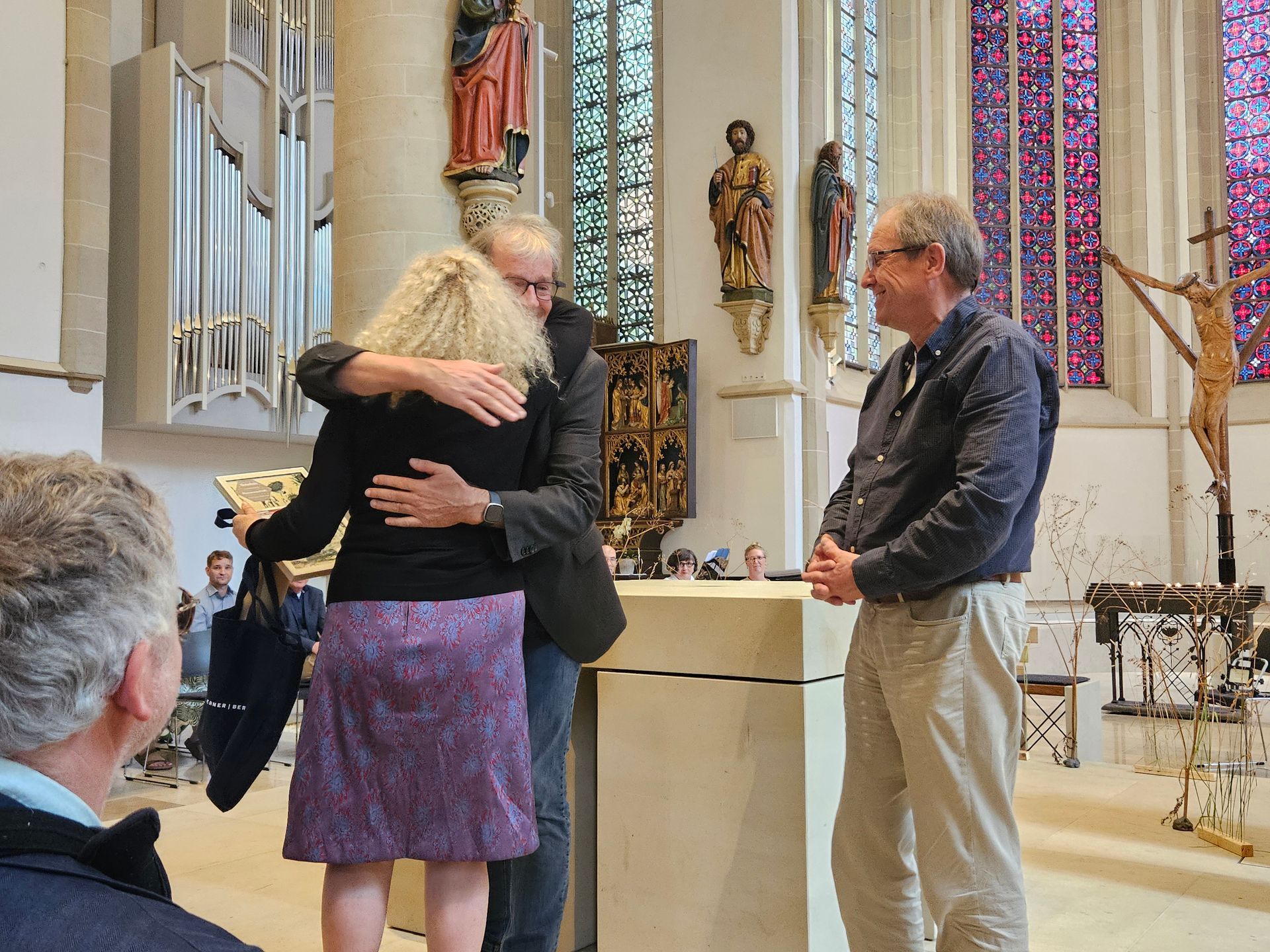 Johannes Gröger, Schulseelsorger am Berufskolleg St. Michael in Ahlen, bedankte sich für die gelungene Verbindung von Kunst und Liturgie, die Frau Dederichs Arbeit geprägt hatte und die bistumsweit und darüber hinaus viel Beachtung gefunden hätte. Beispielhaft nannte er die Aktion "Friedensbriefe", die Frau Dederichs anlässlich des Katholikentages in Münster im Jahr 2018 initiiert hatte.
