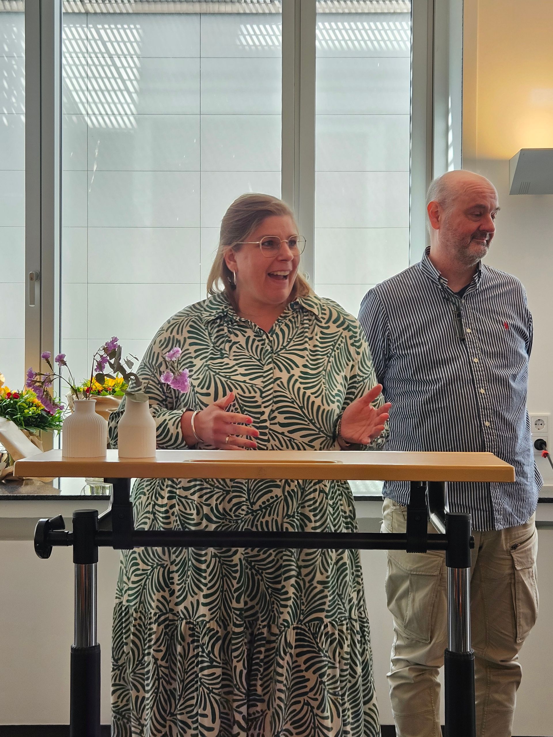 Als Vertreter der Fachschule für Sozialpädagogik überbrachten Herr Laing und Herr Weiland Abschiedsgeschenke und würdigte die kreative Arbeit, die Frau Dederichs in diesem Bildungsgang geleistet hatte.