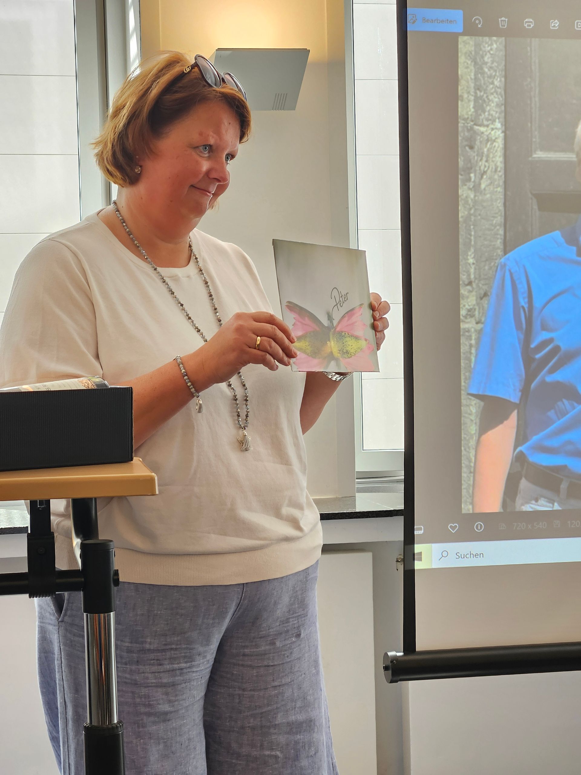 Frau Schulz als Stellvertreterin der Fachkonferenz Religion bedankte sich bei den drei Kolleg:innen, die alle das Fach kathalische Religion unterrichtet hatten, für die jahrelange Arbeit in den verschiedenen Bildungsgängen.
