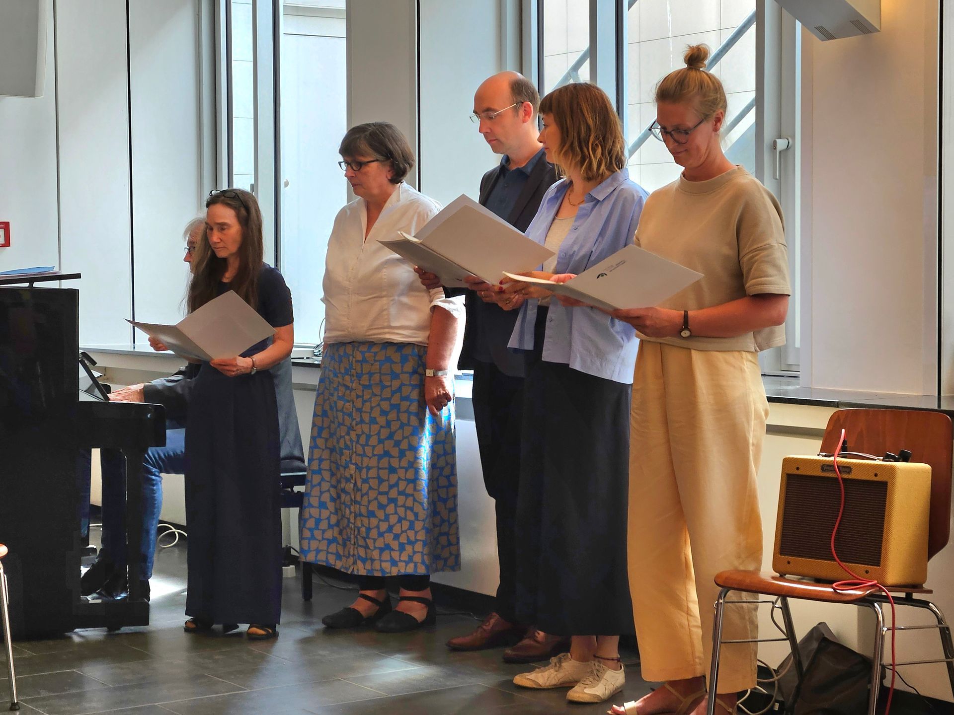 Es fogte ein Liedbeitrag ("Abide with me") von Frau Schleuter, Frau Rottenbücher, Frau Kiepe, Herrn Schier und Frau Hojenski (von links). Der Chor wurde von Herrn Laing am Klavier begleitet.